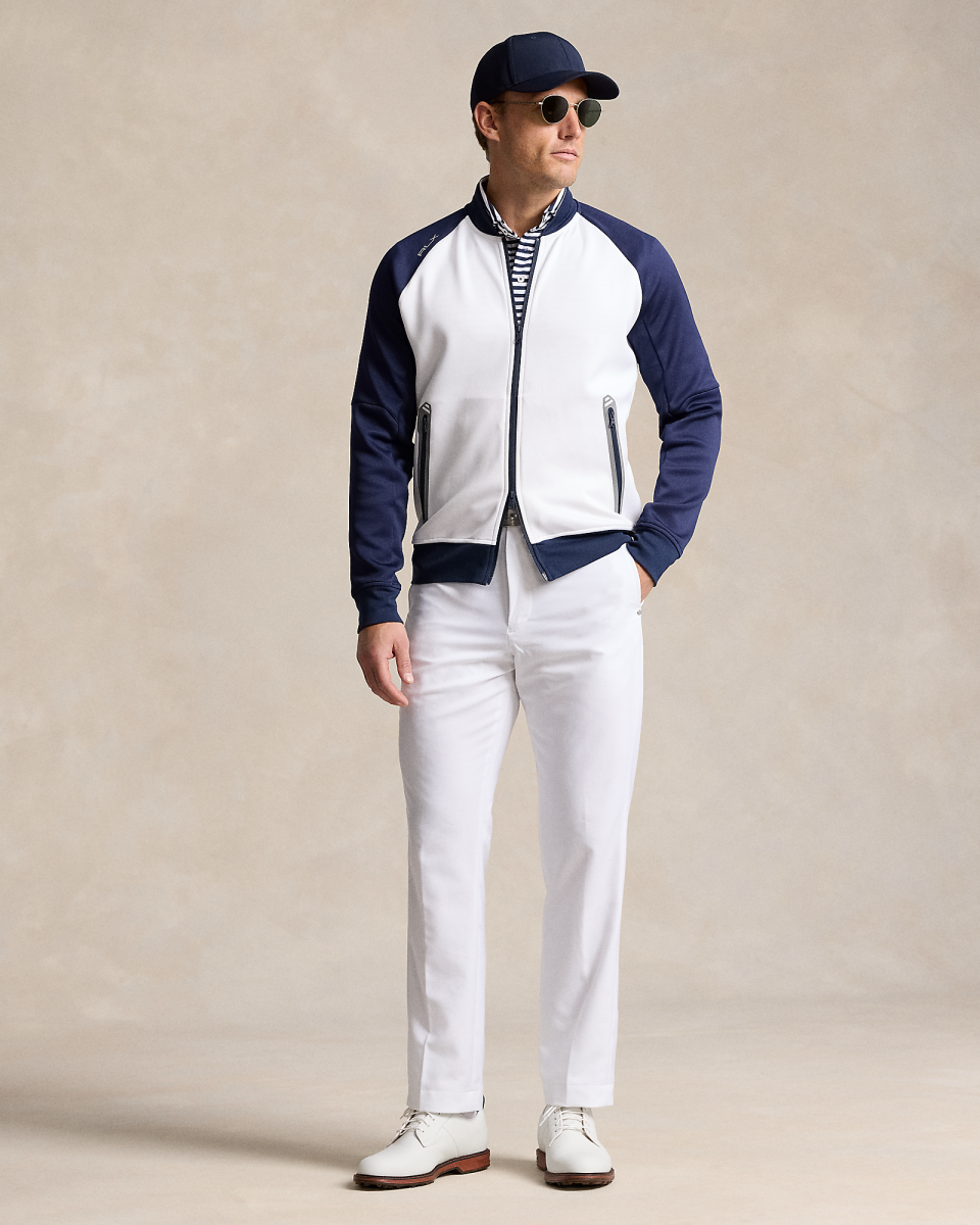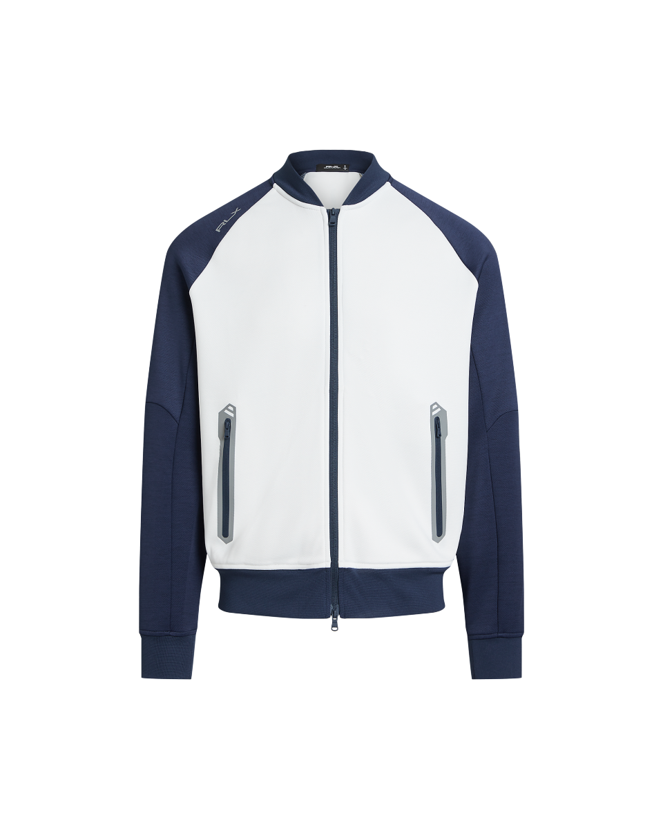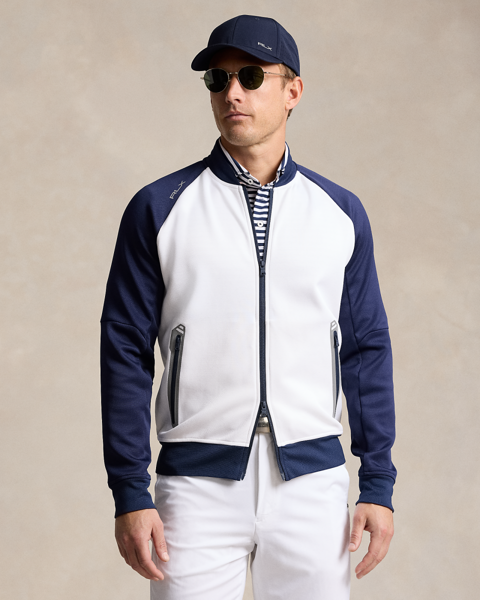本季这款全新夹克选用以再生聚酯纤维织就的弹力双面针织面料制成,呈现考究的珠地纹理,内侧经磨毛处理