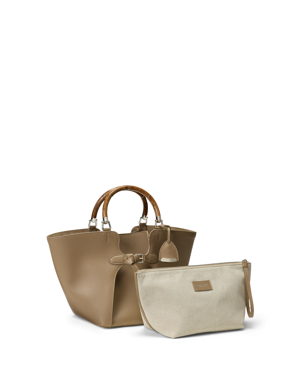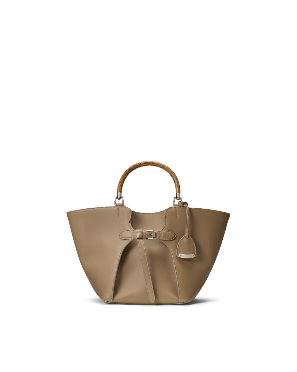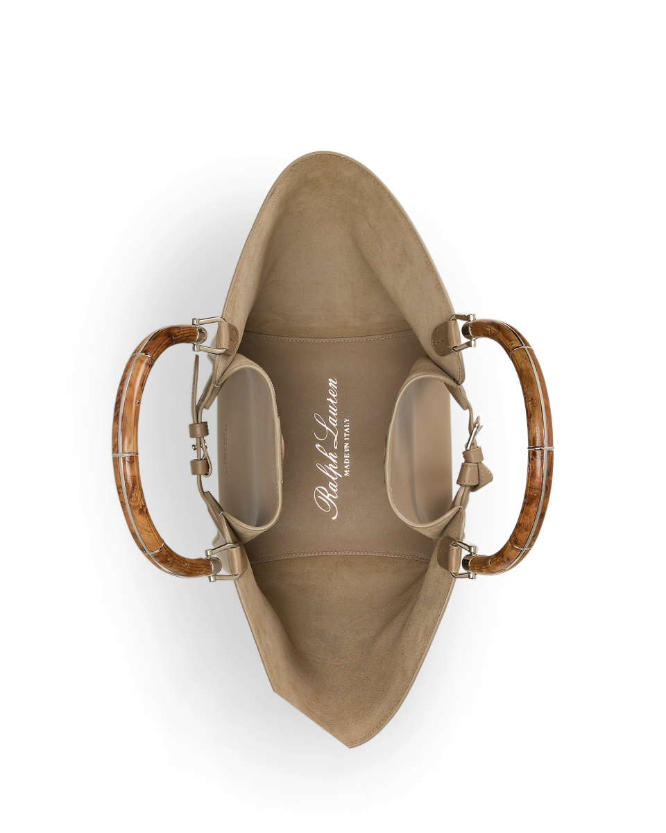 Ralph Lauren 全新 Ralph 包袋系列从汽车设计的雅致细节中汲取灵感,通过 2025 年春季时装秀发布,展现精炼工艺,Ralph 托特包采用两个雕刻的光滑树节木和金属顶部手柄(饰有别样的纹理图案)、可拆卸牛皮革肩带、饰有 Ralph Lauren 雕刻字样金属牌的牛皮革钥匙包等一系列考究细节,体现了标志性 Ralph Lauren 造型细节元素,这种元素已经成为了 Lauren 先生个人及我们品牌风格的代名词,这款托特包选用柔软的全粒面牛皮革制成,内置可拆卸帆布小袋,便于收纳和整理,做工考究,尽显低调雅致质感