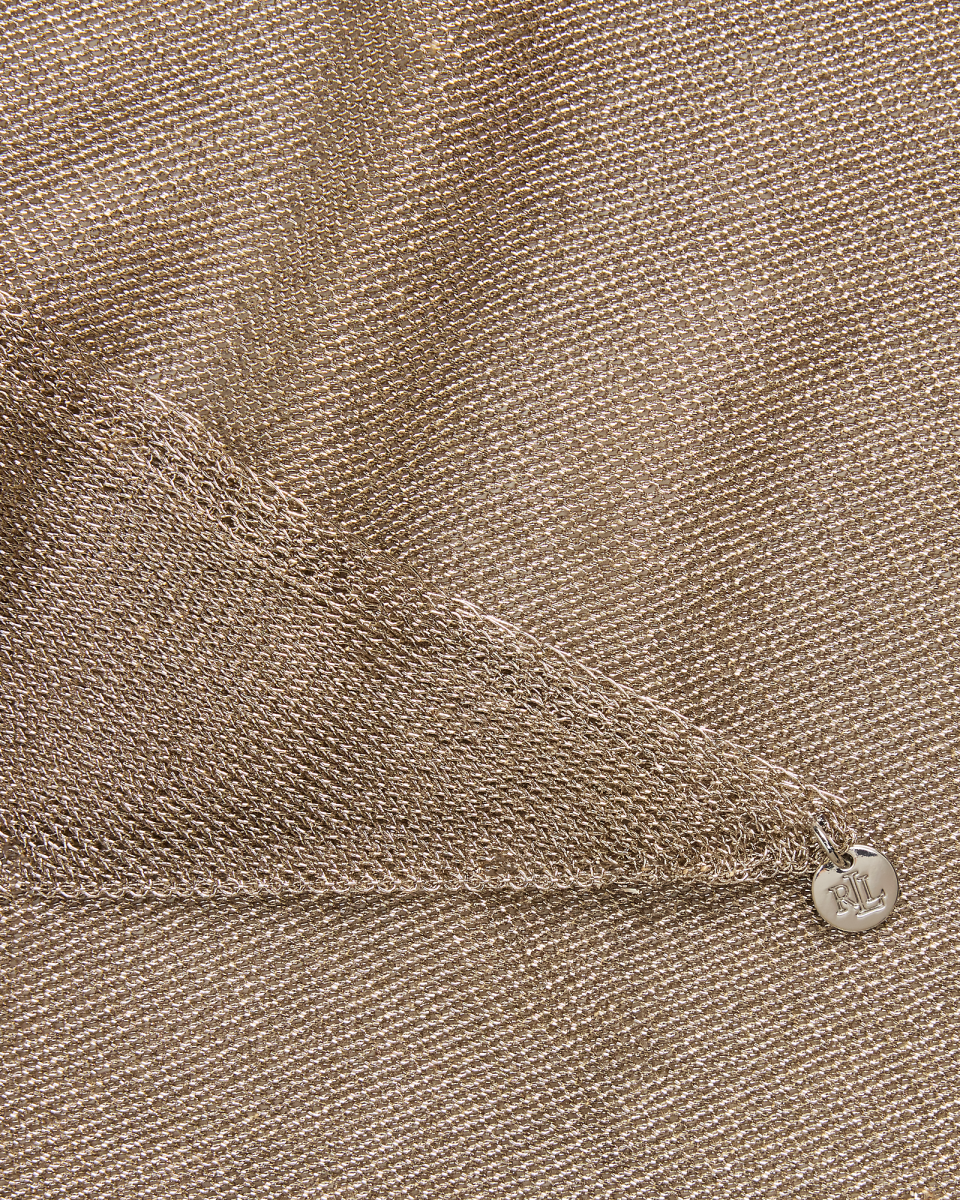 这款菱形围巾选用柔软的针织面料制成,散发金属光泽,一角饰有刻着 LRL 字样的金属吊饰,彰显标志性风格