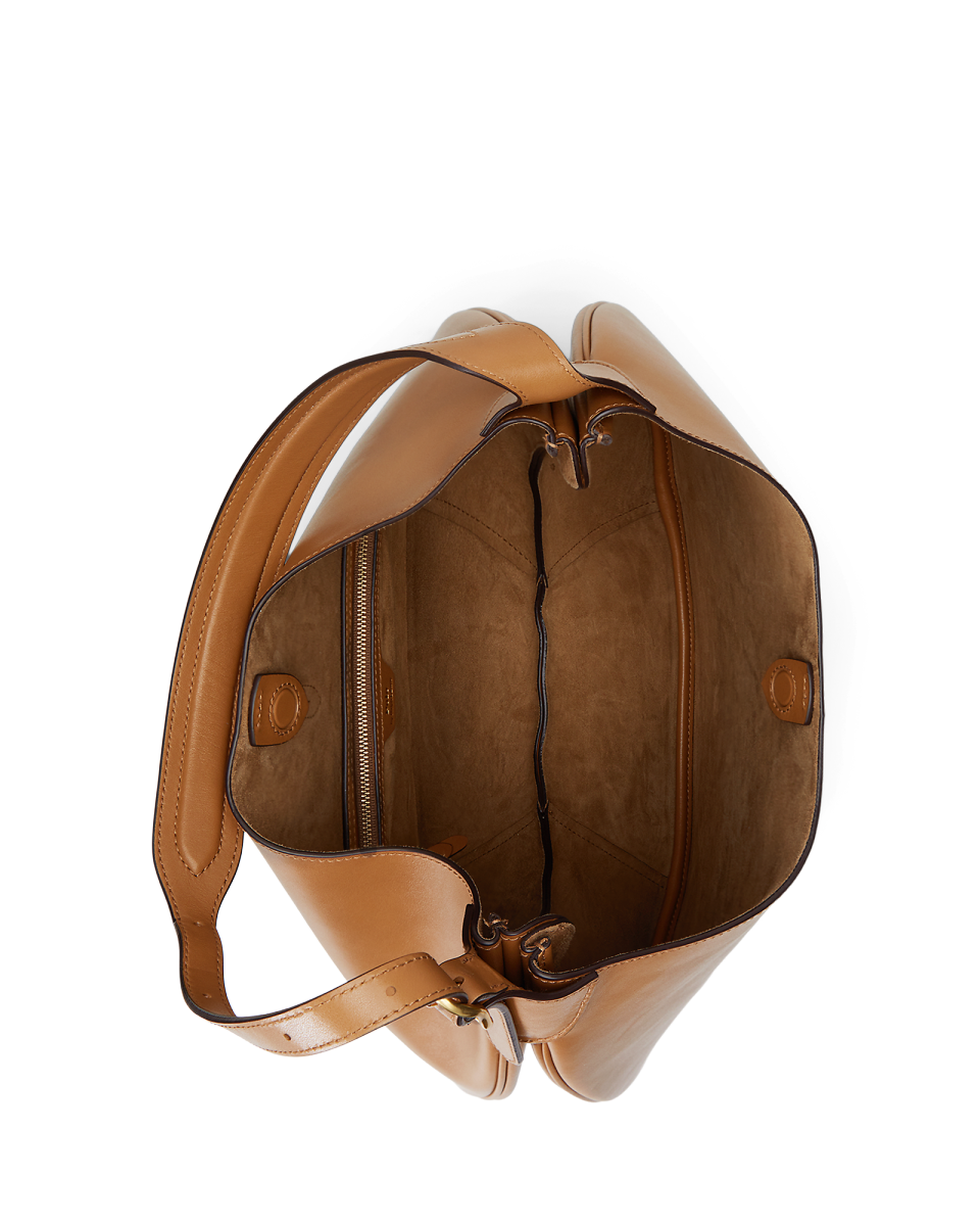 Polo ID 系列配有优雅时尚的金属五金件,五金件饰有标志性小马轮廓,洋溢着欢乐气息,彰显 Polo Ralph Lauren 的传统特色和珍贵之物世代相传的永恒精神,这款皮革单肩包专为女性设计,确保活动自如,采用宽敞的双隔层马鞍廓形,彰显考究的马术风格