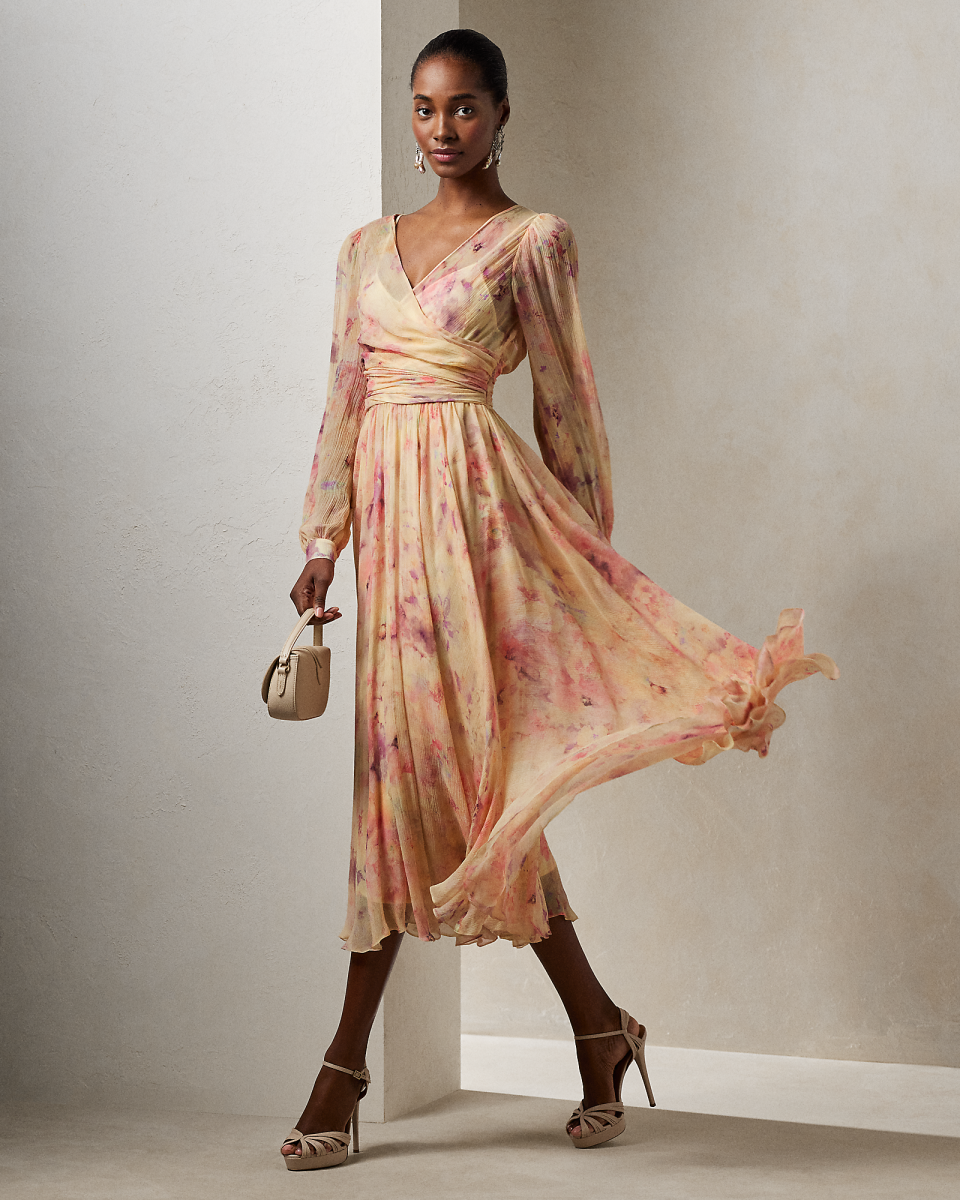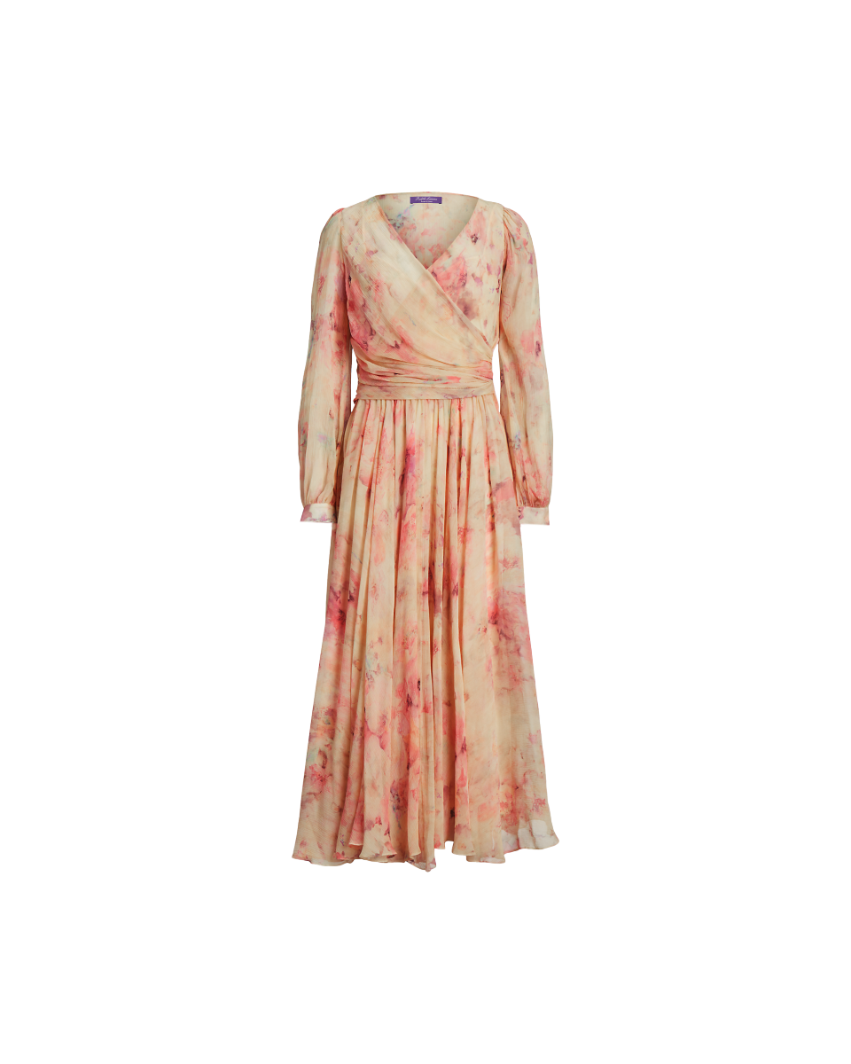 这款 Skielar 连衣裙灵感源自传统芭蕾舞裙,采用裹身式结构上身、雅致缩褶、长袖与蓬松飘逸下裙等一系列考究细节,选用褶皱桑蚕丝雪纺绸面料于意大利制成,质感轻盈,纹理细腻,饰有由意大利科莫一家闻名工厂印制的本季流行花卉图案,该图案源自我们内部一位设计师创作的牡丹花园浪漫水彩画