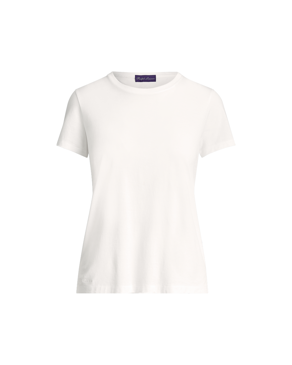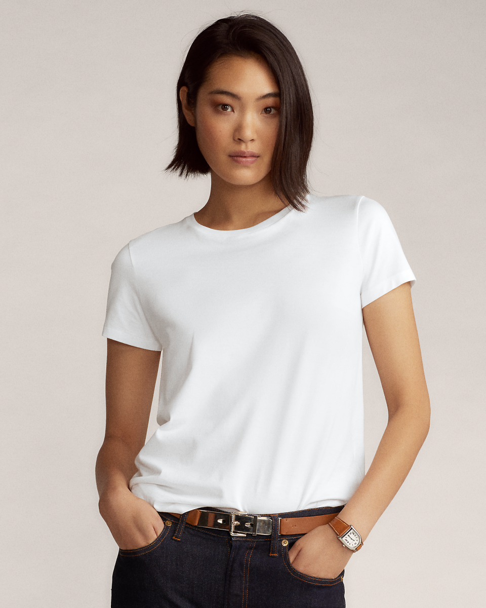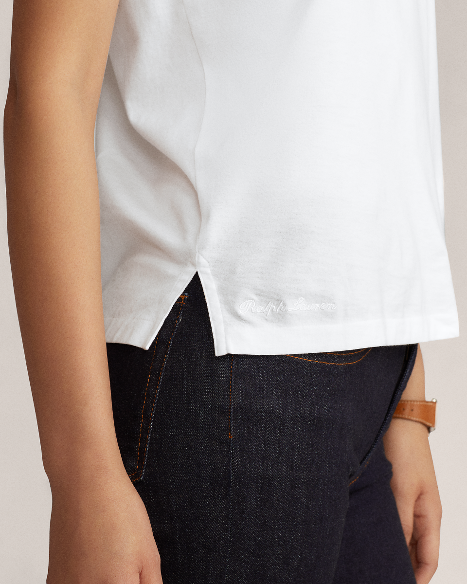 Ralph Lauren 在基本款 T 恤的基础上华丽升级,选用经过烧焦除去毛边的棉,呈现干净、富有光泽的手感,并设计有 Ralph Lauren 字样刺绣
