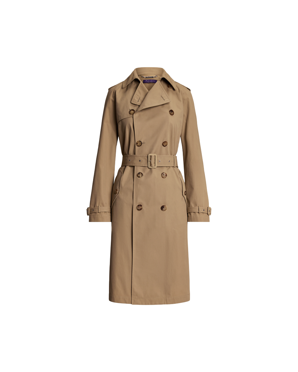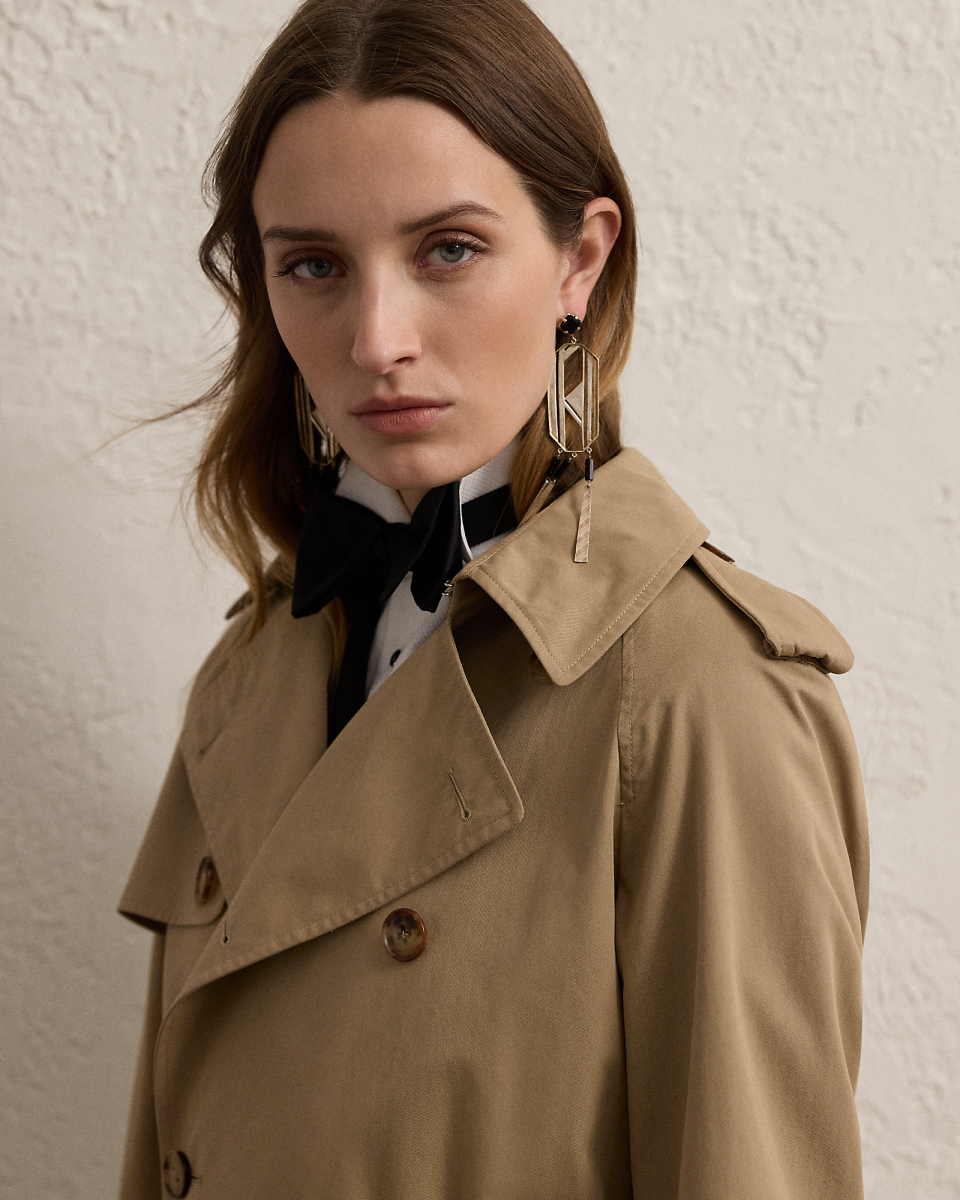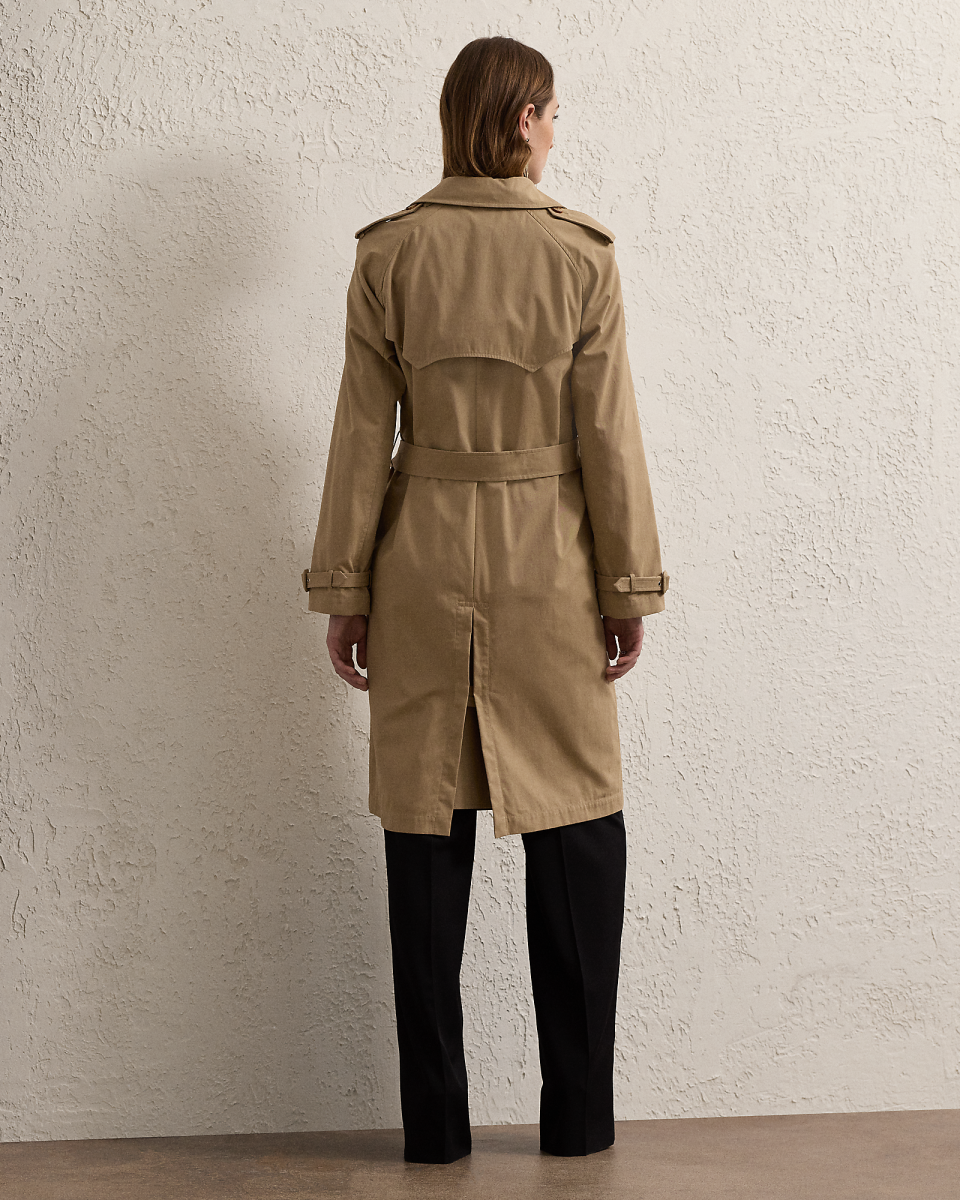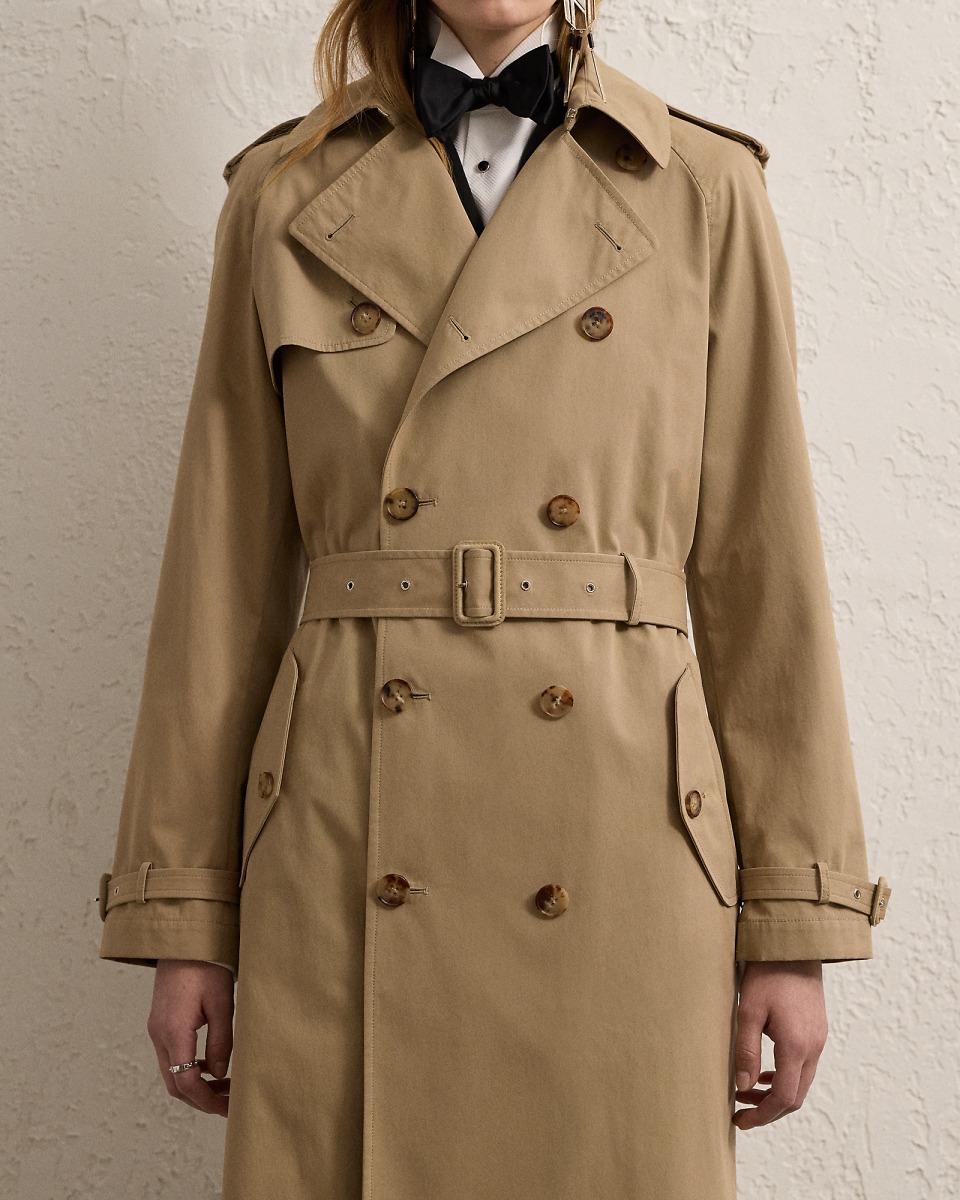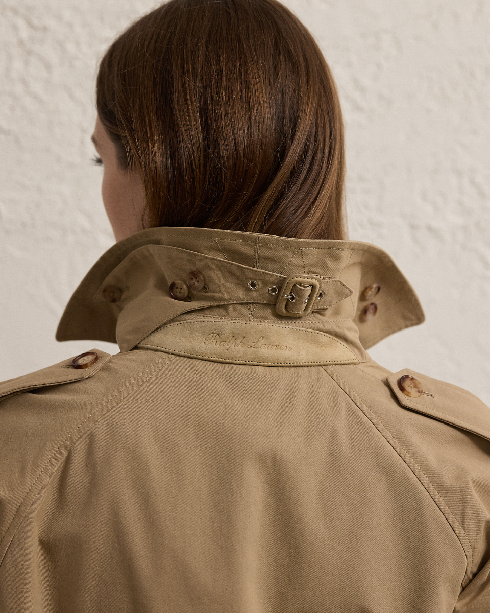 这款 Niles 风衣选用舒适的斜纹布面料于意大利制成,呈现柔软干爽的手感;采用纽扣式肩章、风雪挡片、束带衣领、腰带、双排扣廓形等传统风衣细节,搭配仿角质纽扣与绒面羊绒面革包面搭扣,底领饰有凹纹徽标,为经典设计增添考究格调