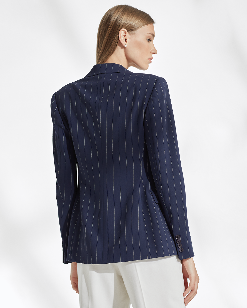 仿照经典男装的女装廓形是 Ralph Lauren 的标志性设计元素,而 Skylar 夹克堪称此类典范。这款夹克采用经典版型剪裁而成,选用条纹斜纹布,呈现轻盈的质感和优雅的垂感