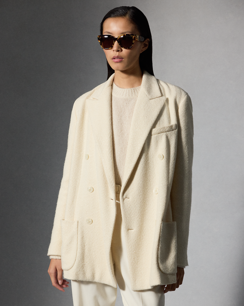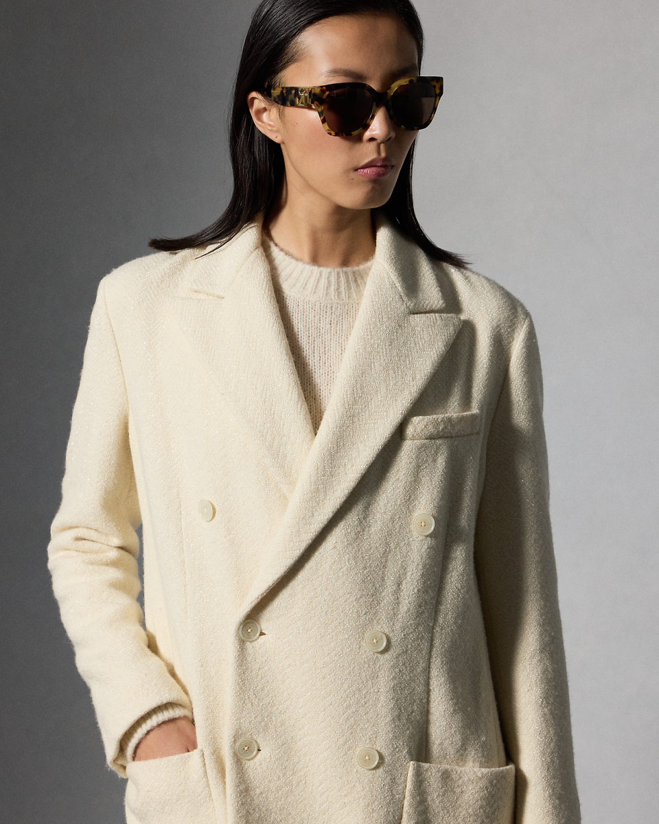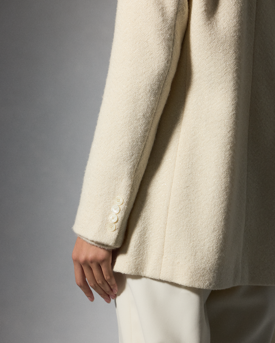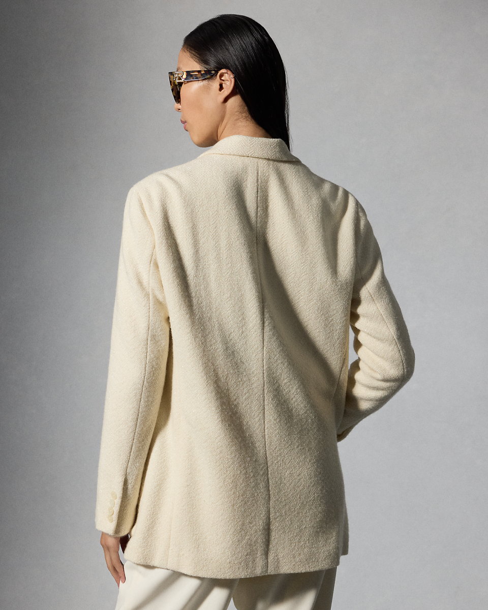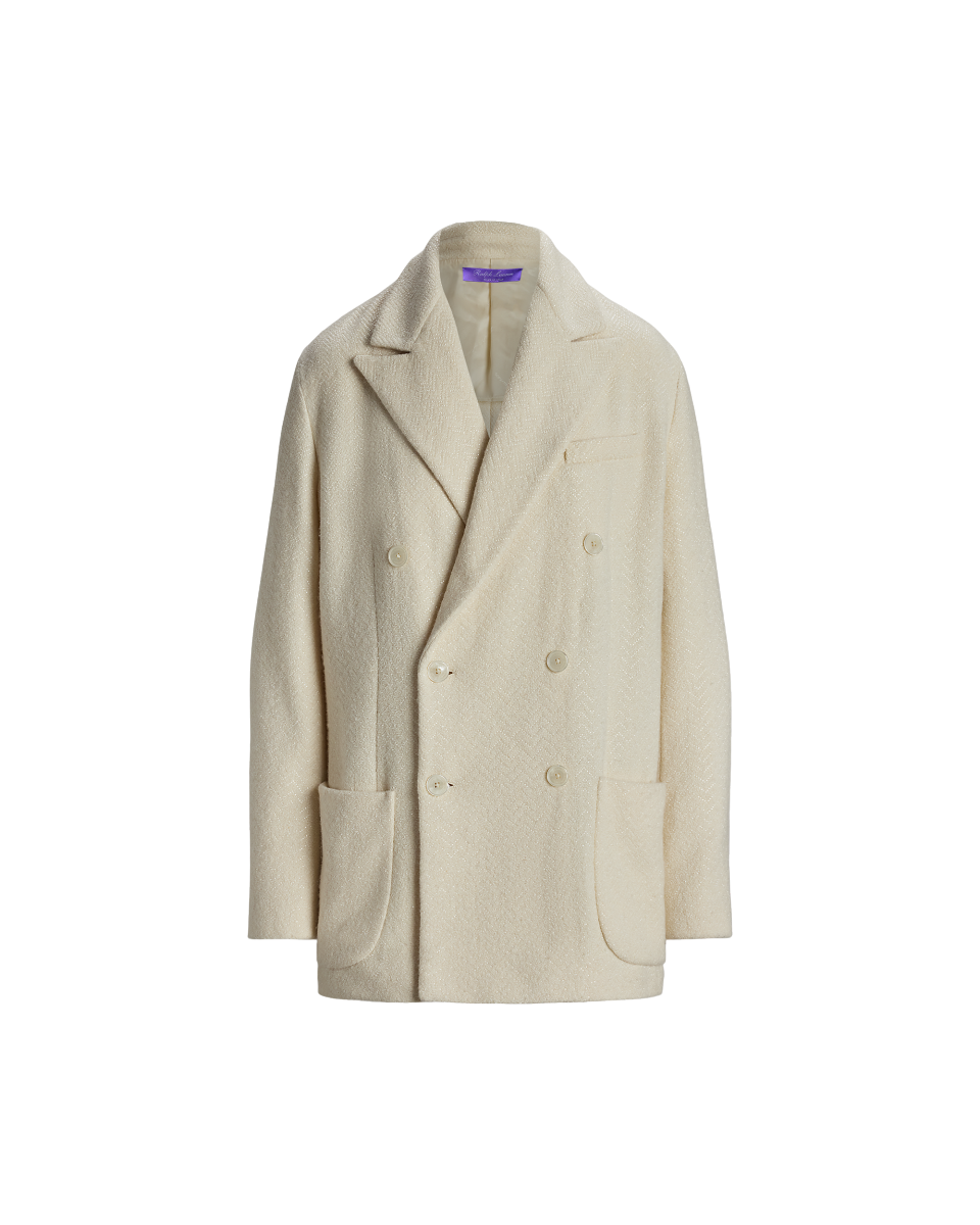 这款 Shirlee 夹克灵感源自男装,采用双排扣开合,搭配贴袋与尖角翻领,由五位训练有素的工匠采用热固刺绣工艺,在夹克上刺绣了总计 67, 680 颗玻璃装饰,每颗装饰均经过精心排布,呈现面料的人字斜纹图案,搭配刻有 Ralph Lauren 字样的珠母贝纽扣,为整体造型锦上添花