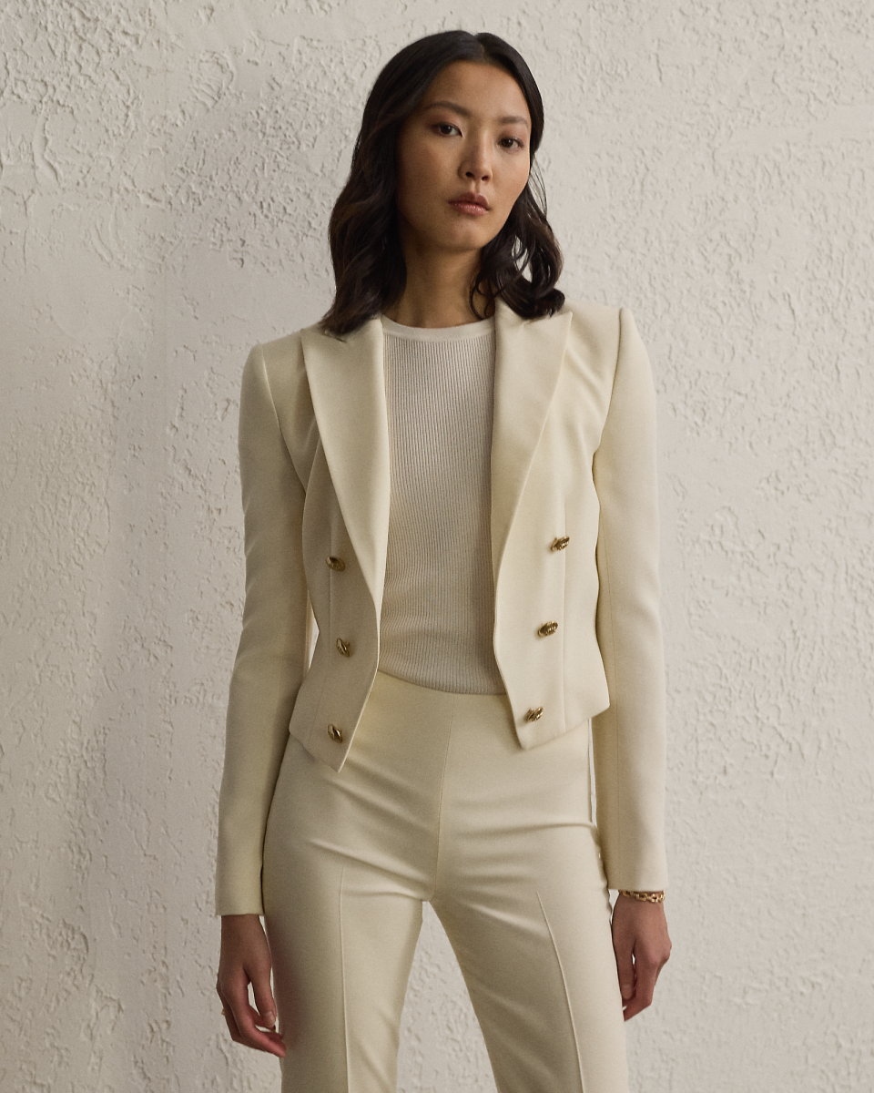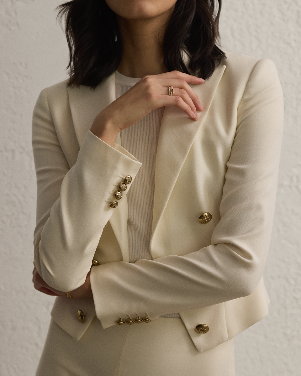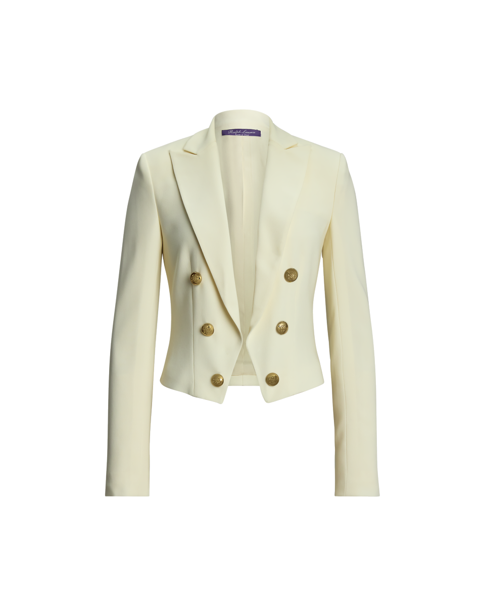 这款 Spencer 礼服外套灵感源自 Ricky Lauren 的一件私人礼服外套,采用时尚的短款版型和双排扣廓形,搭配尖角翻领,选用以高度捻合的羊毛绉纱于意大利织就,具有时尚的垂坠感、轻盈的质感及舒适的弹力,搭配饰有 Ralph Lauren 压花字样字母组合的抛光纽扣