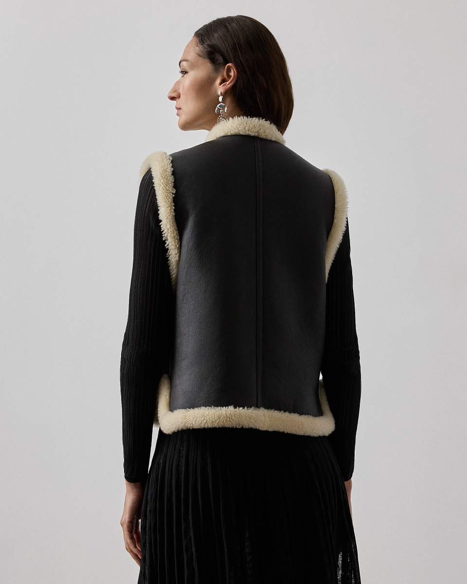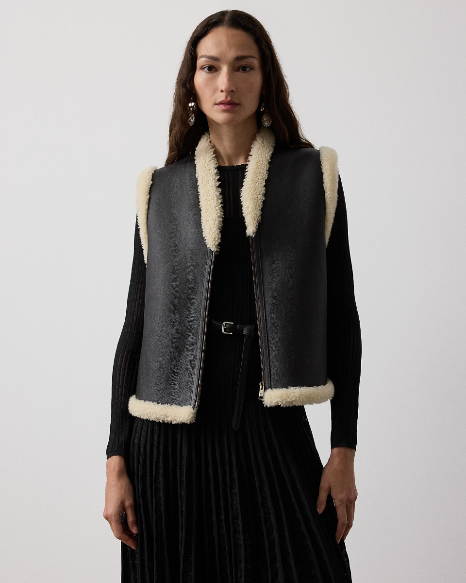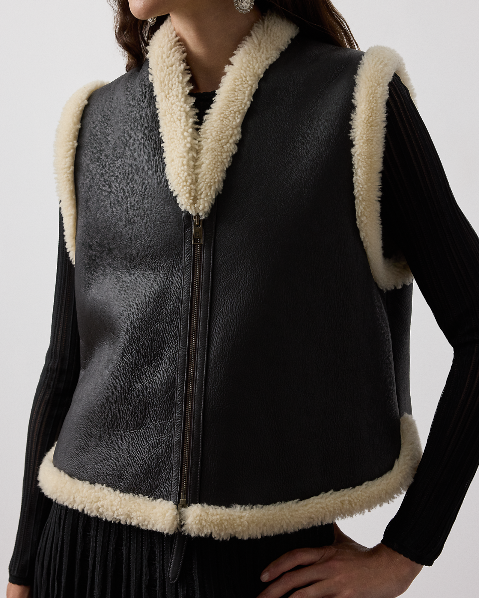 这款 Tamlin 马甲灵感源自经典复古款式,选用卷曲的羔羊毛羊皮制成,采用时尚的双色设计,内层为奶油色,外层为深棕色羔羊毛羊皮,正面采用全拉链,搭配标志性五金件,便于打造各种造型