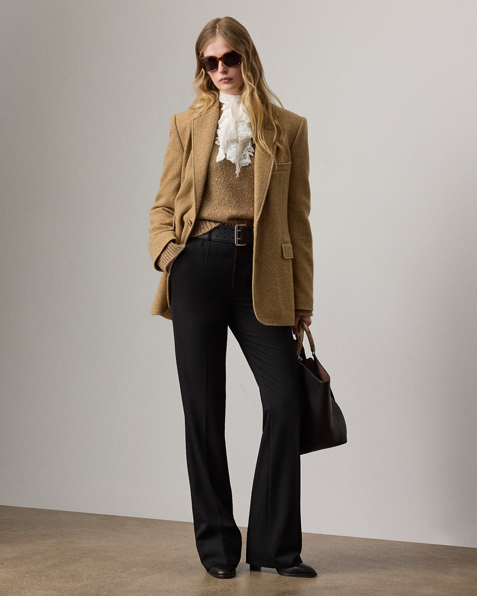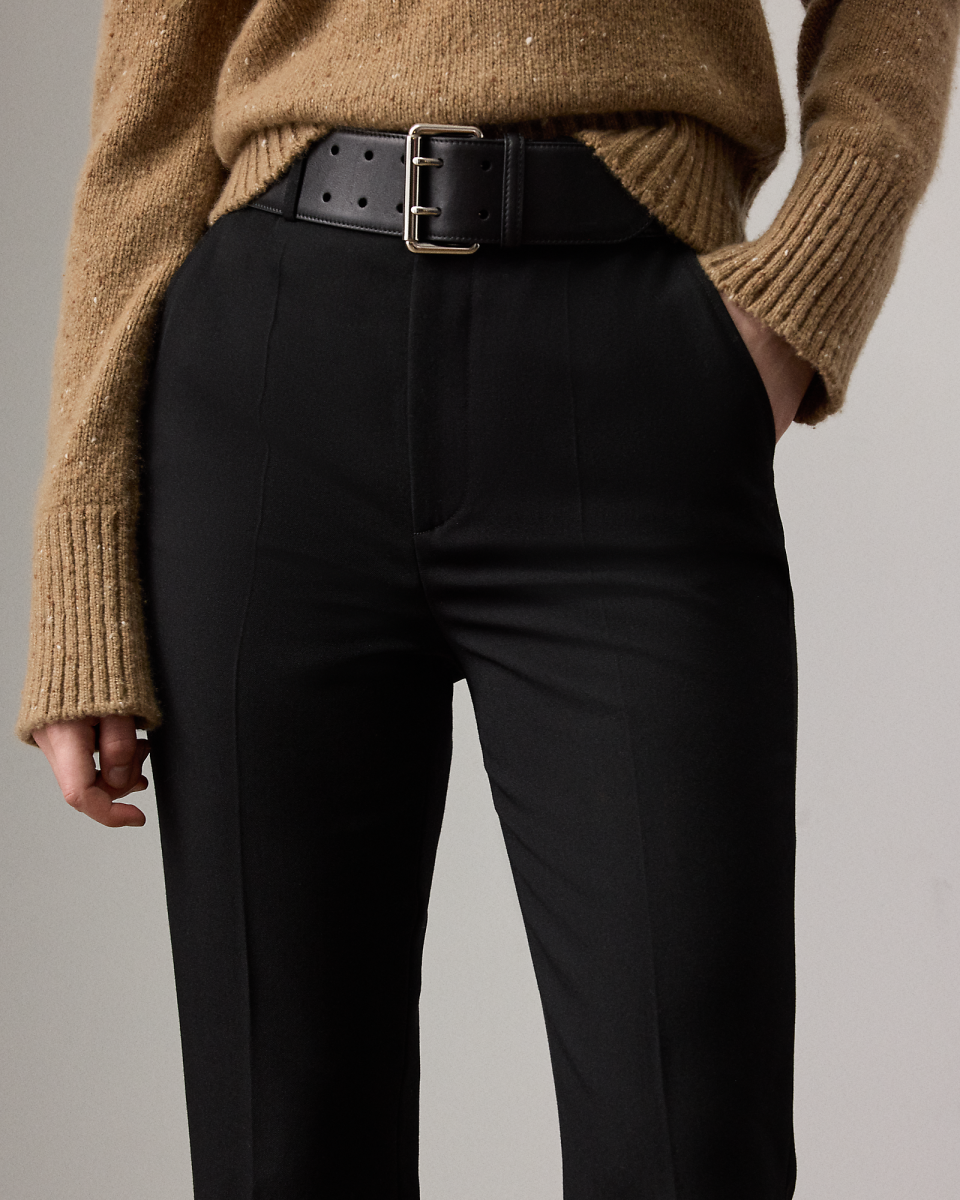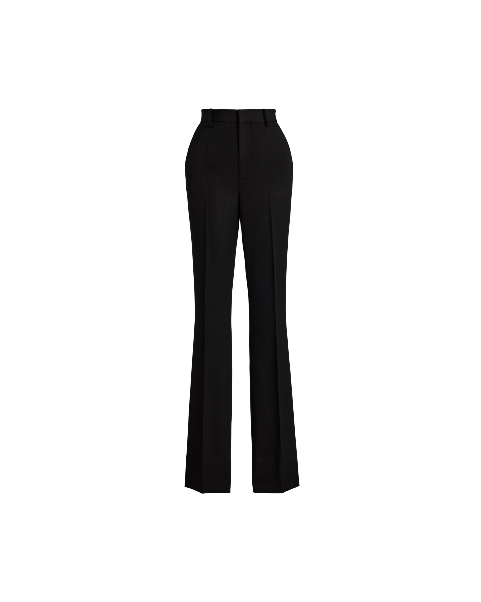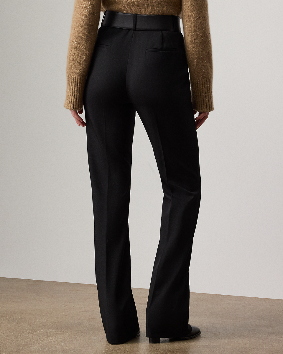 这款 Wrigley 长裤采用中腰设计和考究的微喇廓形,选用本季经典的羊毛面料制成,该面料以高捻度细羊毛纱线梭织而成,外观利落,手感挺括而柔软,饰有时尚的裤腿褶痕和背面腰部缝褶,增添雅致魅力