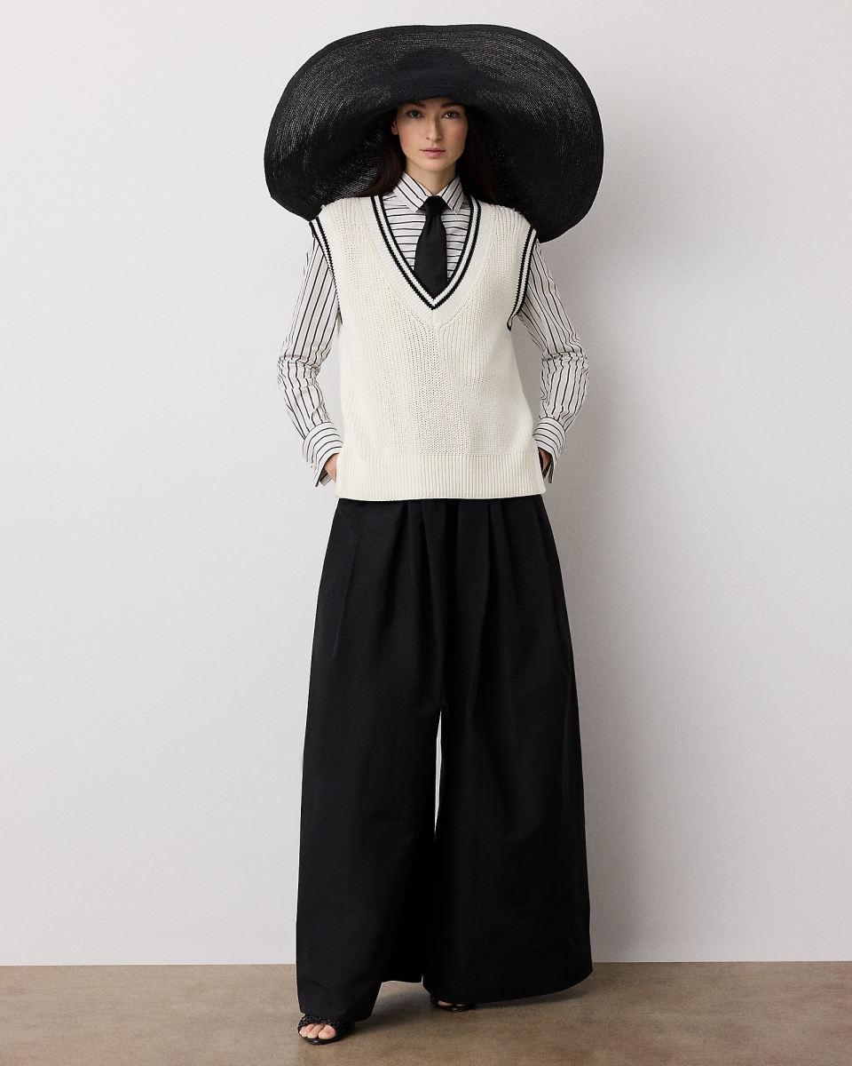 这款线条流畅的时尚 Vannesa 长裤采用高腰设计和个性的阔腿廓形,是 Ralph Lauren 对经典单品的焕新演绎,选用舒适的面料制成,轻盈挺括,较显蓬松,柔软透气,饰有从裤腰延伸至裤脚的优雅褶裥