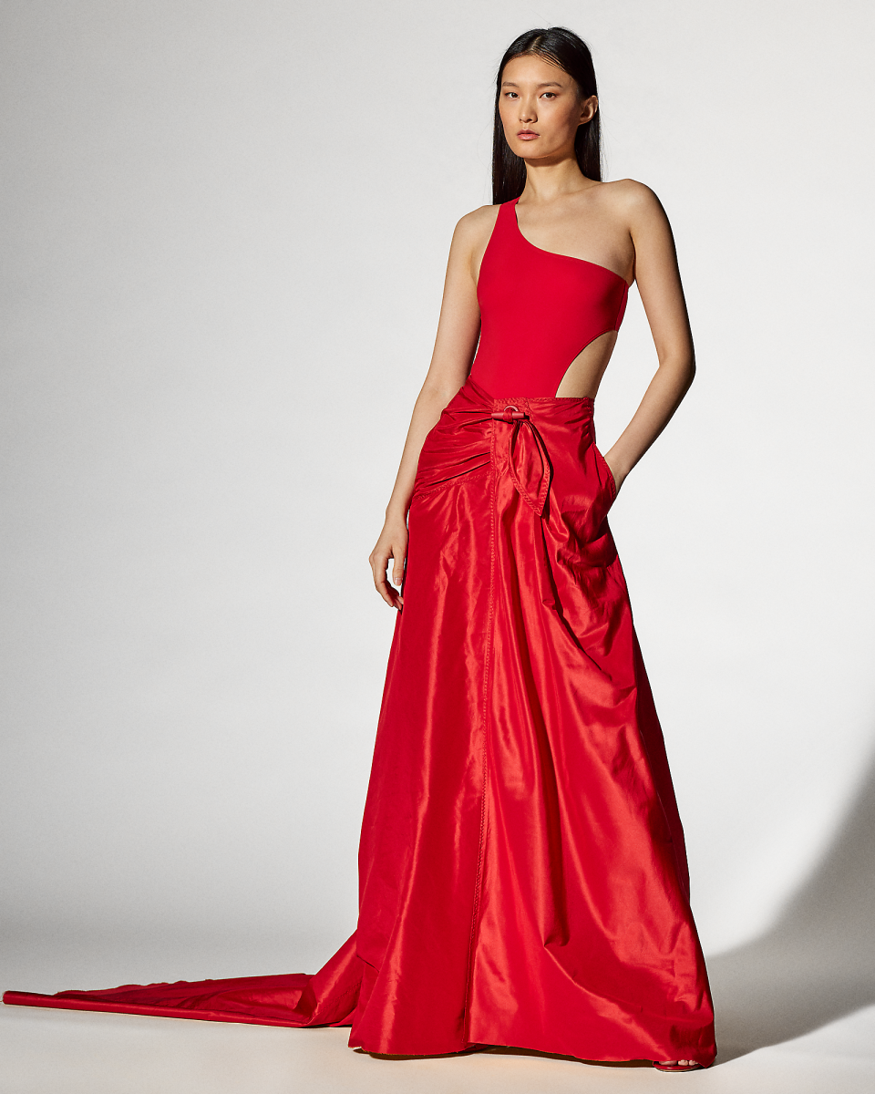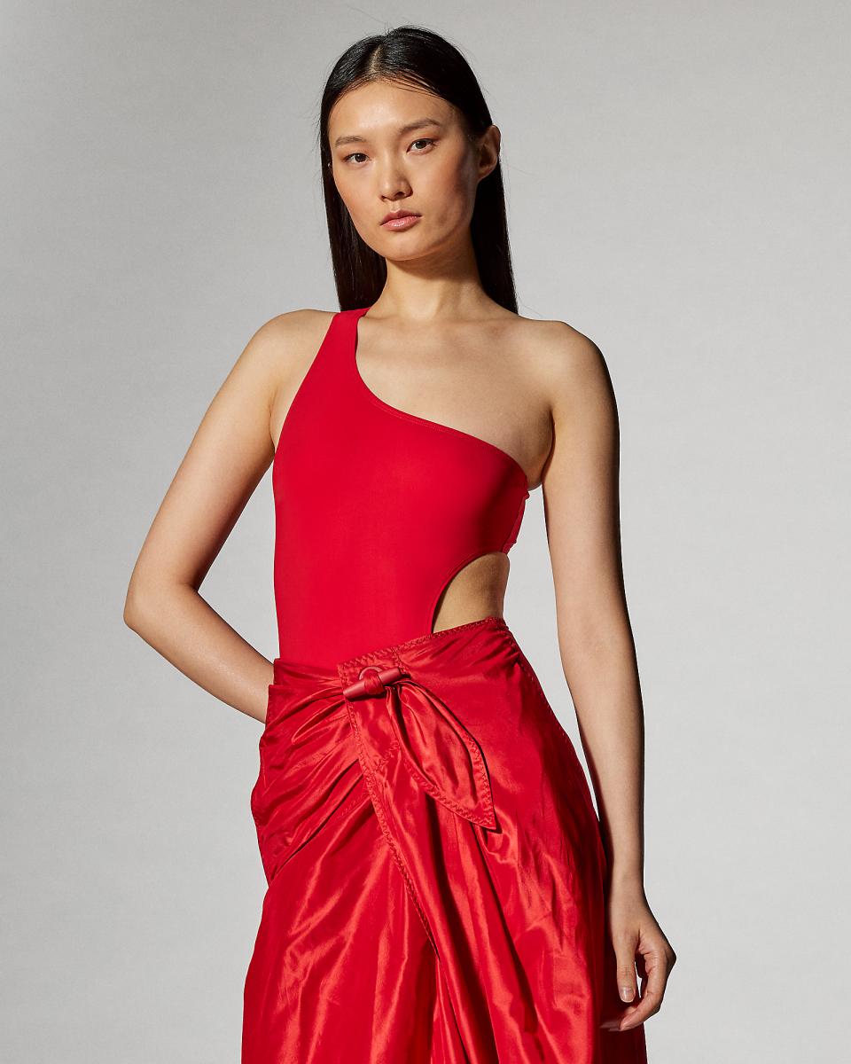 这款 Carsin 连体衣选用本季轻盈的空气层面料于意大利制成,兼具实用功能与雅致风格。该面料是一种双向弹力织物,拥有舒适质感和顺滑手感,可修饰身形。曾在 Ralph Lauren 2023 年春夏系列秀场上展出,采用单肩廓形,搭配华丽的镂空细节,下摆以简易的按扣式开合固定,是一款迷人的常备单品