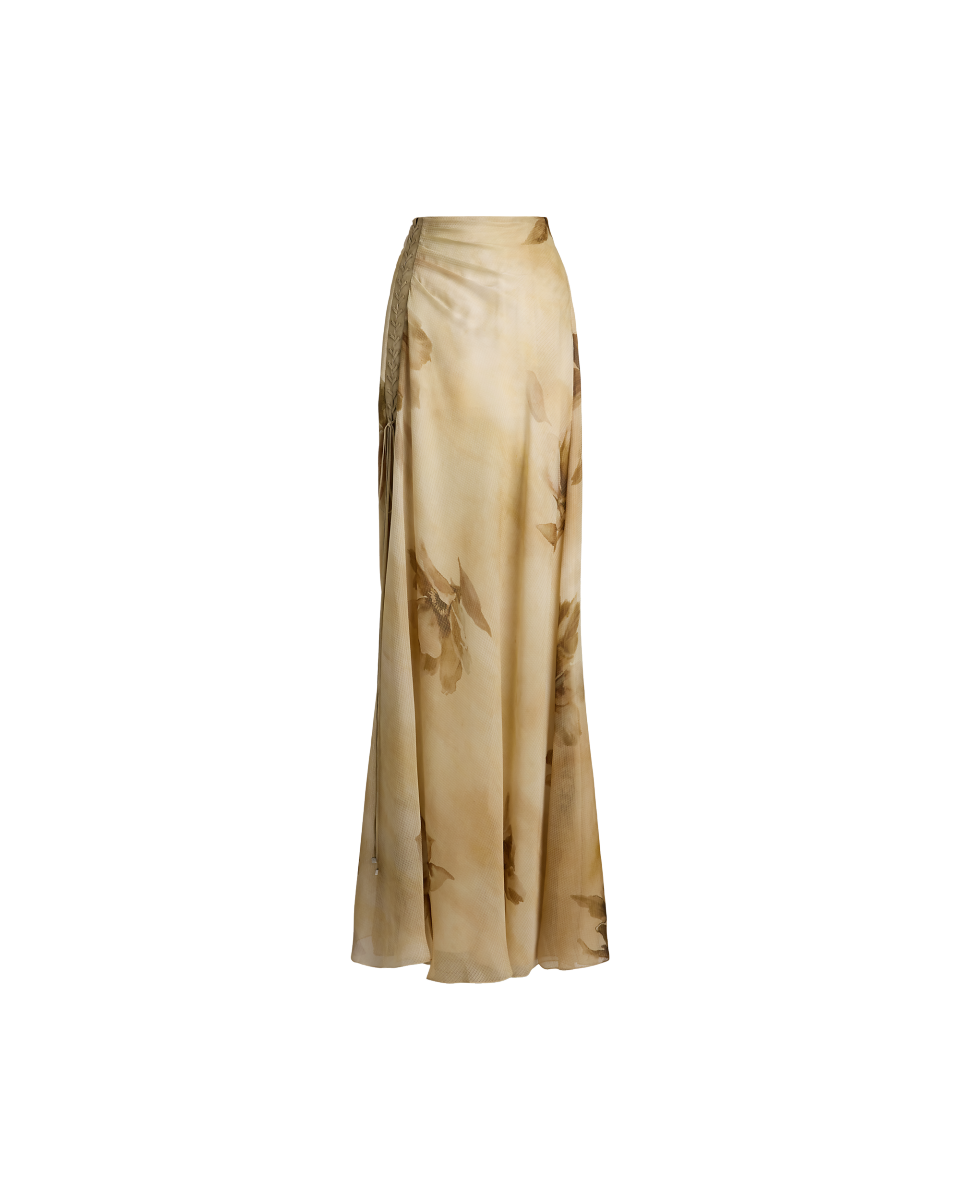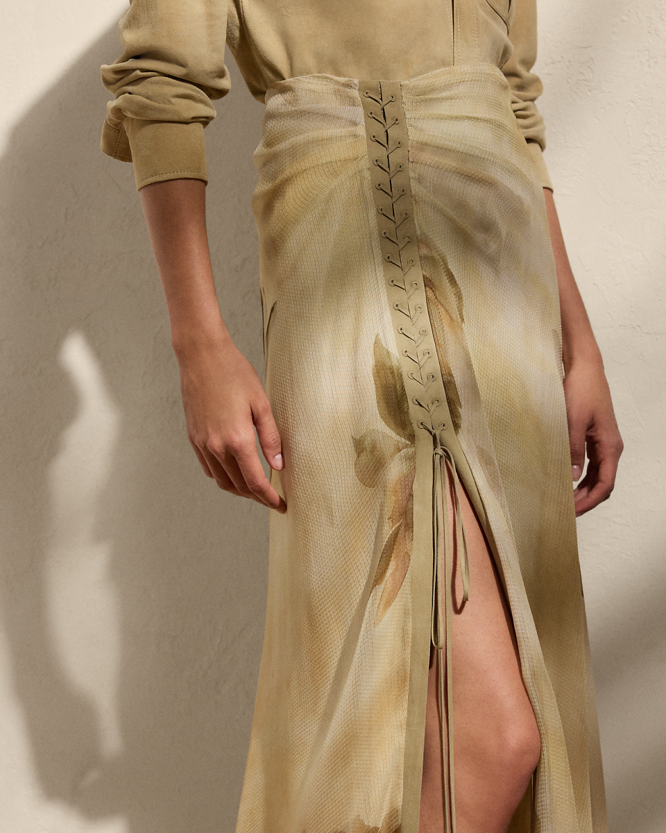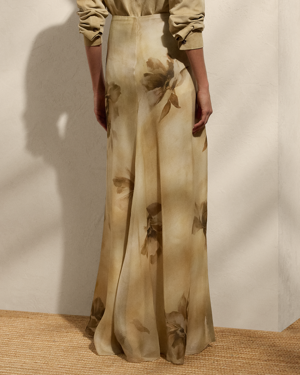 这款 Odera 晚宴半身裙选用薄纱面料制成,印有本季流行的梦幻花卉图案,该图案源自 Ralph Lauren 一位技艺高超的艺术家创作的水彩画,采用固定褶饰和羊绒面革系带式门襟,门襟沿着侧面延伸至裙摆开衩,确保活动自如