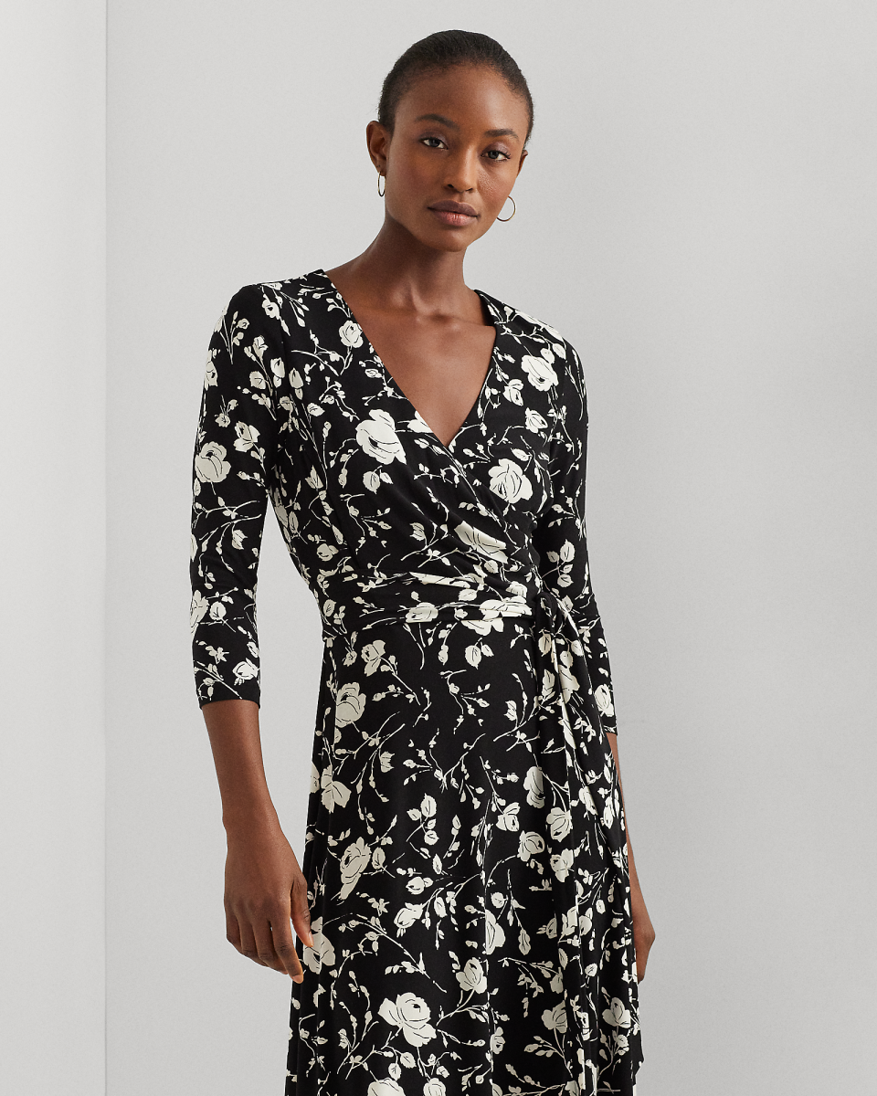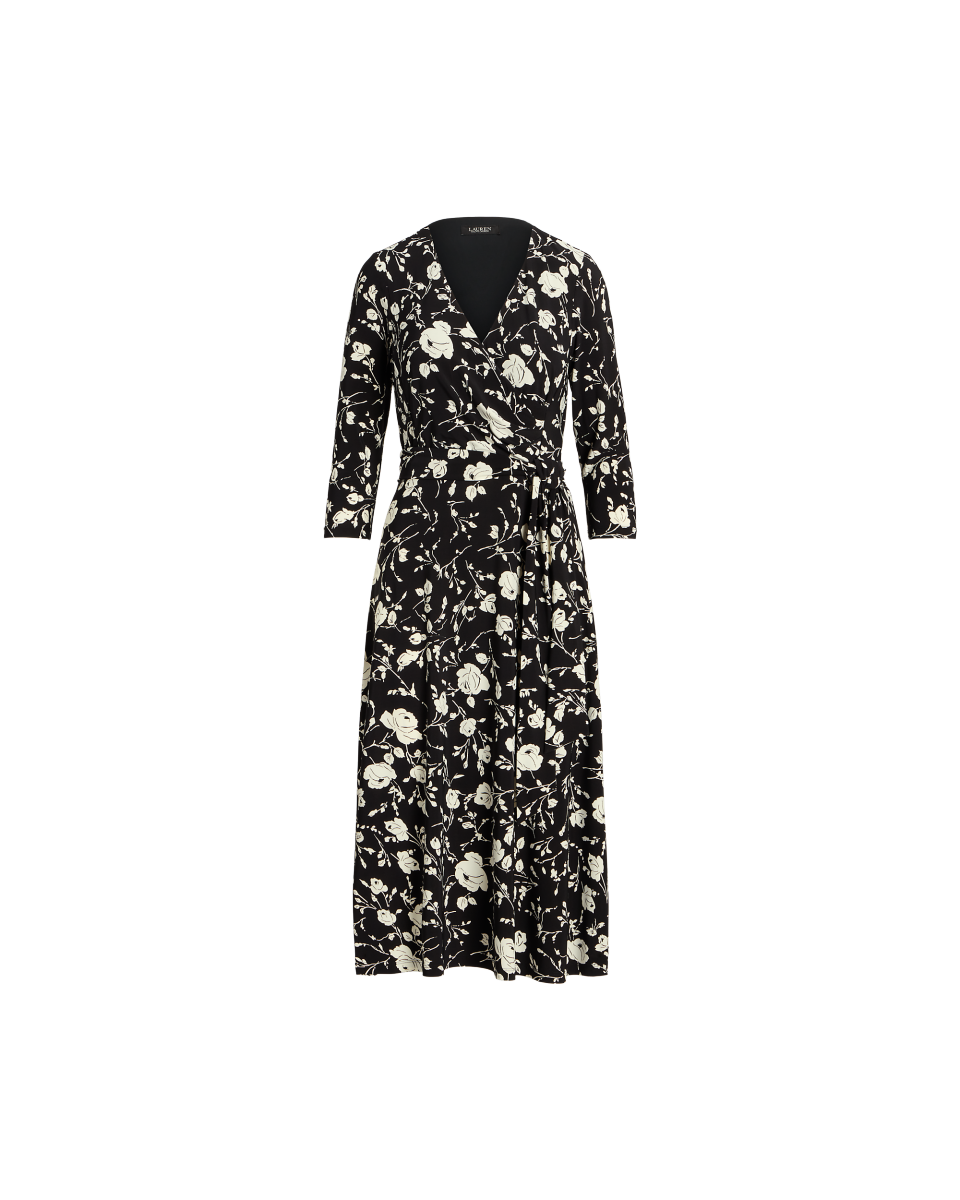 这款斜襟连衣裙长度过膝,饰有本季流行的双色玫瑰印花,彰显浪漫情调,采用平纹针织结构,确保穿着舒适和活动自如,搭配同种面料腰带,可突显腰部的自然线条