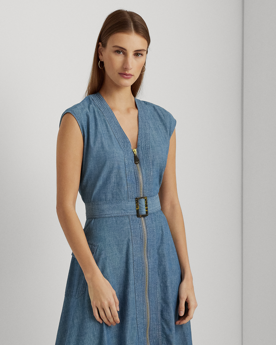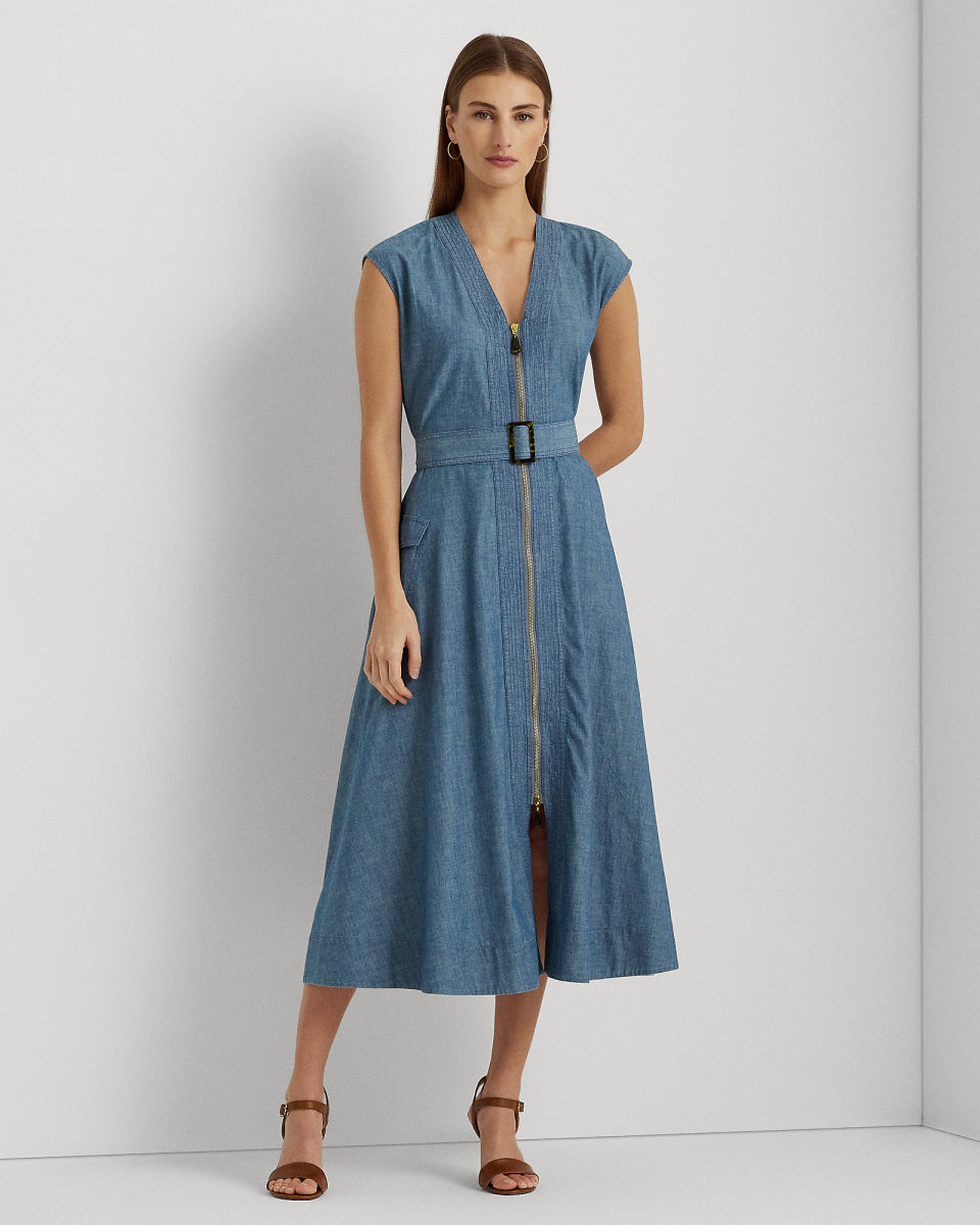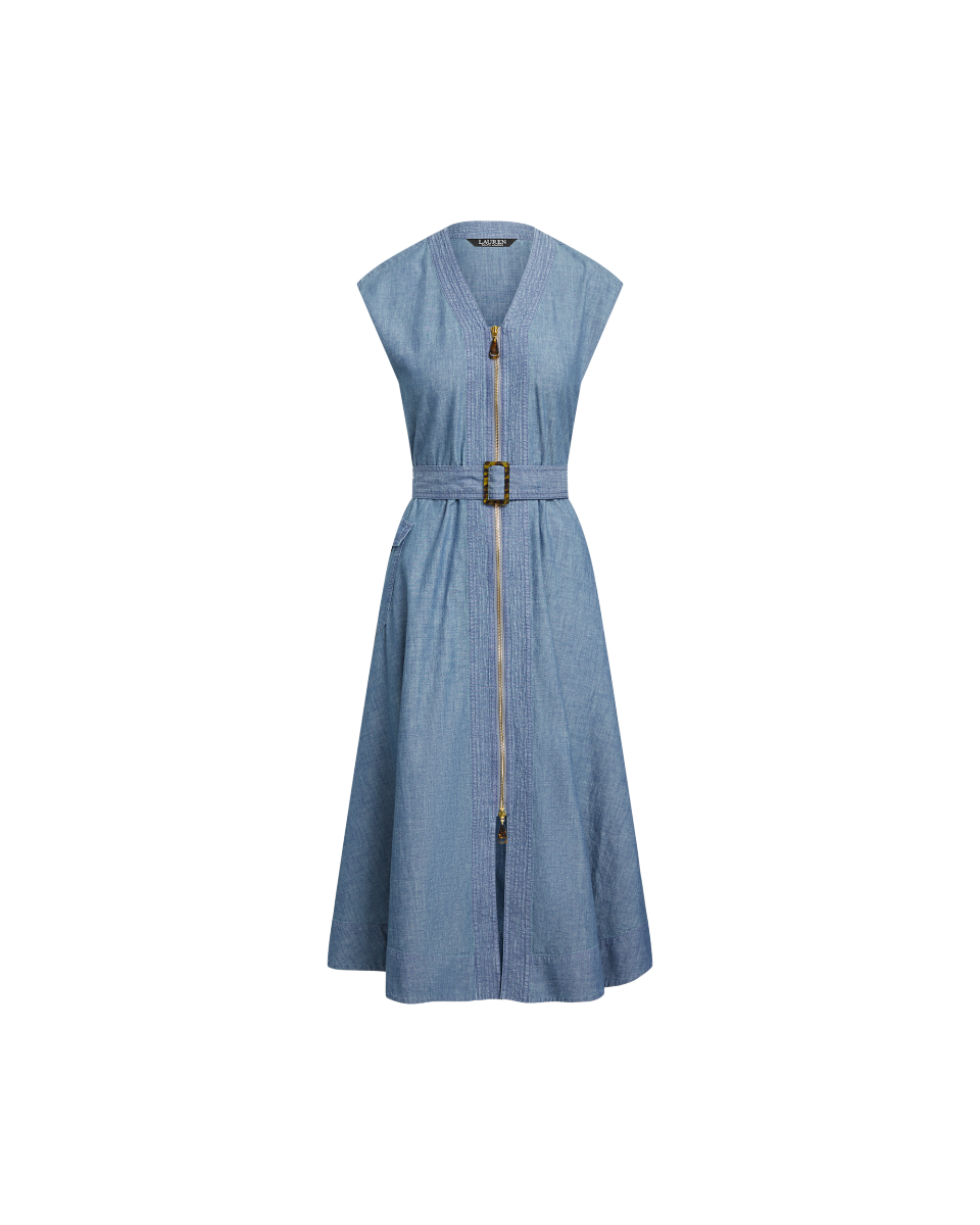 配腰带棉质牛仔布连衣裙