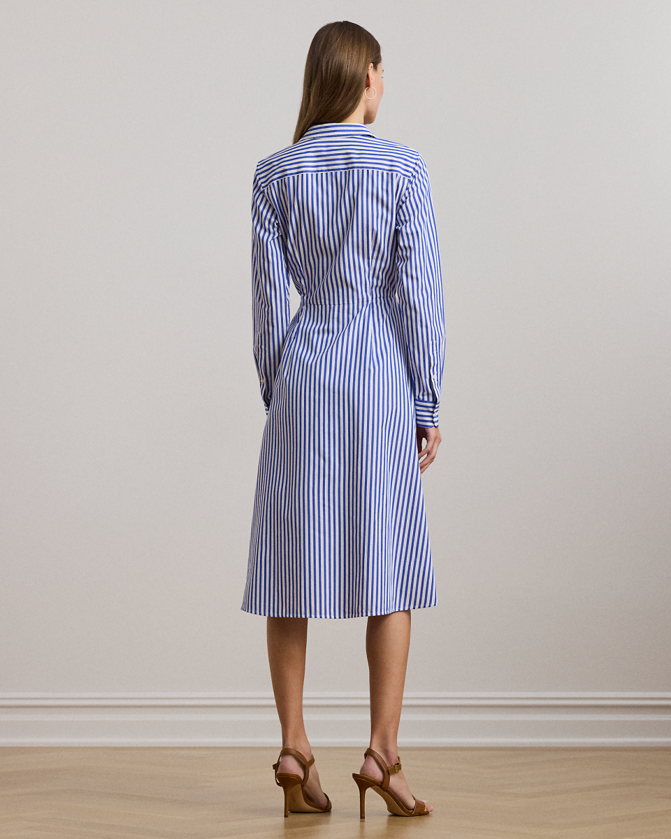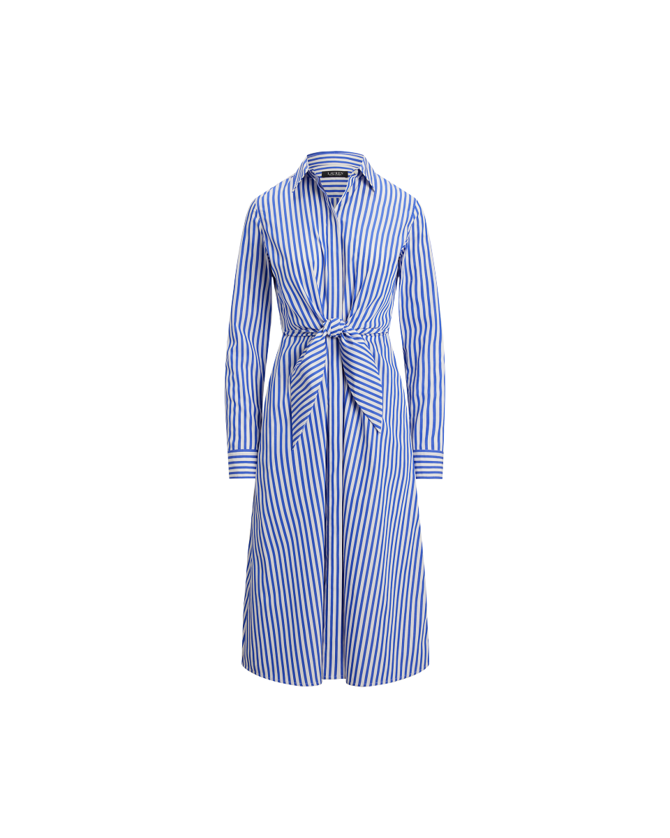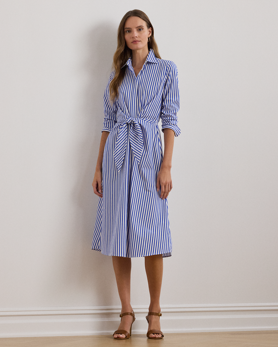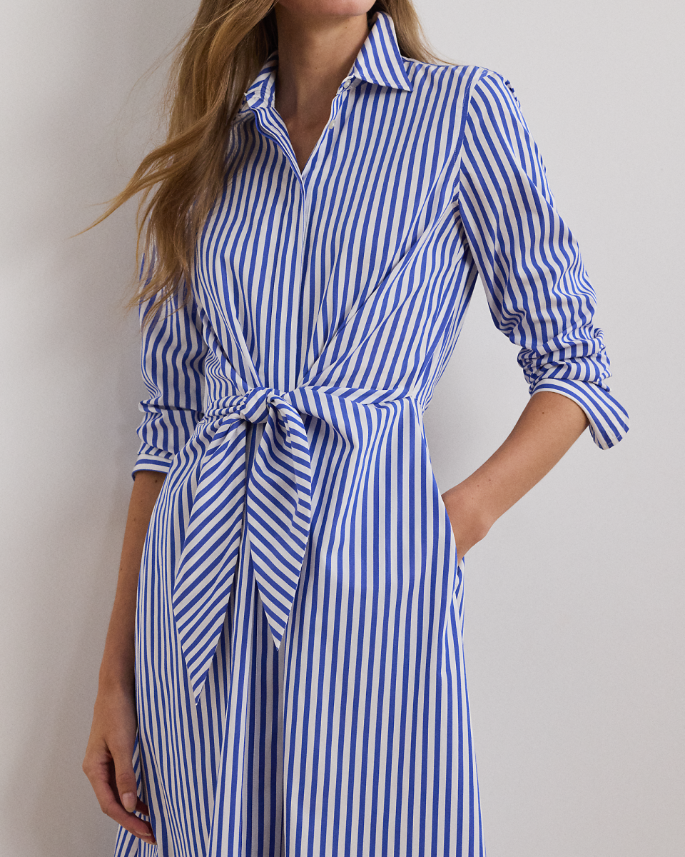这款 Lauren 标志性衬衫式连衣裙经全新升级,选用轻盈的棉质面料制成,呈现剪裁考究的外观,腰部配有休闲的同种面料加长系结,饰有色织条纹图案