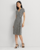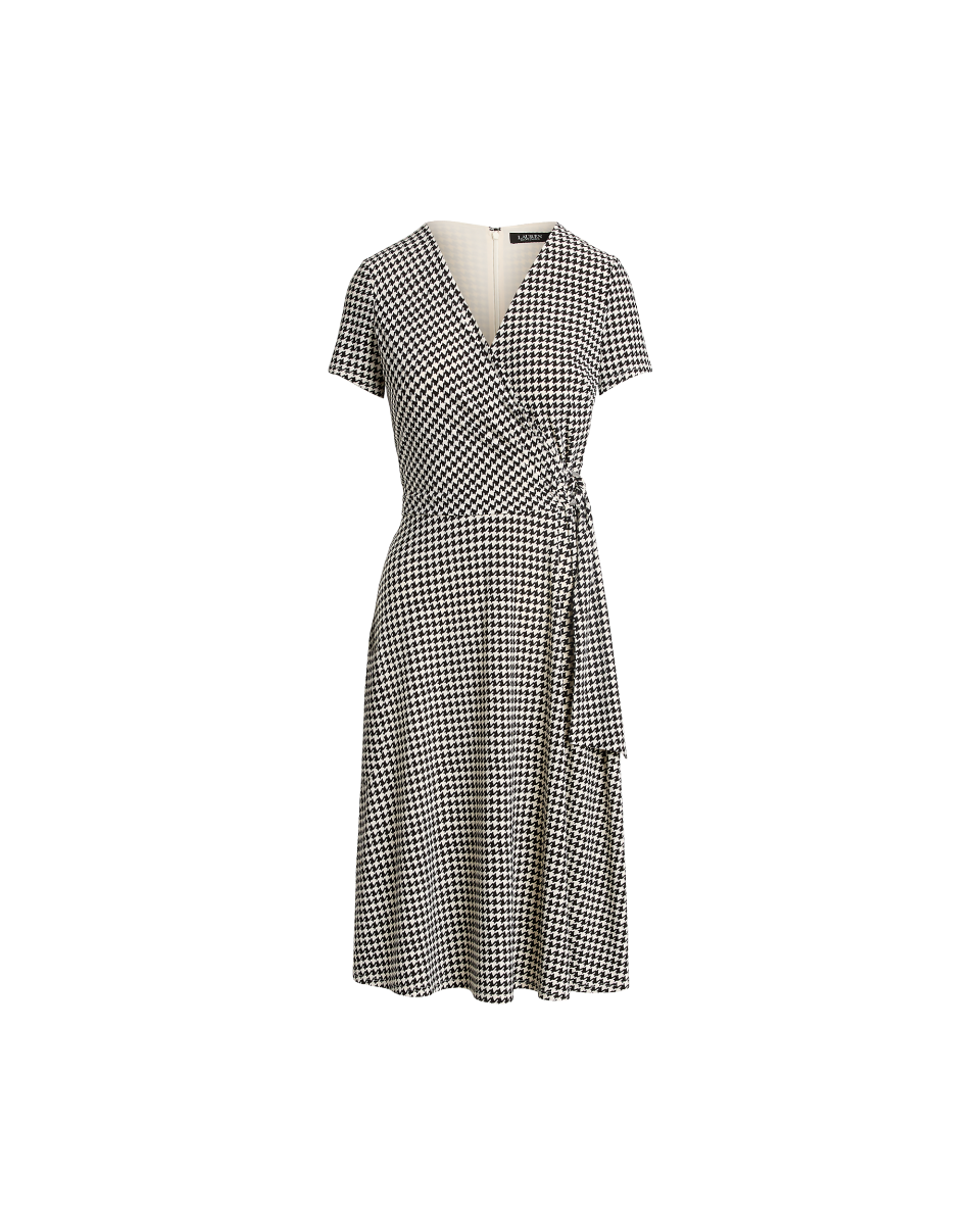 这款连衣裙选用顺滑的弹力平纹针织面料制成,经全新升级,饰有本季流行的复古风格千鸟格纹图案,彰显考究气息,采用及膝长度,配有可修饰颈部线条的斜襟领口,裙腰饰有刻着 Lauren Ralph Lauren 字样的 O 型环,尽显优雅风情