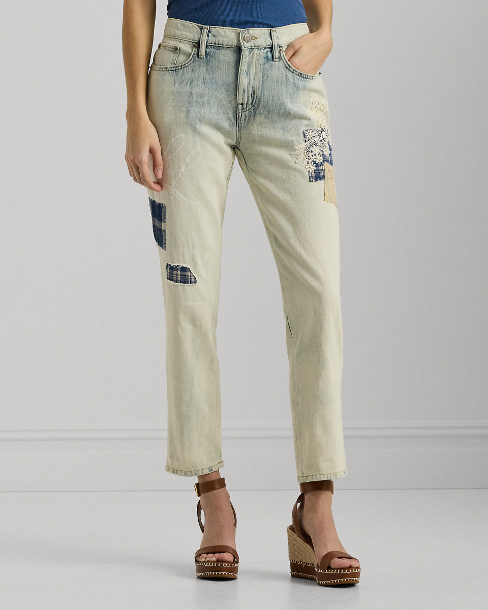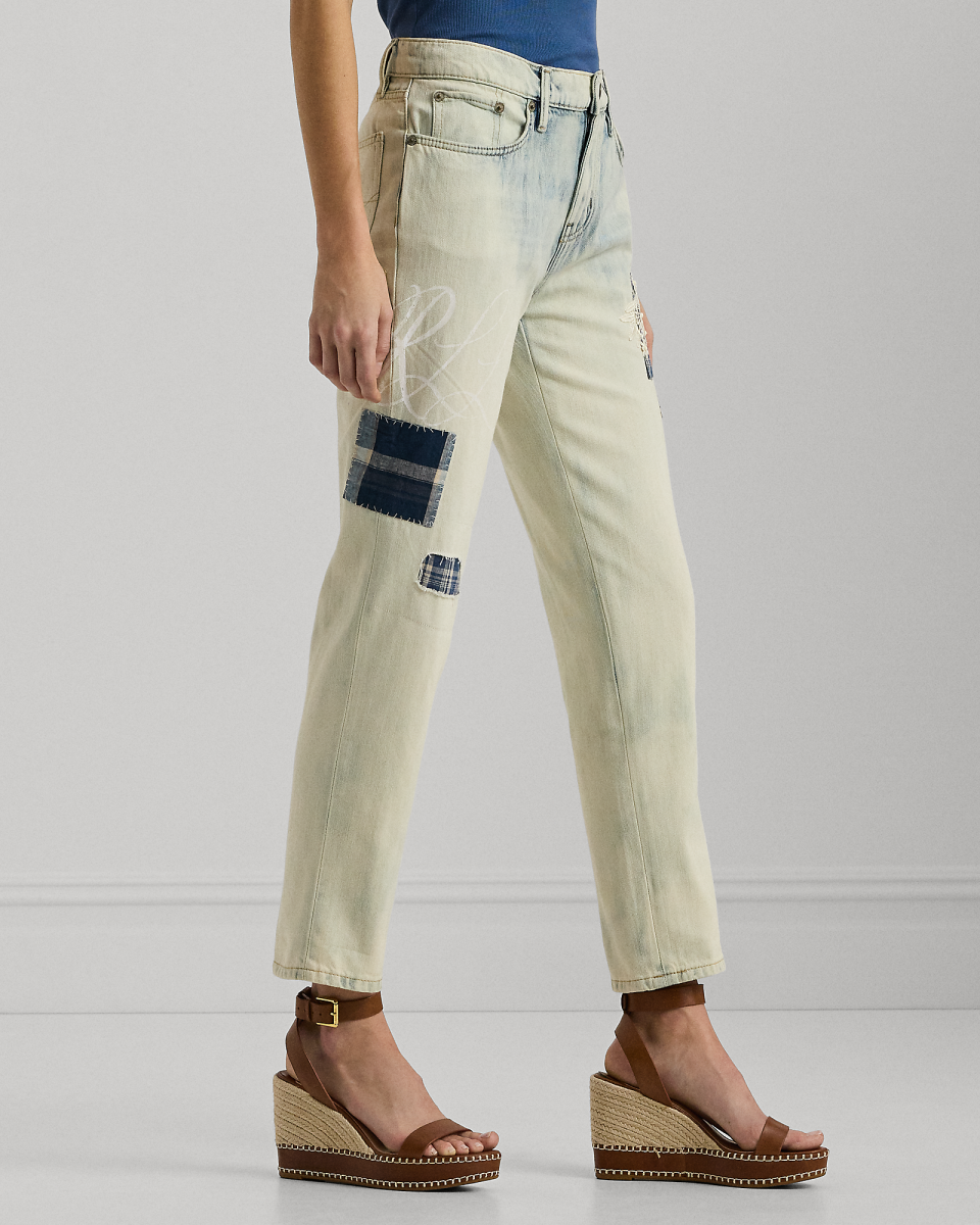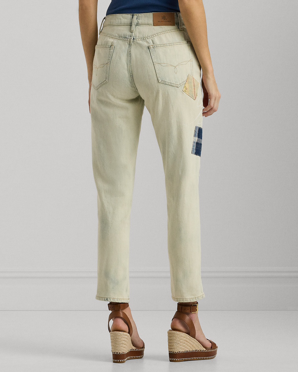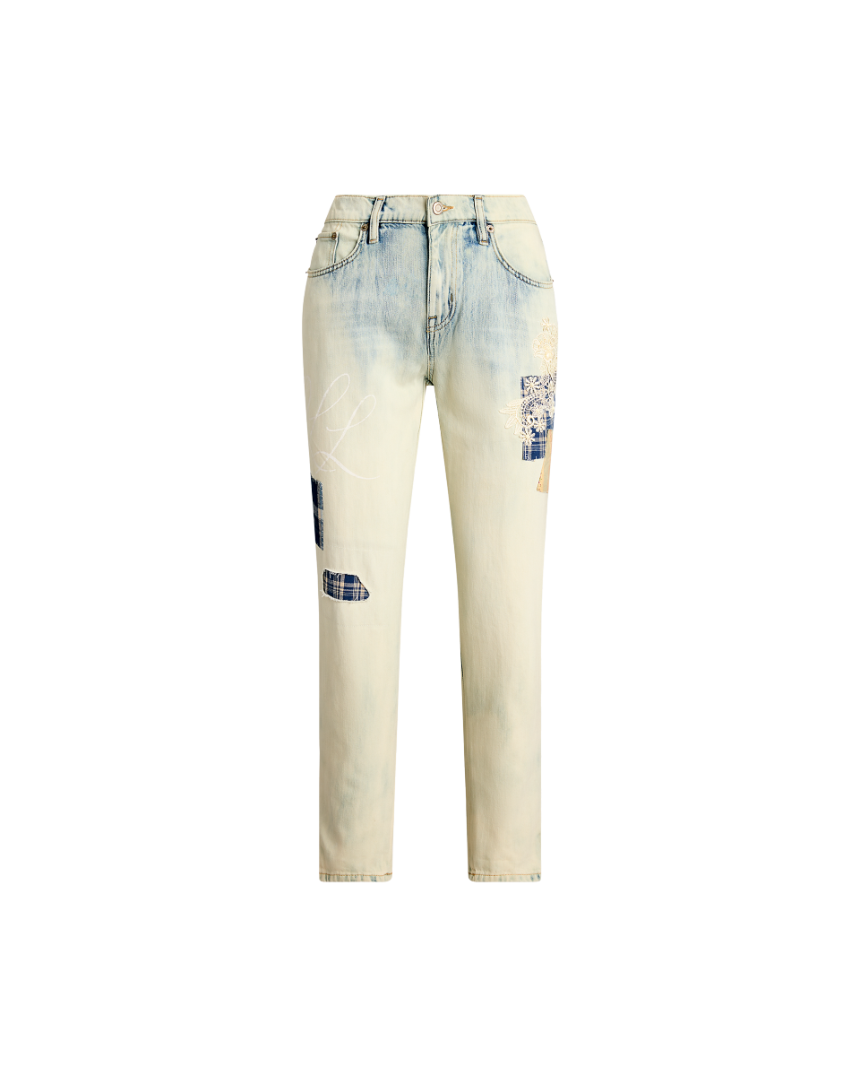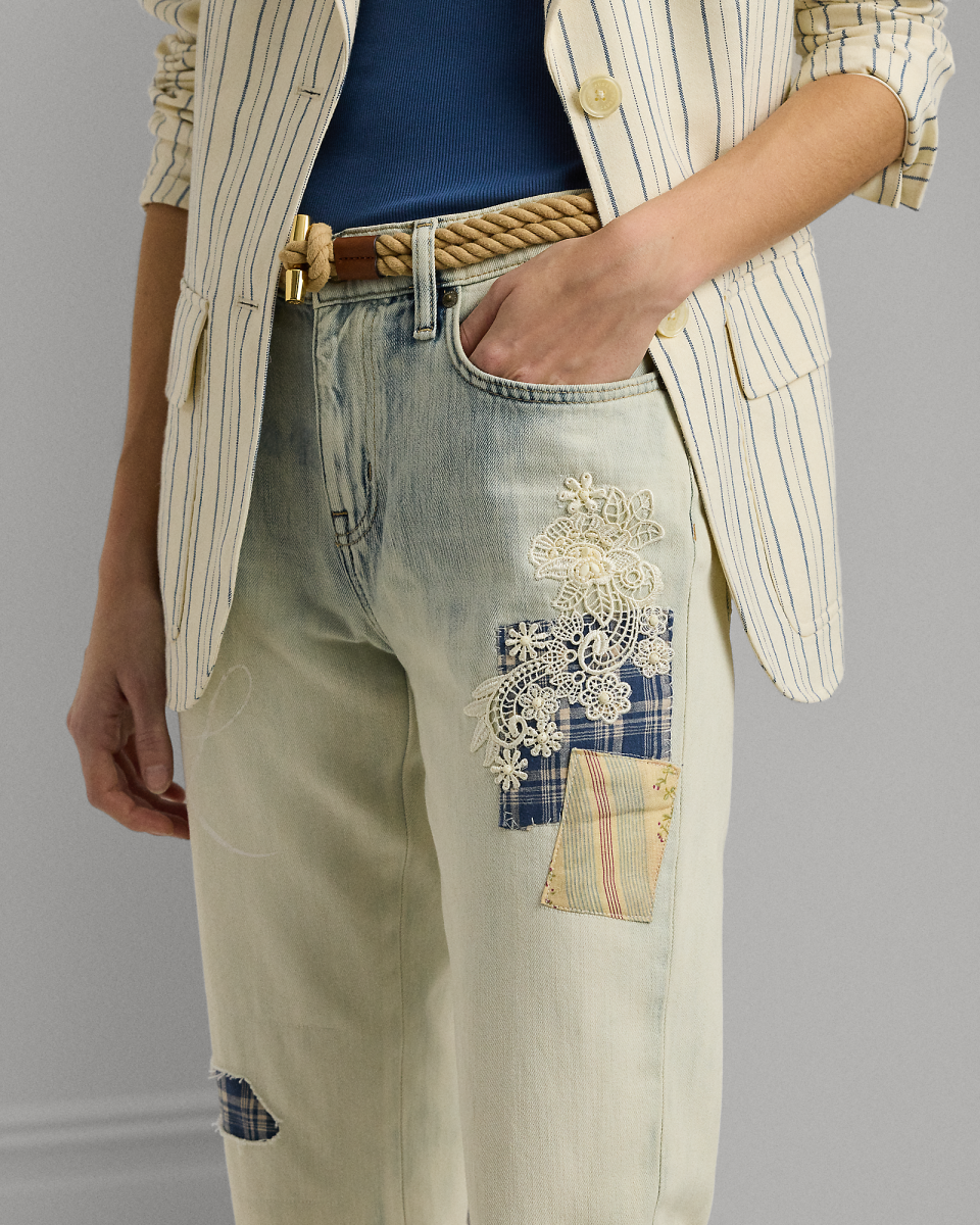 这款波西米亚风格牛仔裤选用舒适的右斜纹牛仔布制成,采用休闲的锥形廓形和中腰设计,满版饰有一系列补片