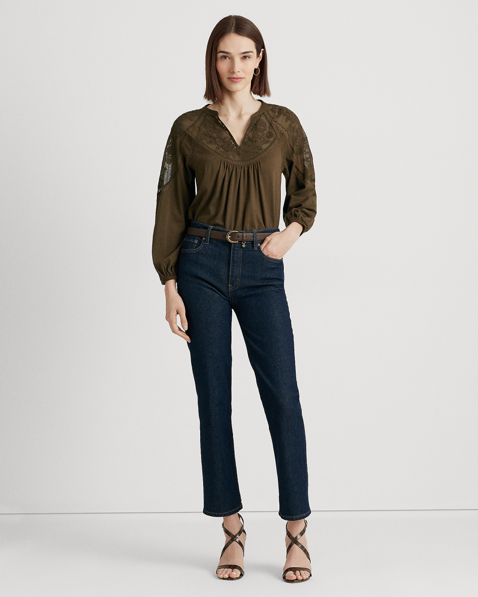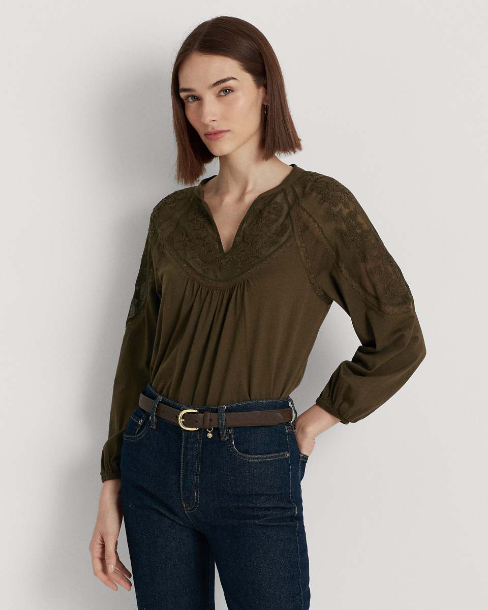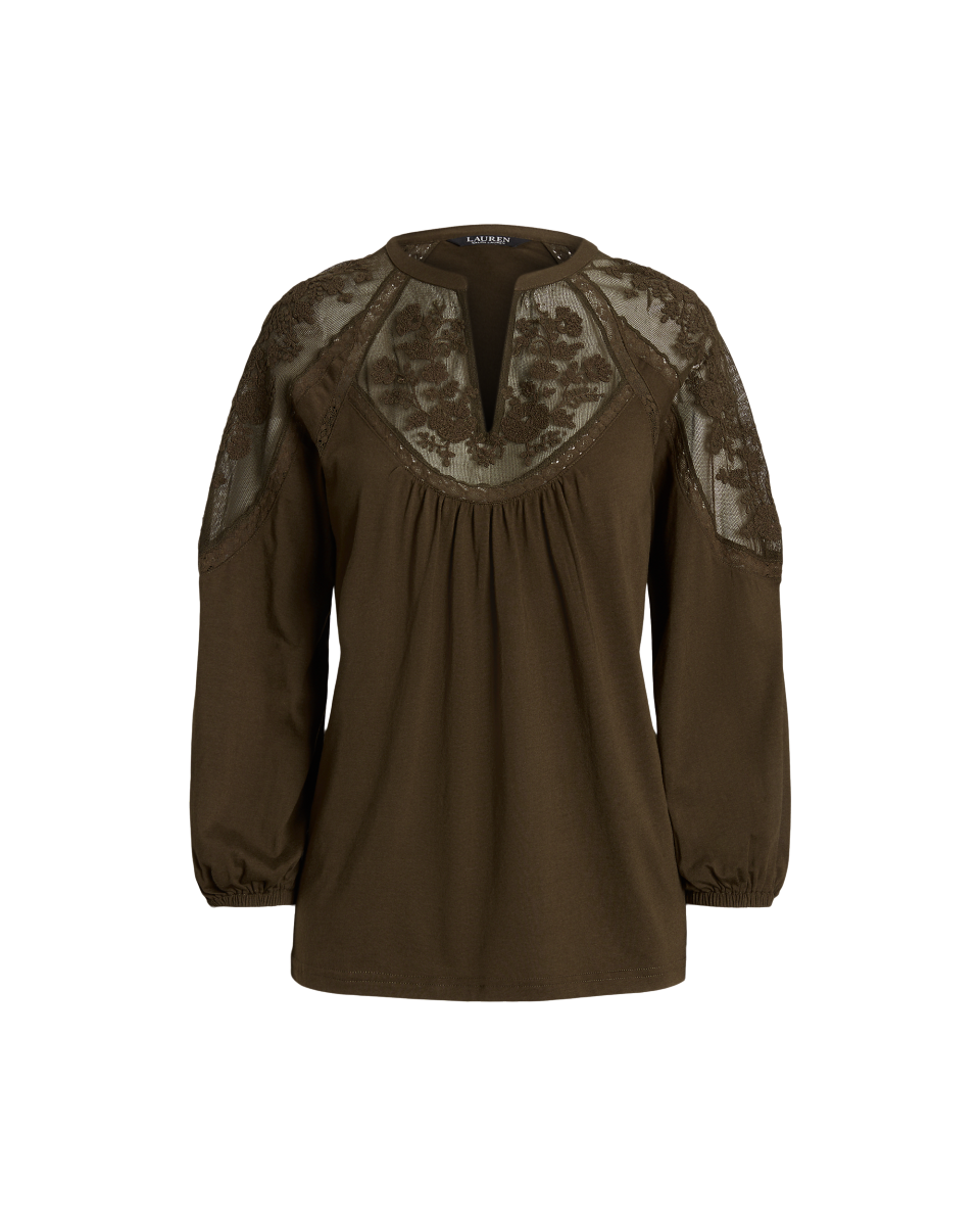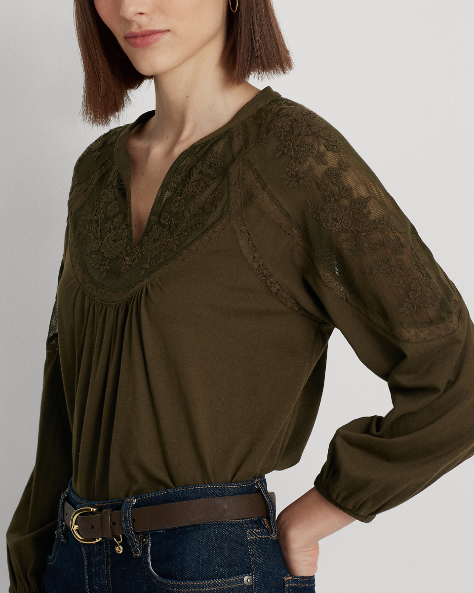 这款上衣饰有花卉图案刺绣,配有蕾丝嵌片和灯笼袖,尽显浪漫魅力。采用宽松版型,选用平纹针织面料制成,打造柔软手感
