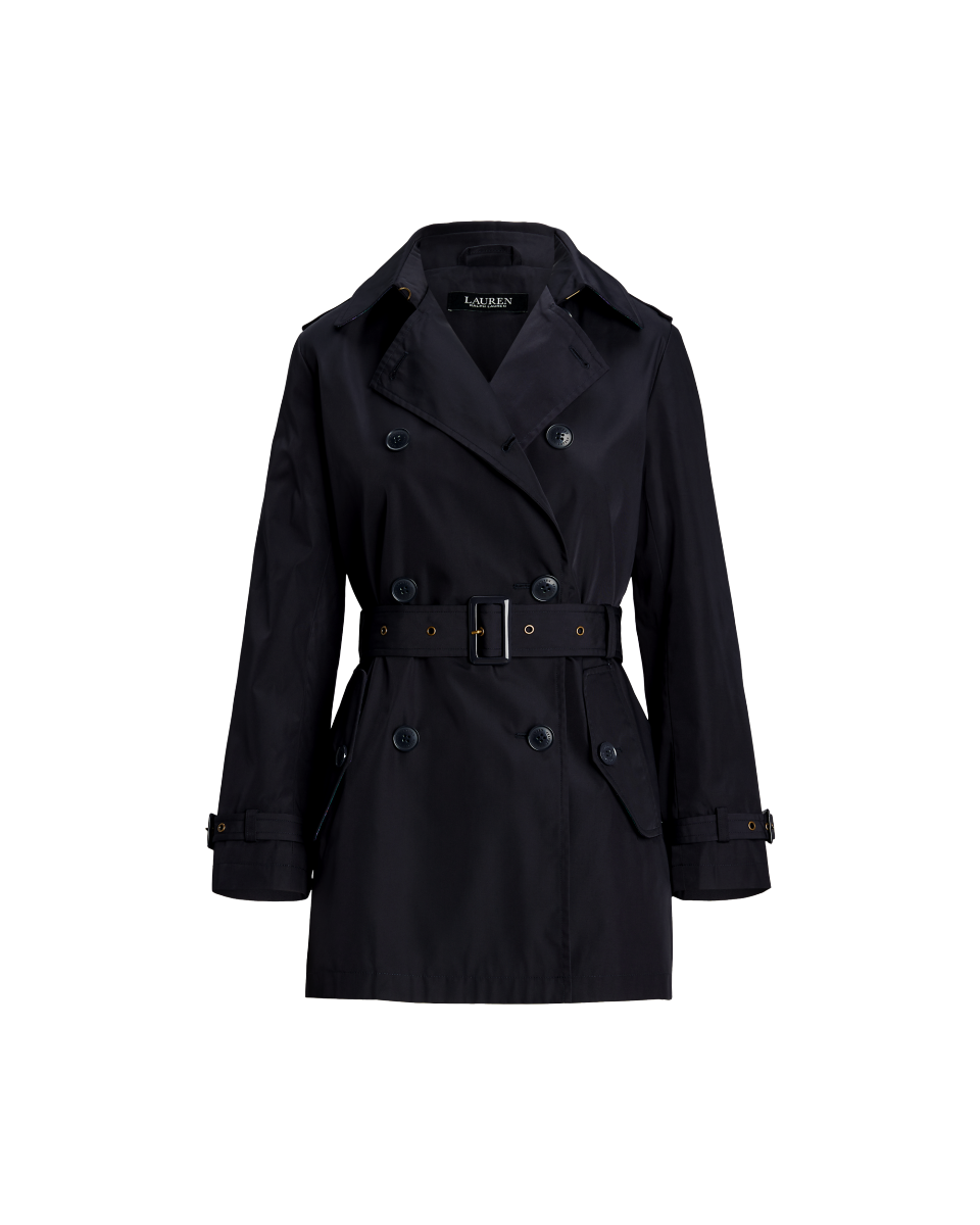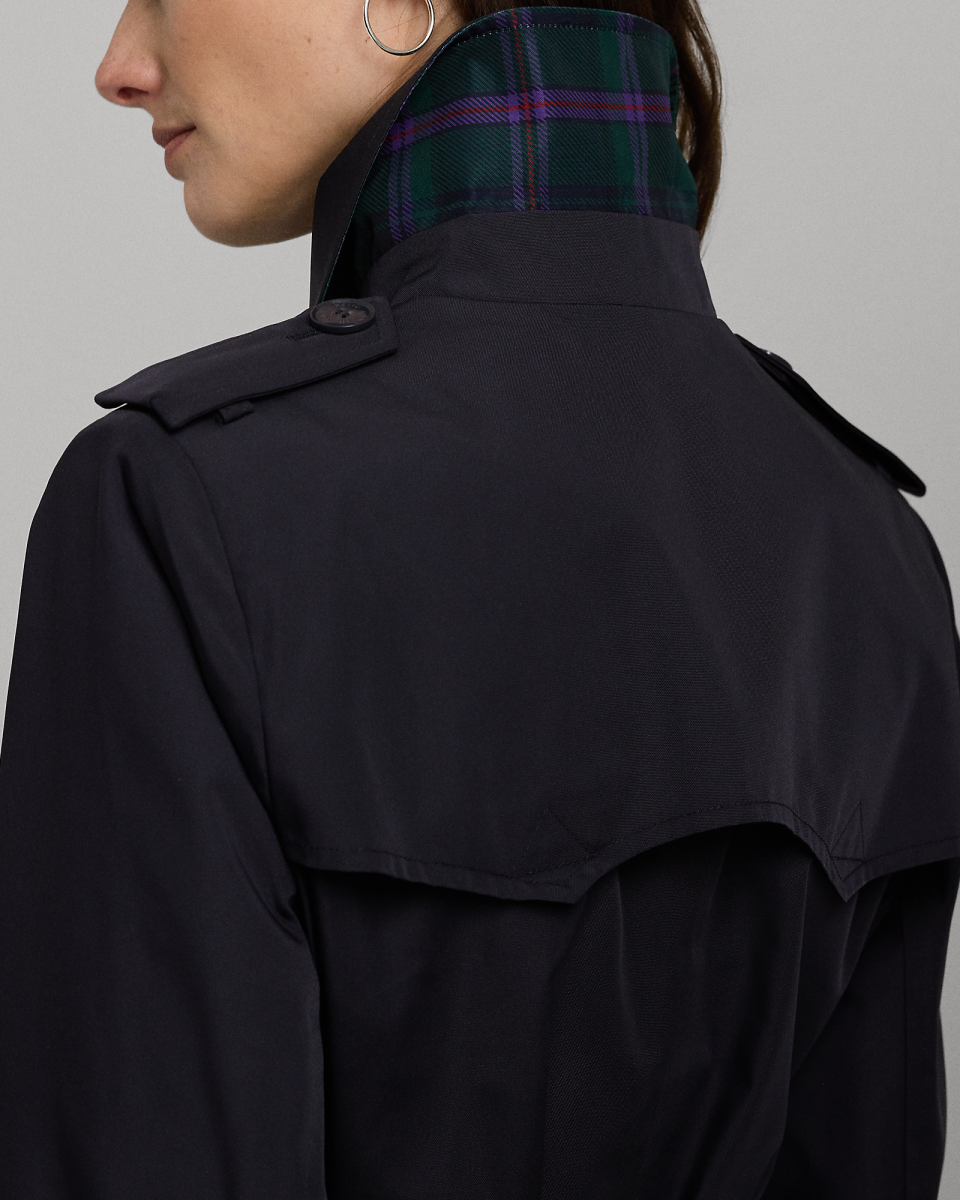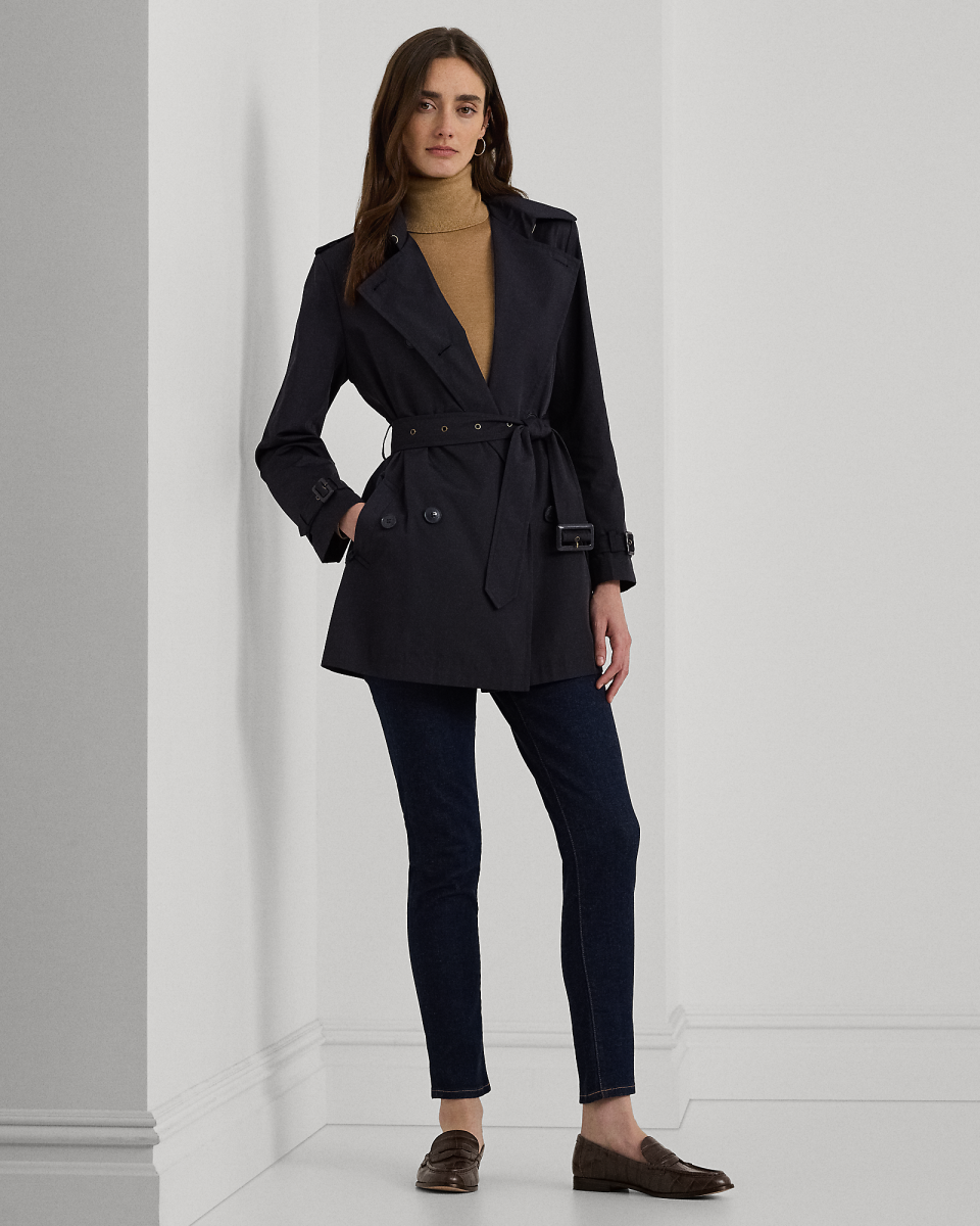 这款风衣沿袭了双排扣廓形、纽扣式肩章、腰带等传统设计元素,是经典的叠穿单品,搭配刻有 Lauren Ralph Lauren 字样的角质纽扣