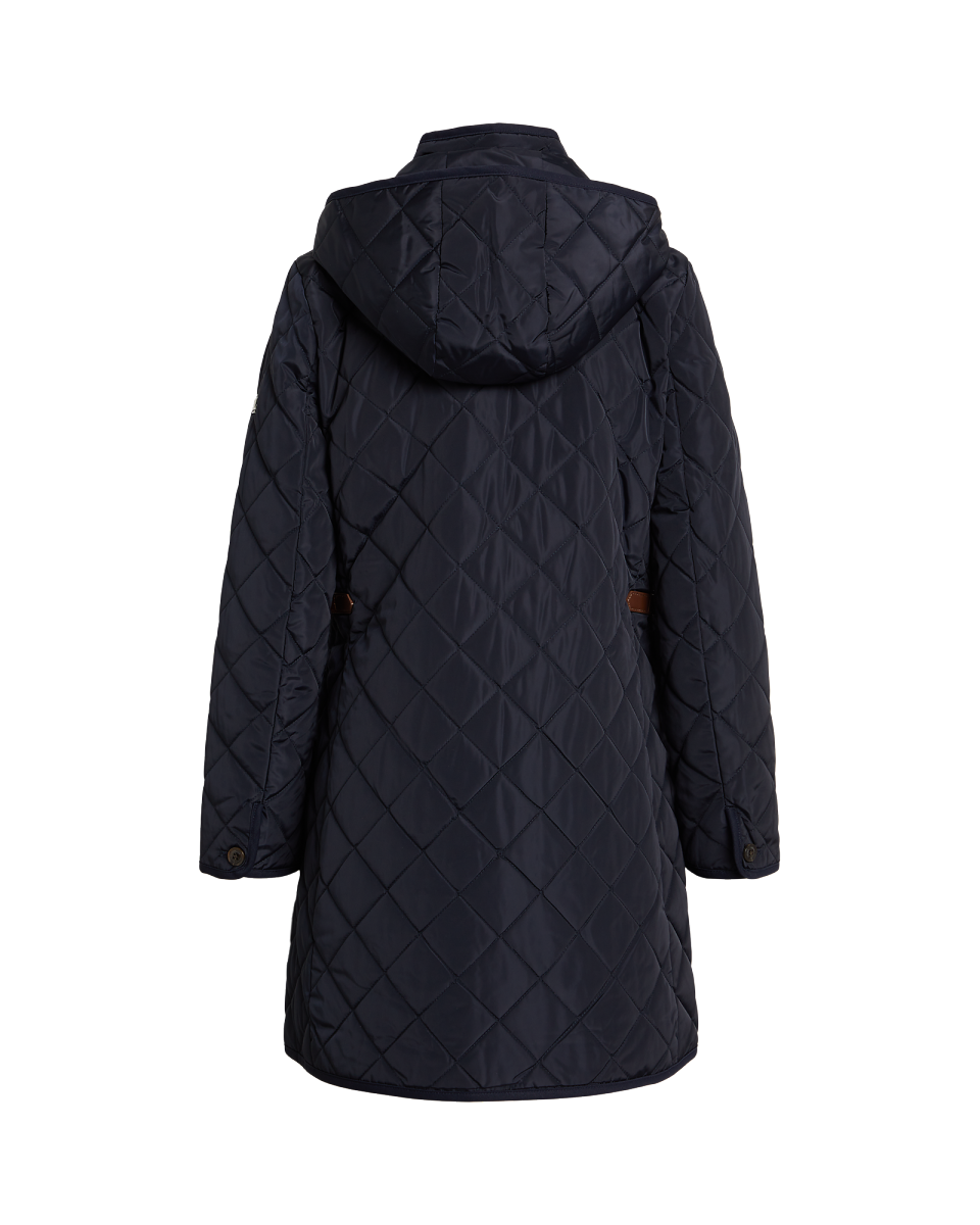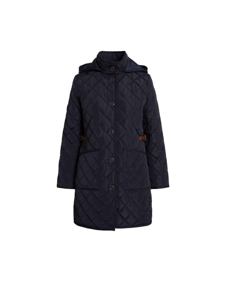 这款半高领夹克配有可拆卸风帽,采用保暖的菱形绗缝廓形,腰部配有侧边可调节扣袢,兼具时尚气质与实用功能,配有标志性角质纽扣,衣袖配有抛光徽标五金件,为整体造型锦上添花