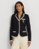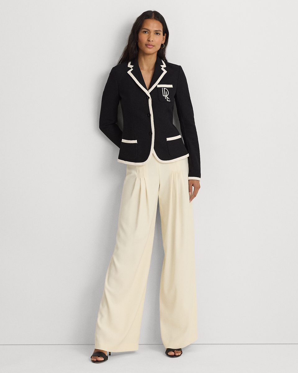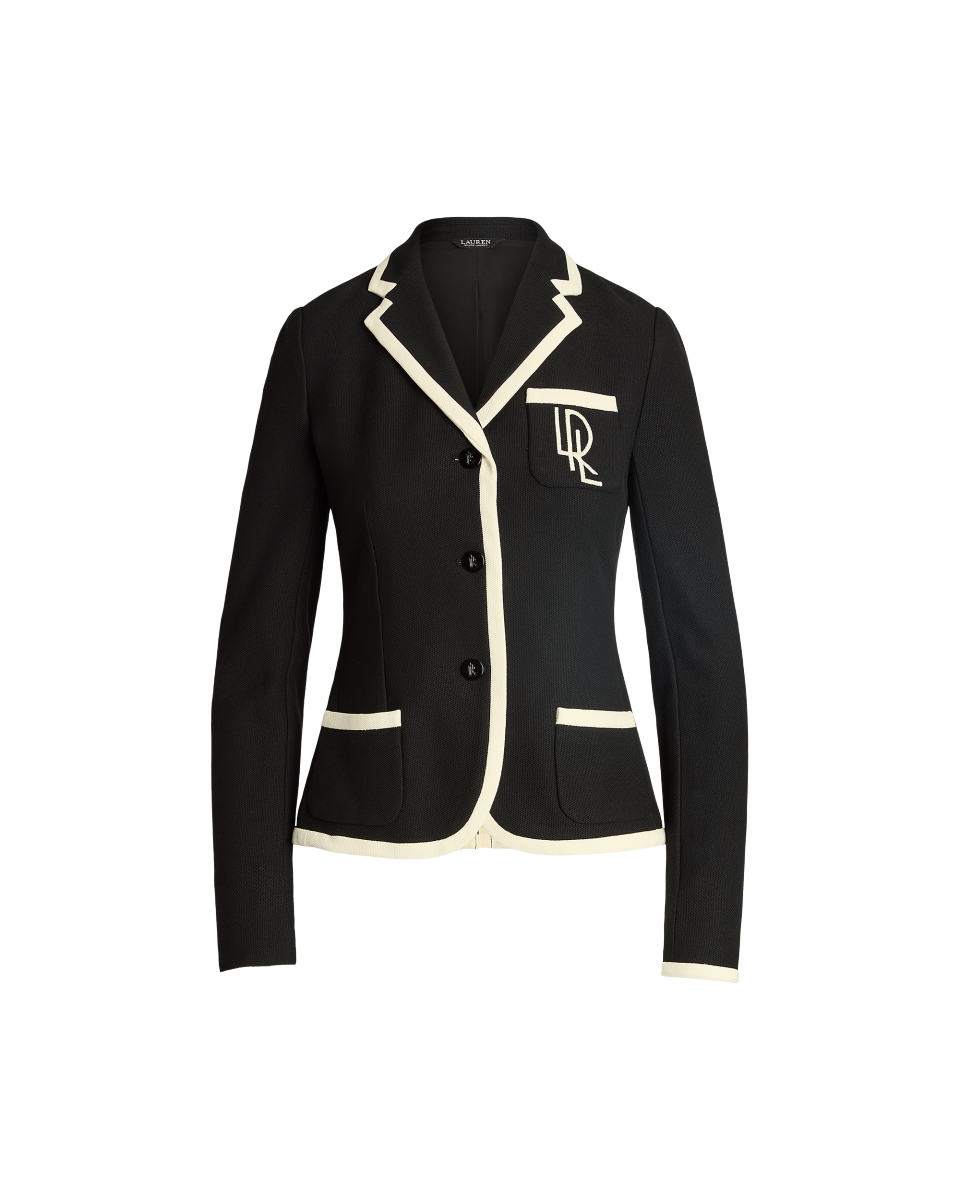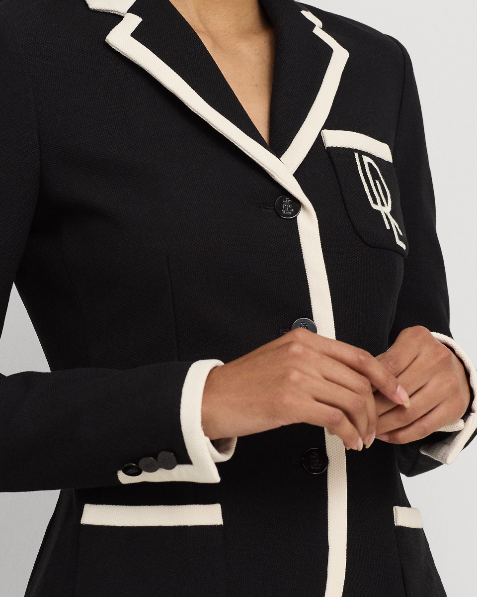 这款西装外套采用双色设计与三粒扣流线廓形,胸前口袋饰有 LRL 字样徽标刺绣,彰显雅致的现代风格,采用腰部缝褶和公主线等剪裁细节,打造考究外观;选用弹力珠地布制成,呈现舒适质感