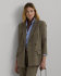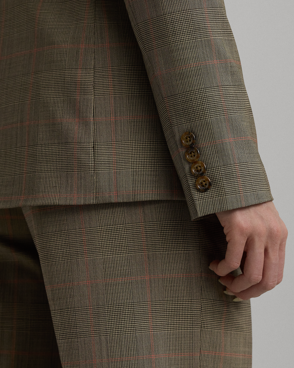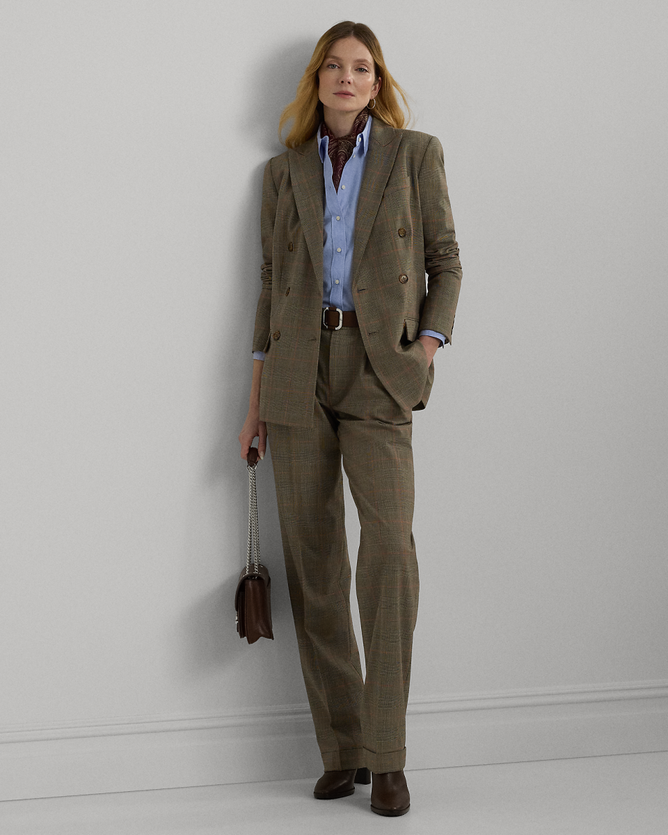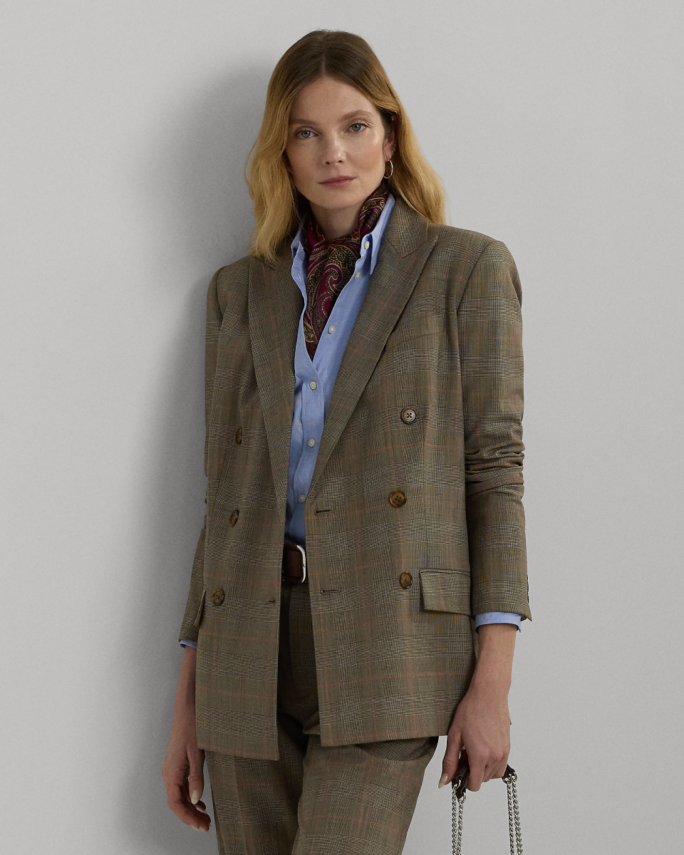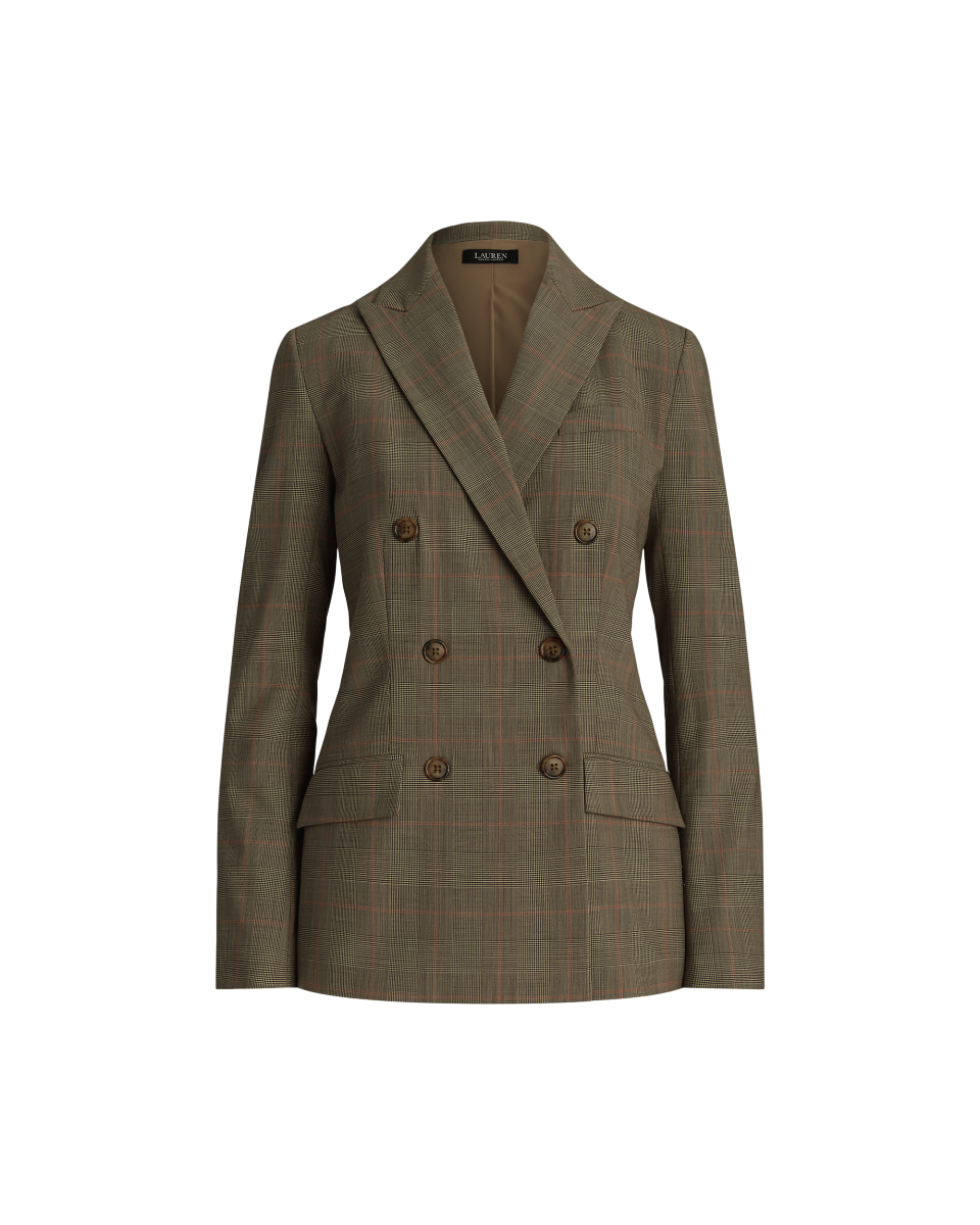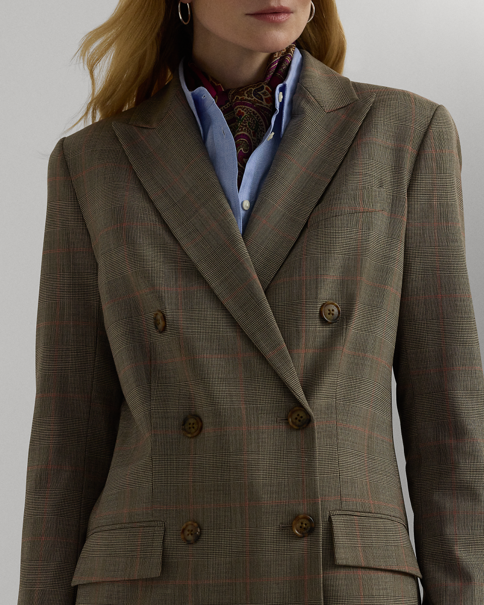 这款双排扣西装外套选用弹力面料制成,呈现时尚外观与舒适质感,采用流线型廓形,配有腰部缝褶、肩垫和公主线,配有刻着 Lauren Ralph Lauren 字样的角质纽扣,饰有经典格伦厄克特格纹色织图案