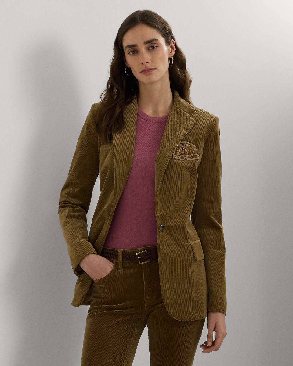 这款西装外套选用带弹力的宽棱纹灯芯绒面料制成,呈现天鹅绒般的柔顺手感,采用流线型单粒扣廓形,彰显 Lauren Ralph Lauren 雅致美学,胸前饰有华丽的狮子饰章金丝补片,搭配复古马头装饰纽扣
