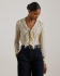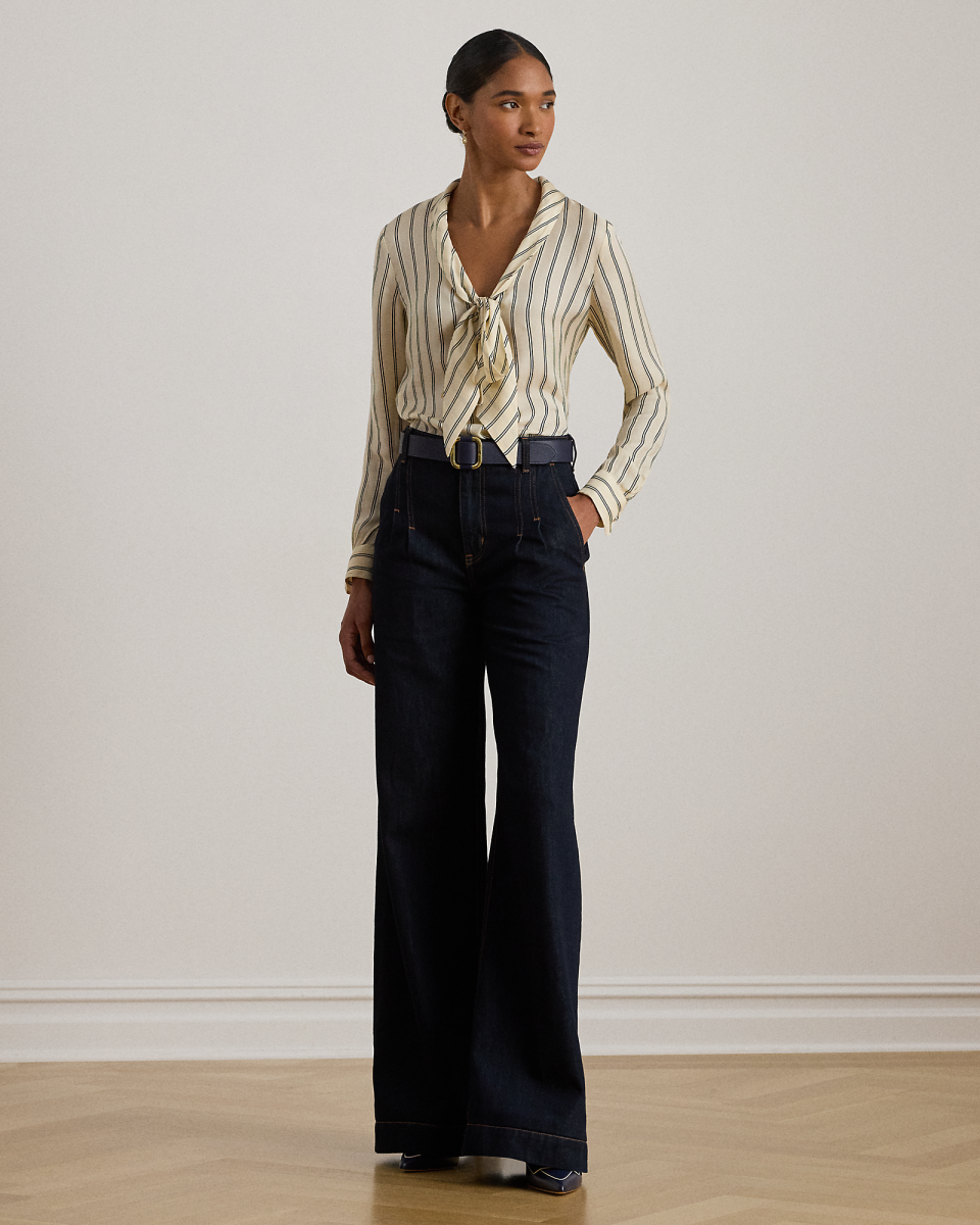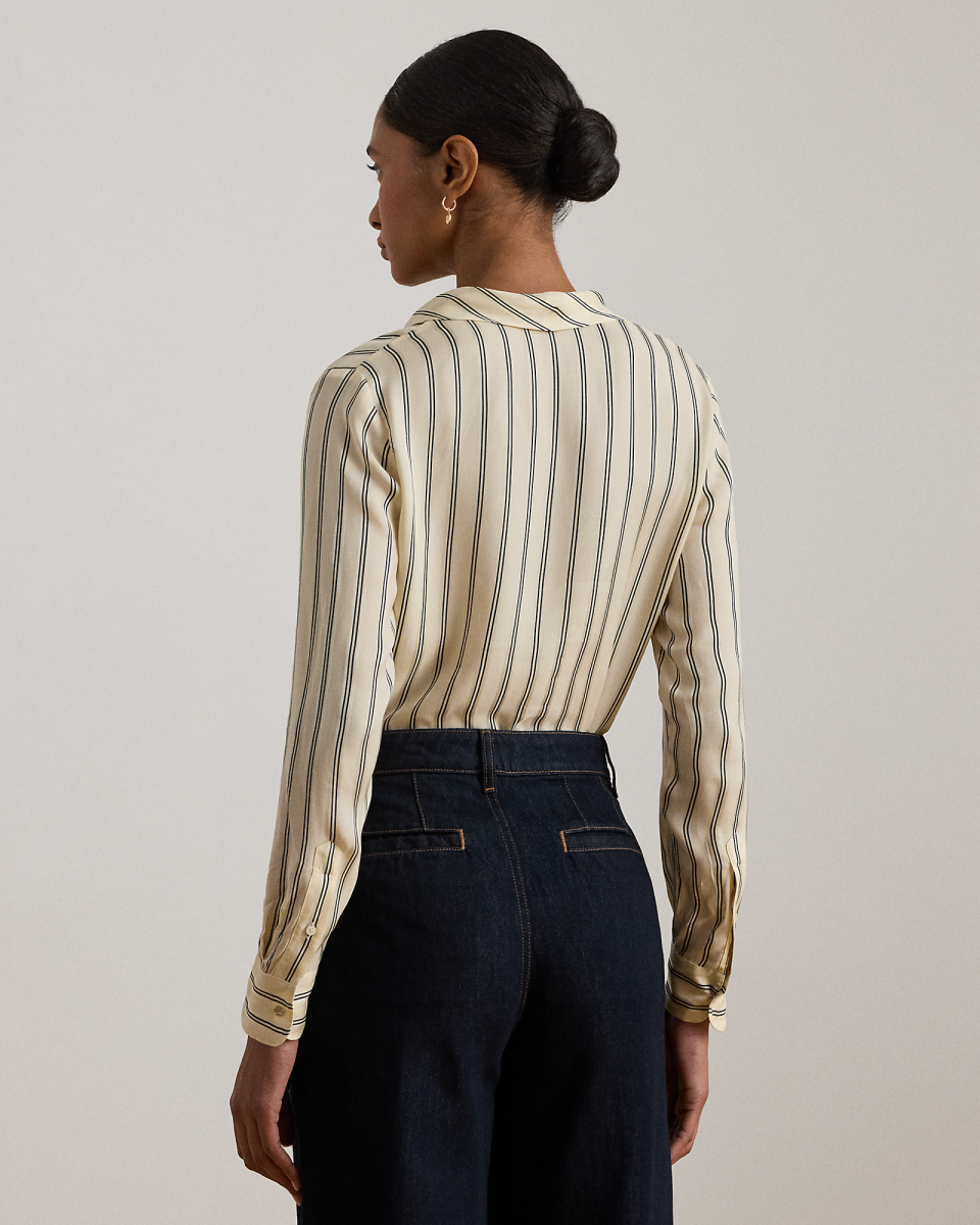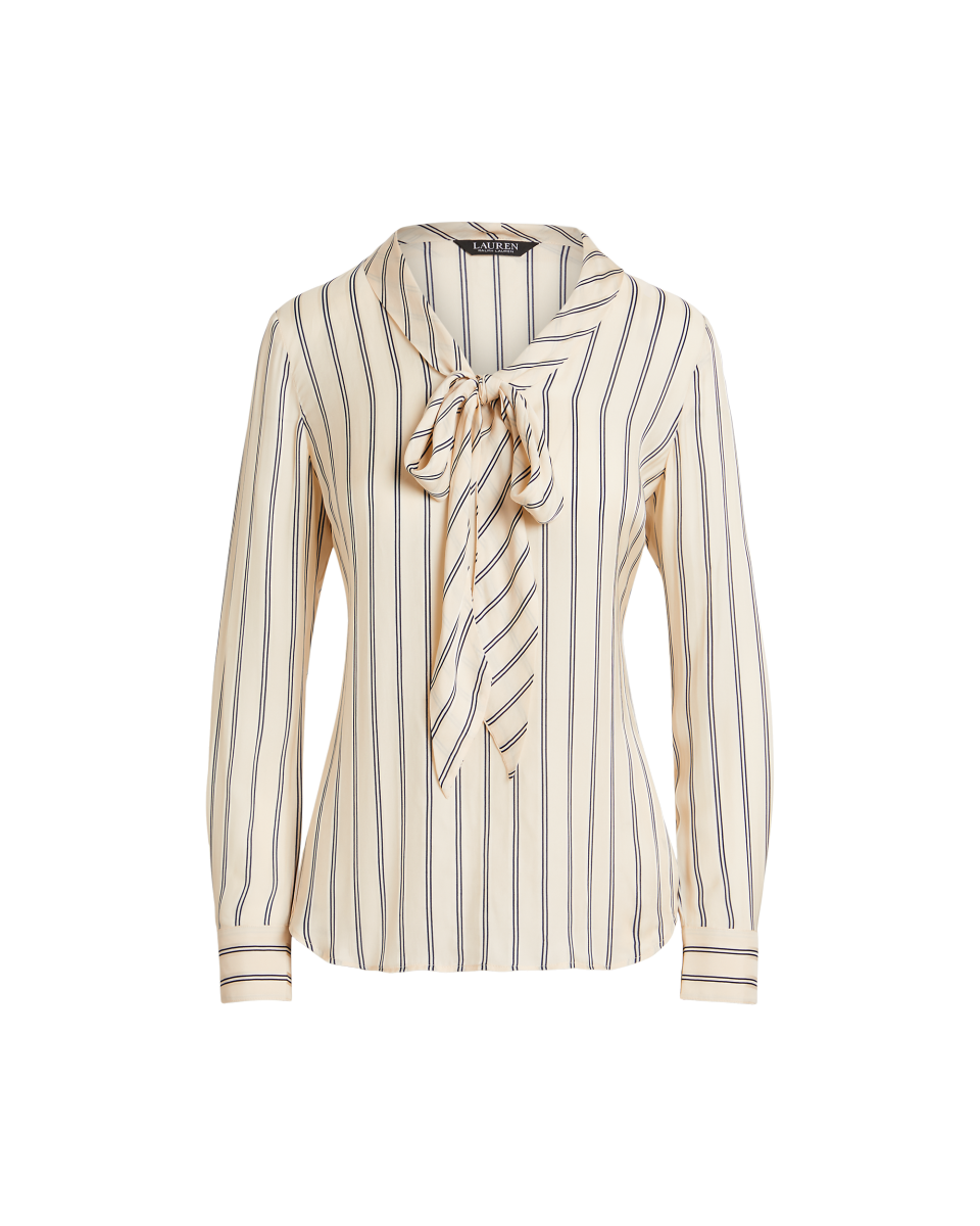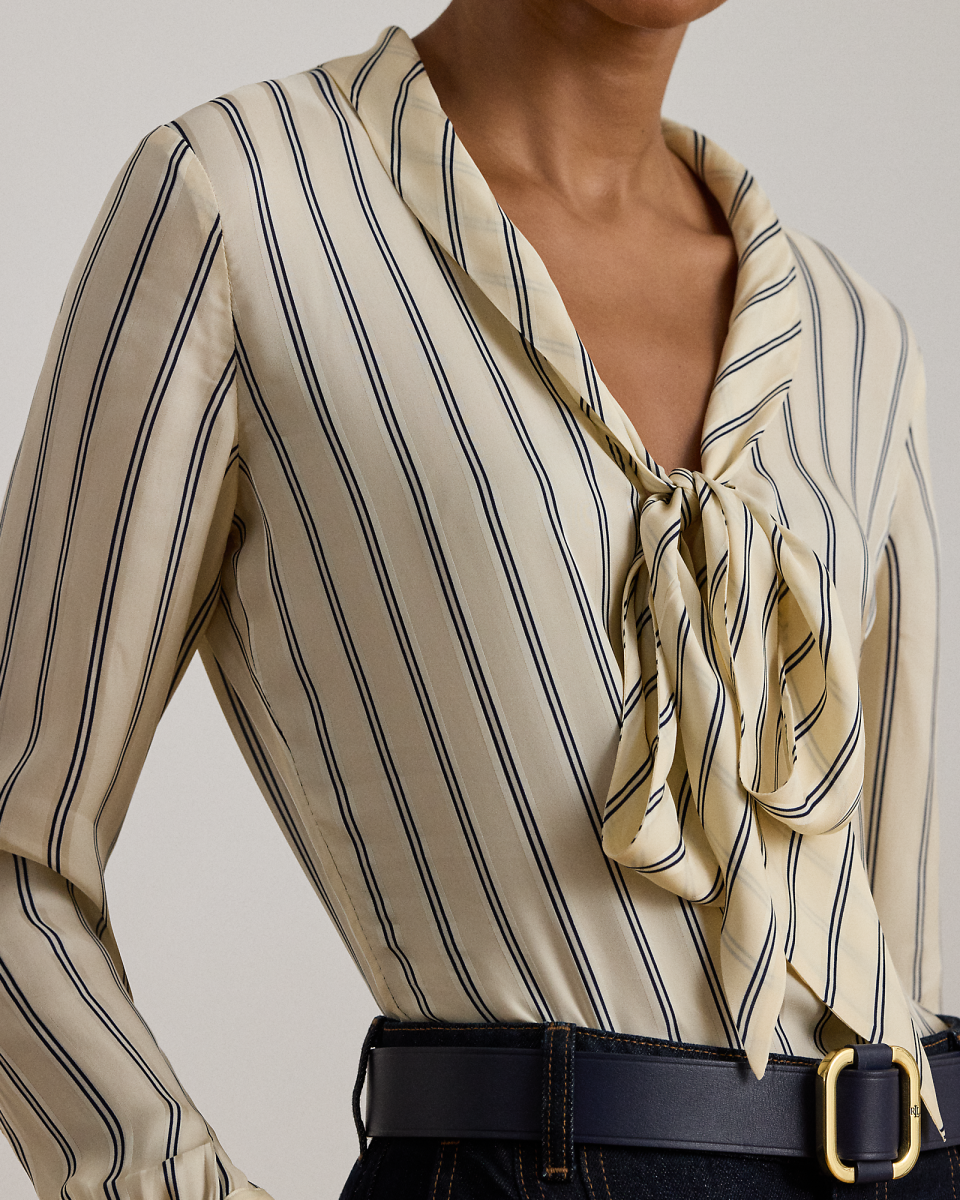 这款提花布女式衬衫饰有细长的条纹,配有领口系结,正面系有大蝴蝶结