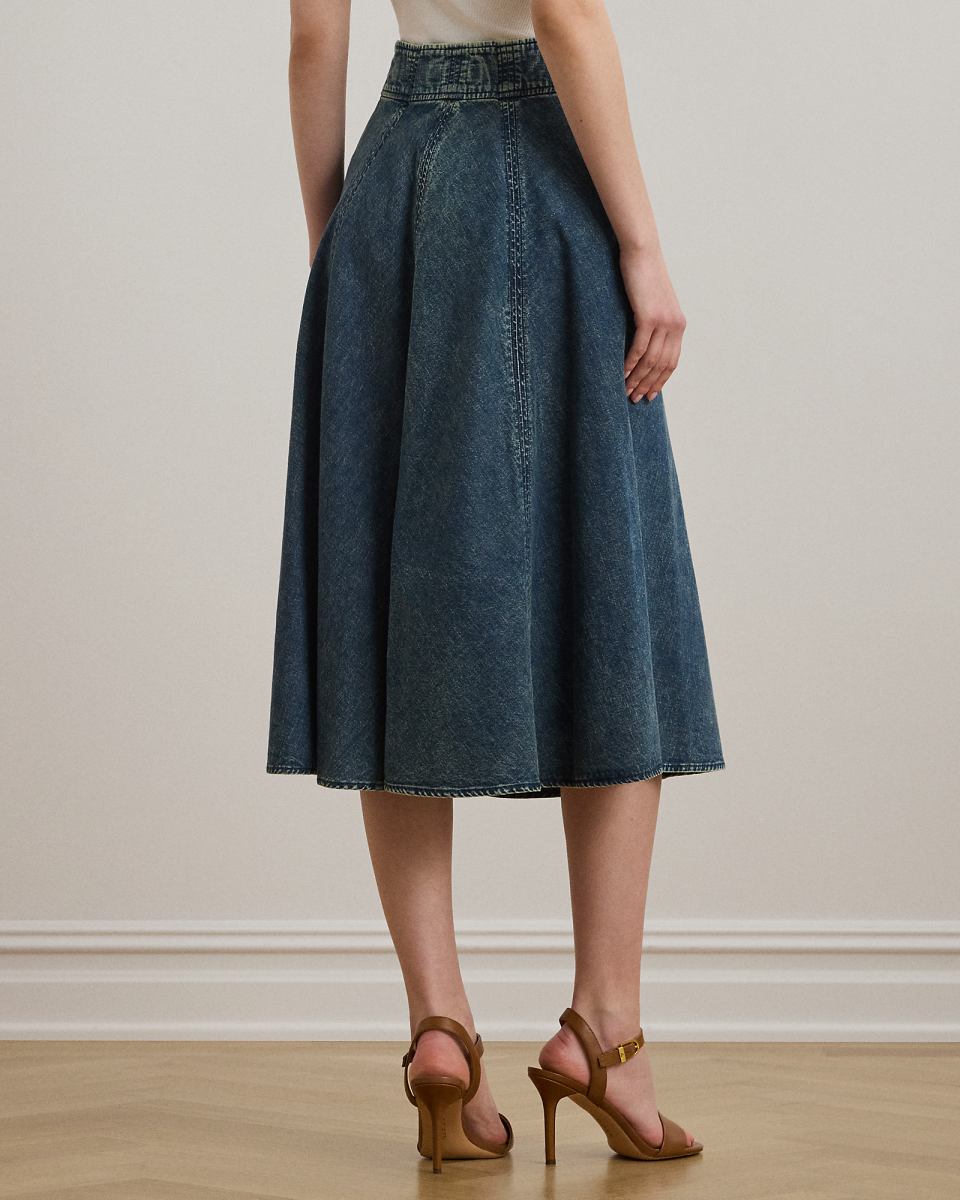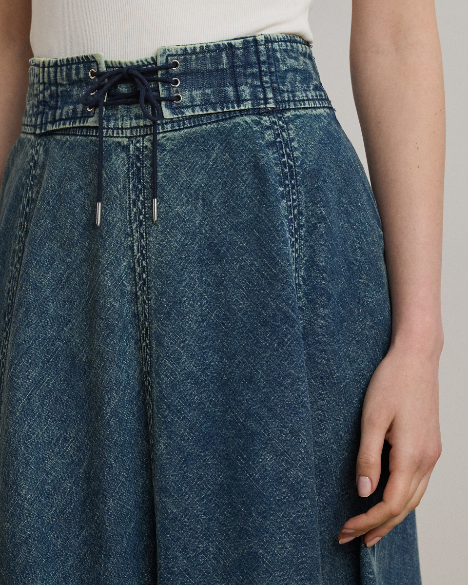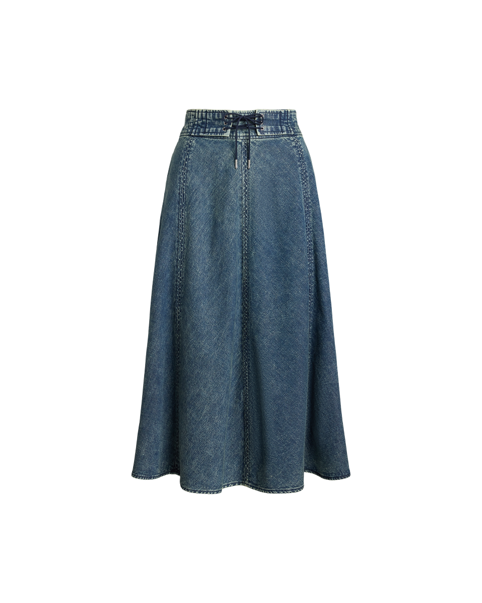 这款牛仔布迷笛半身裙以垂直缝线巧妙突显 A 字型廓形,搭配抽绳裙腰,彰显休闲魅力