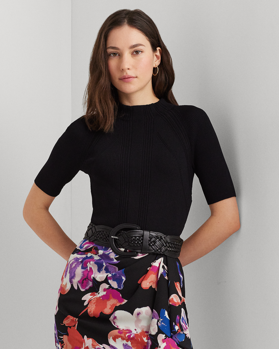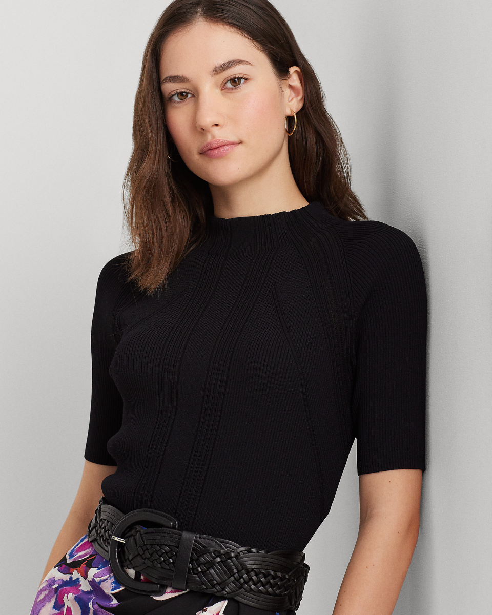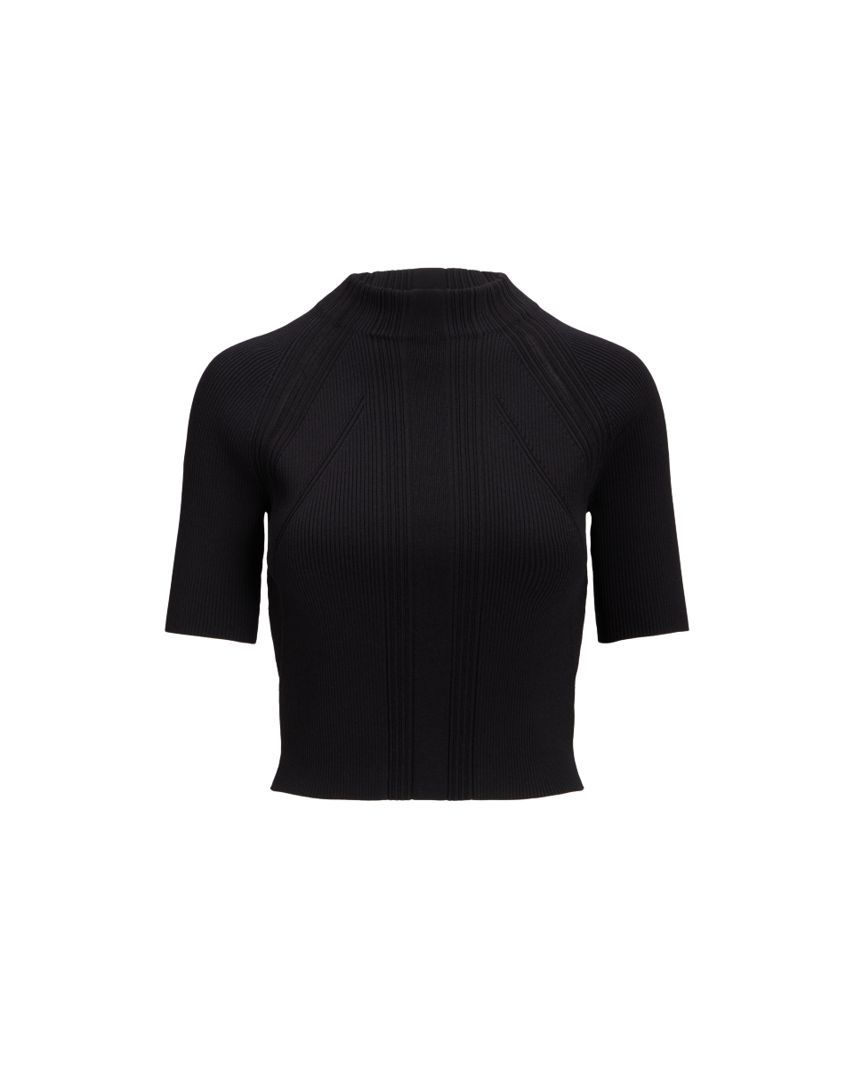 这款现代风格短袖针织衫采用短款修身廓形,搭配半高领,饰有罗纹针织图案