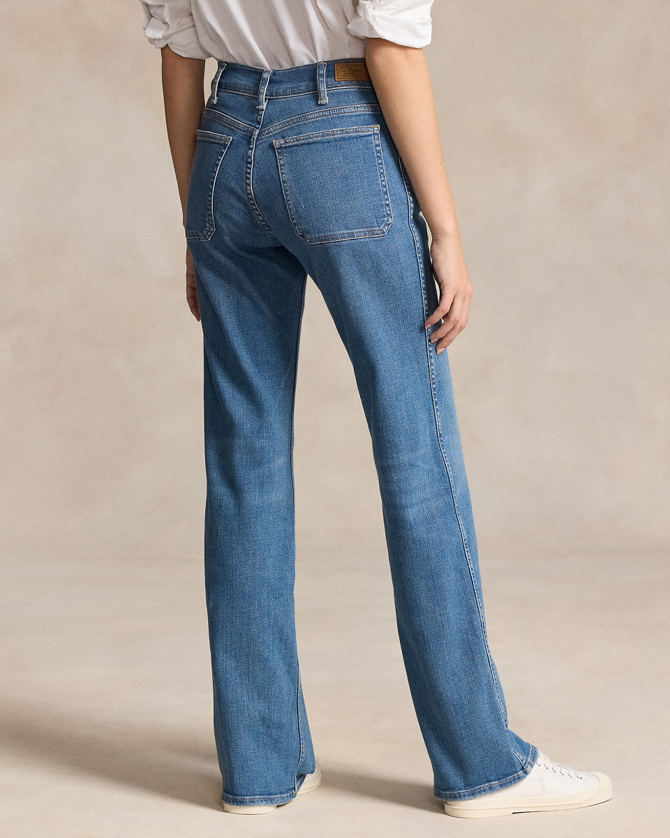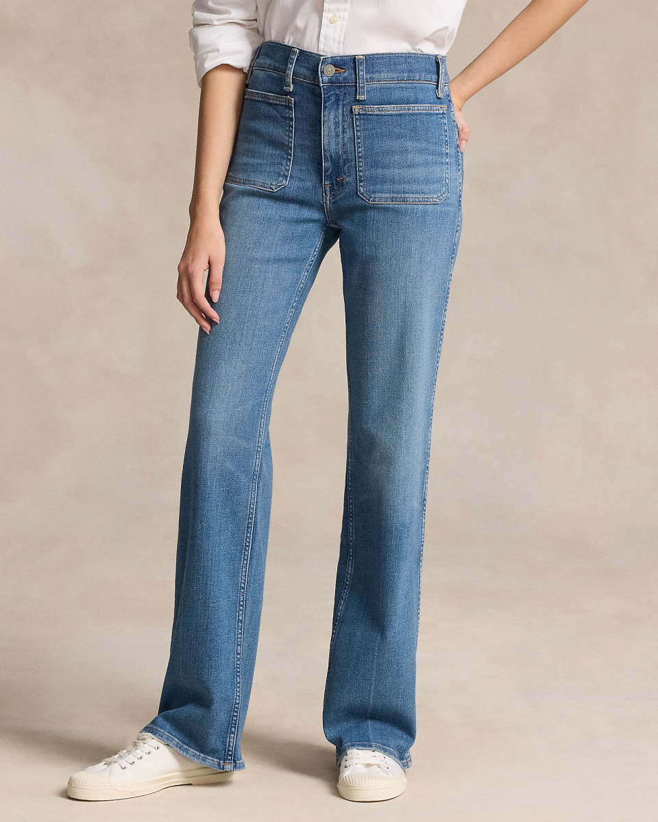 这款靴型牛仔裤采用喇叭状阔腿廓形,选用舒适的弹力面料制成,质地柔软而又挺括有型