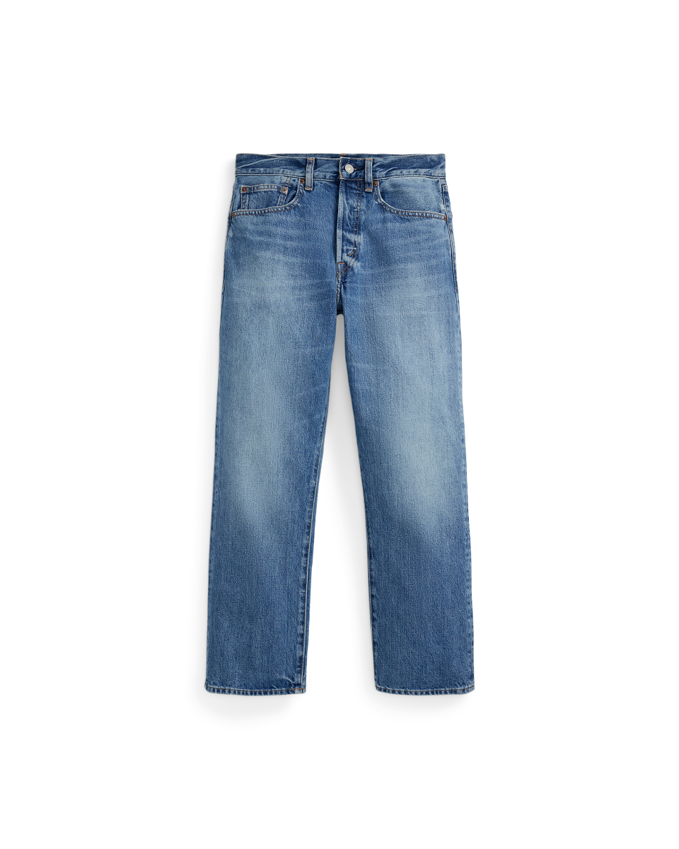 这款宽松直筒版型牛仔裤选用厚度适中的棉质牛仔布制成,饰有考究的竹节纹理,采用略微裁短的廓形和高腰设计,经水洗处理,呈现经典靛蓝色,经不均匀打磨处理,彰显做旧外观