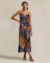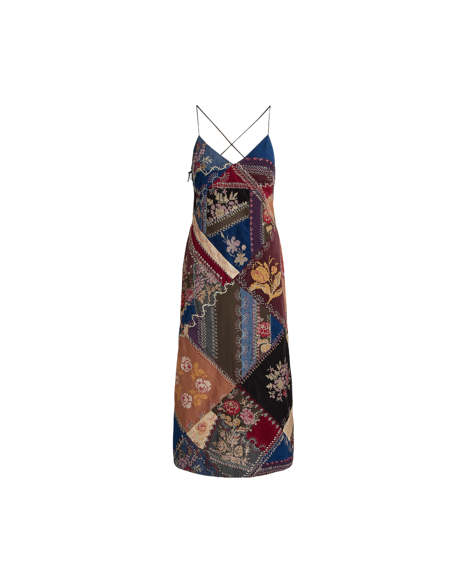 这款连衣裙灵感源自 Ralph Lauren 2022 年春季系列的一条连衣裙,由层层叠叠的补片构成,饰有精美刺绣,搭配迷人的深 V 领口,背面配有十字交叉系带