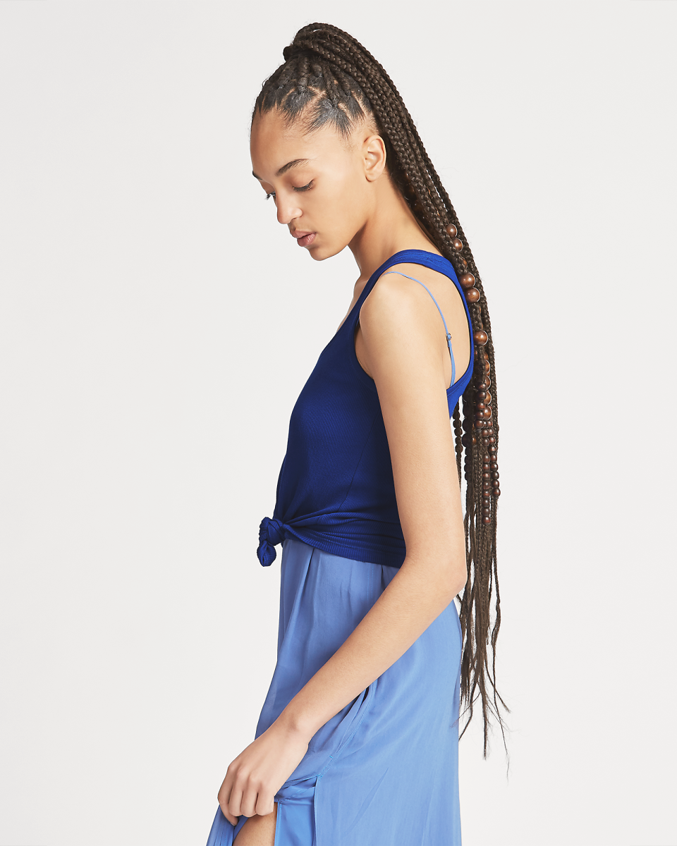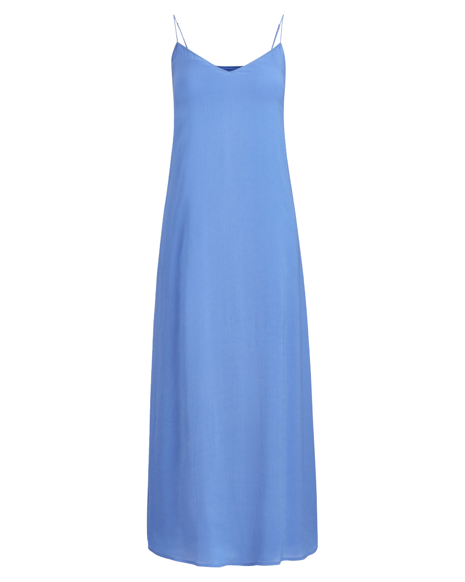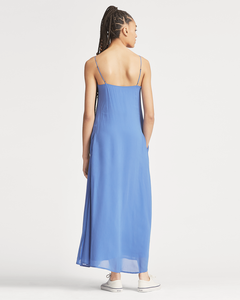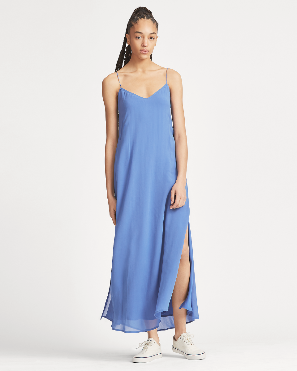 本款 A 字型连衣裙设计有细肩带,采用一层乔其纱和一层绸缎相结合,尽显灵动飘逸,而侧边高开衩提升其时尚气质