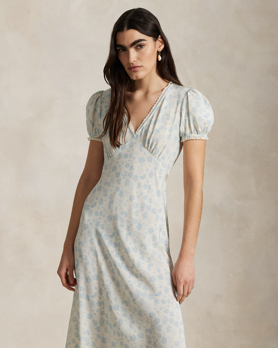 这款轻盈的连衣裙选用顺滑的双绉面料制成,饰有绘画风格花卉图案,配有精美的缩褶和钩编蕾丝饰边