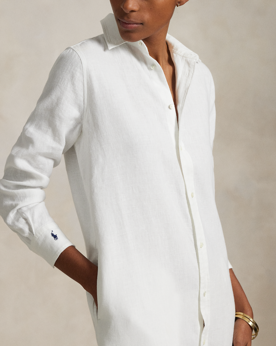 这款经典的 Polo 衬衫式连衣裙选用轻盈的亚麻面料制成,采用直筒版型和侧边加长开衩设计,配有宽角领、纽扣式门襟和纽扣式筒形袖口等男装风格细节