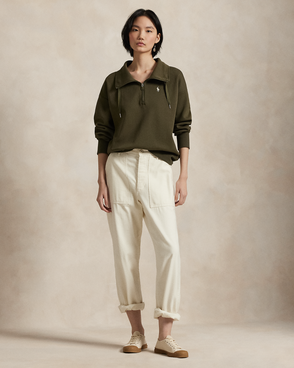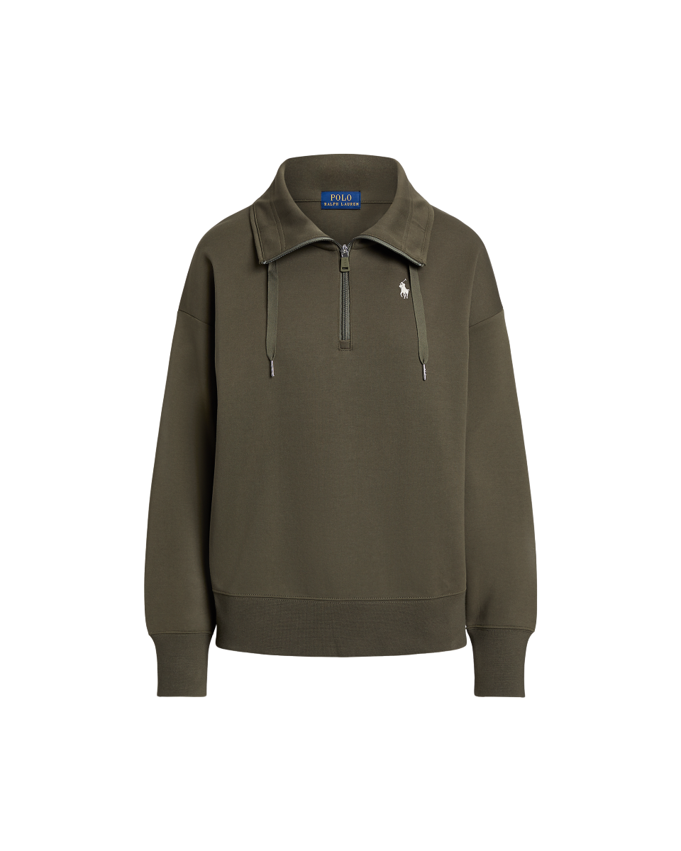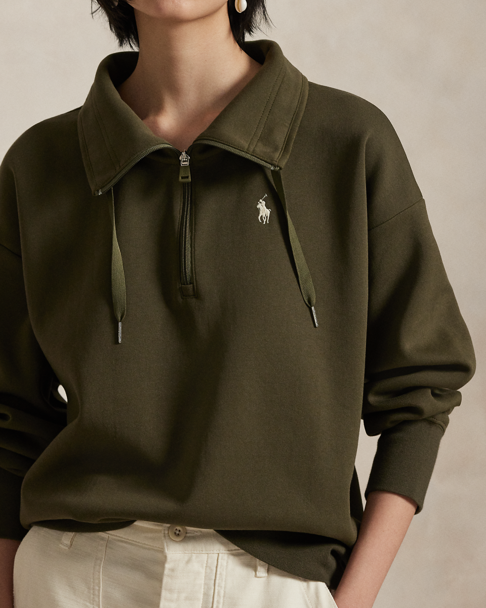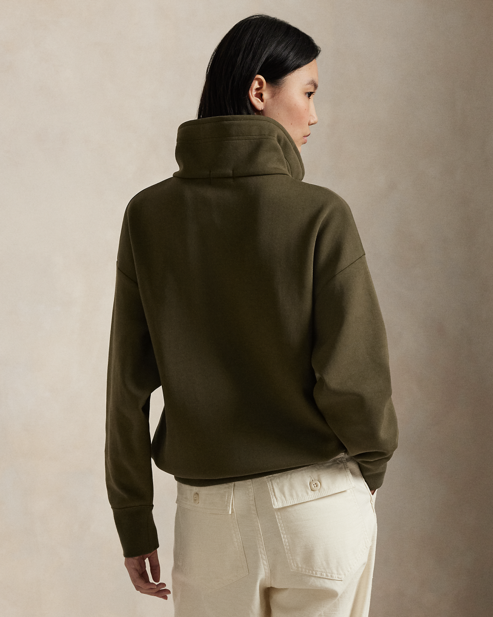 这款套头衫选用顺滑的针织提花布制成,搭配抽绳漏斗领和半拉链式门襟