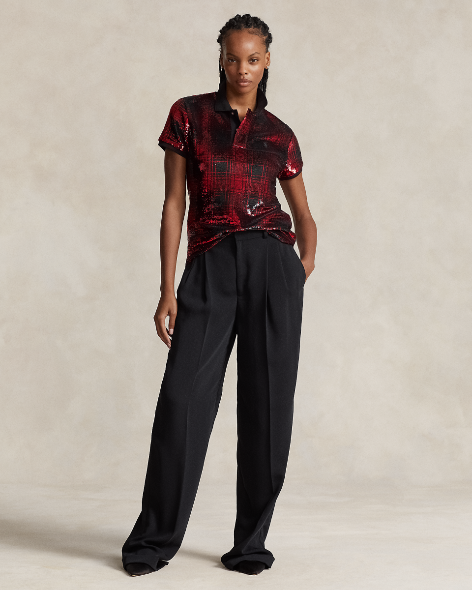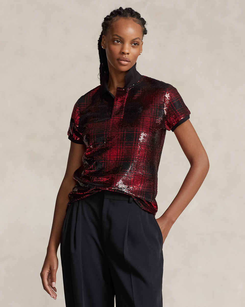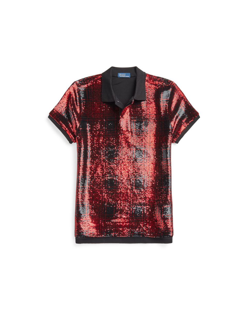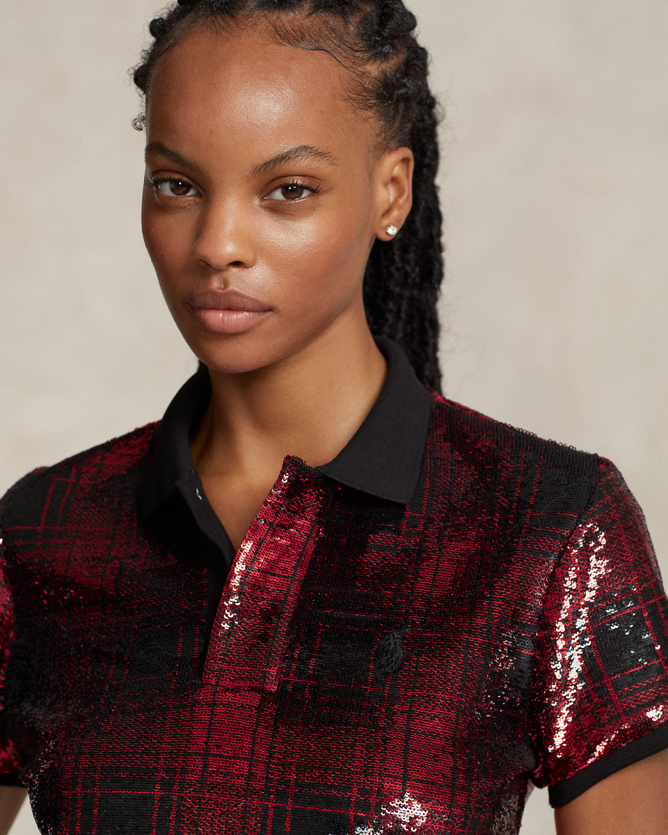 这款 Polo 衫是对经典款 Polo 衫的焕新演绎,饰有格纹图案和精心镶嵌的亮片,打造迷人的闪亮效果