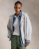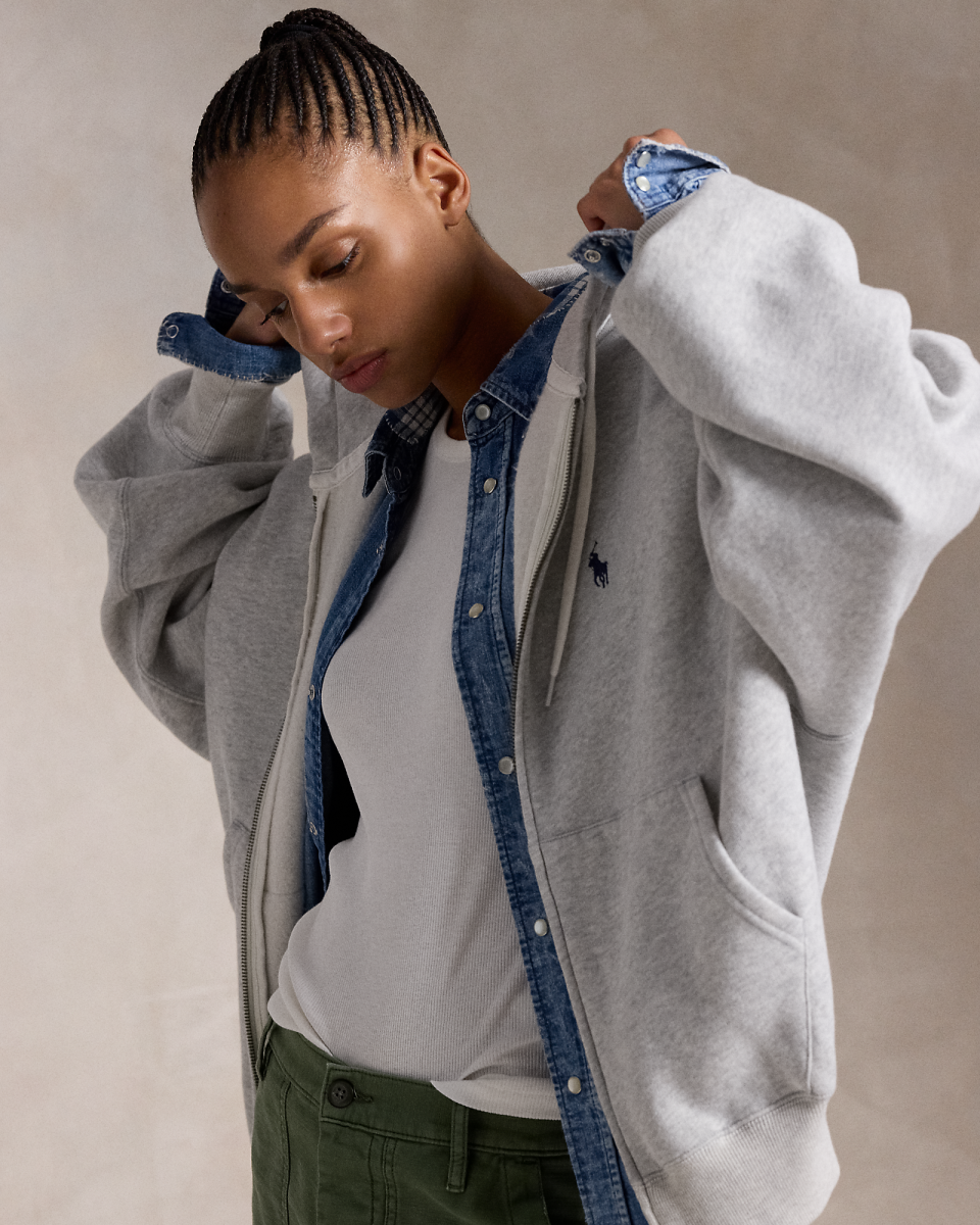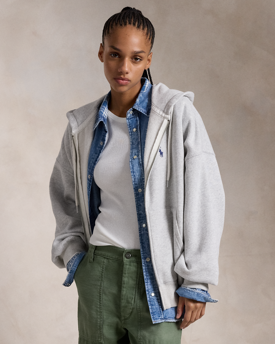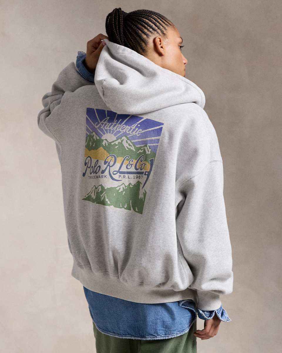 这款工作服风格起绒布拉链连帽衫采用大号版型,背面印有山脉图案与我们的标志性徽标