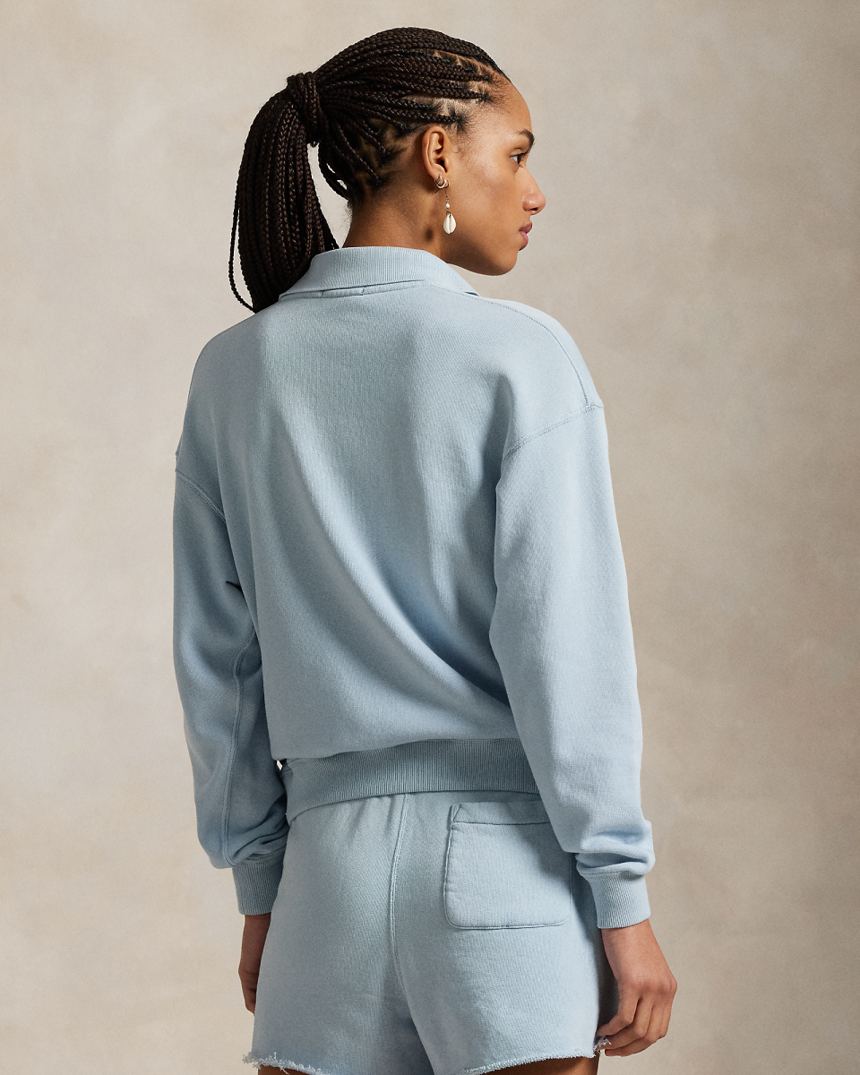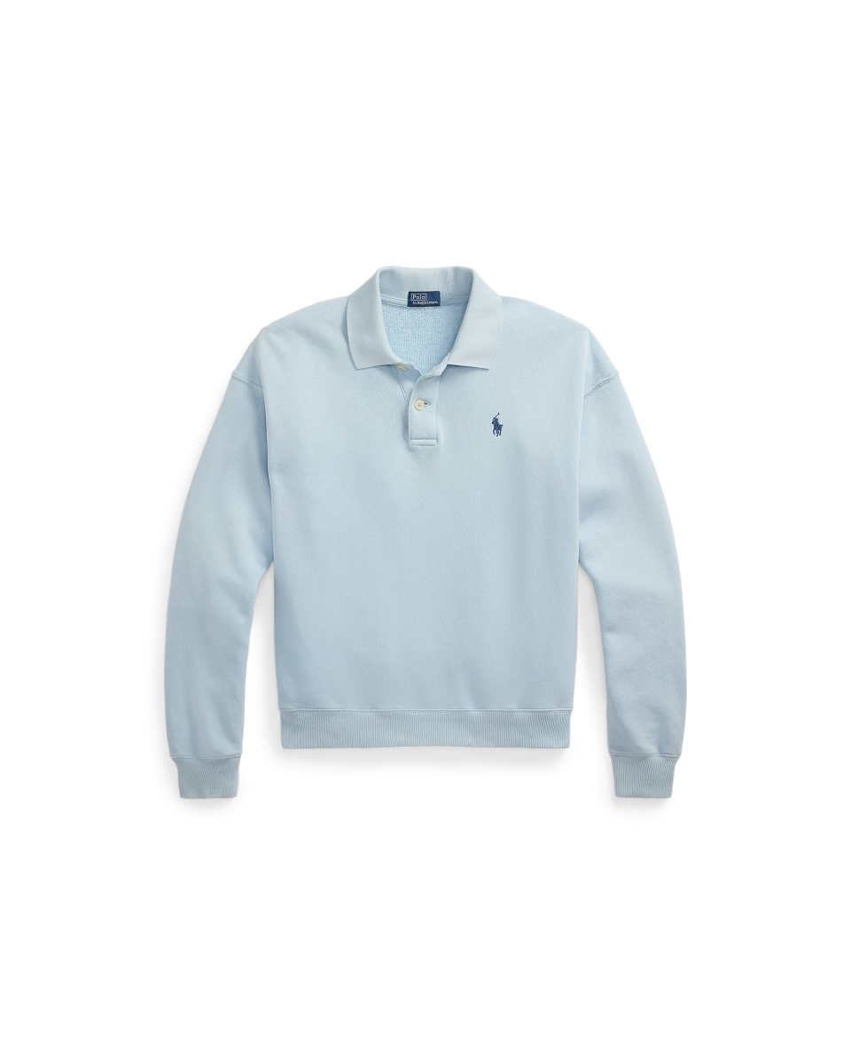 这款轻盈的 Polo 衫配有平针衣领、双纽衣襟和小马刺绣等标志性细节