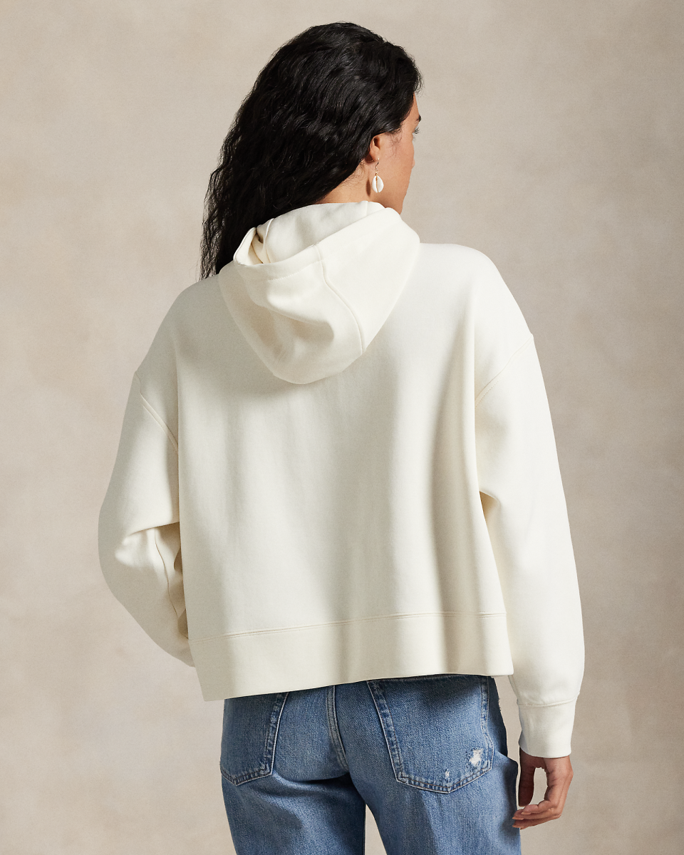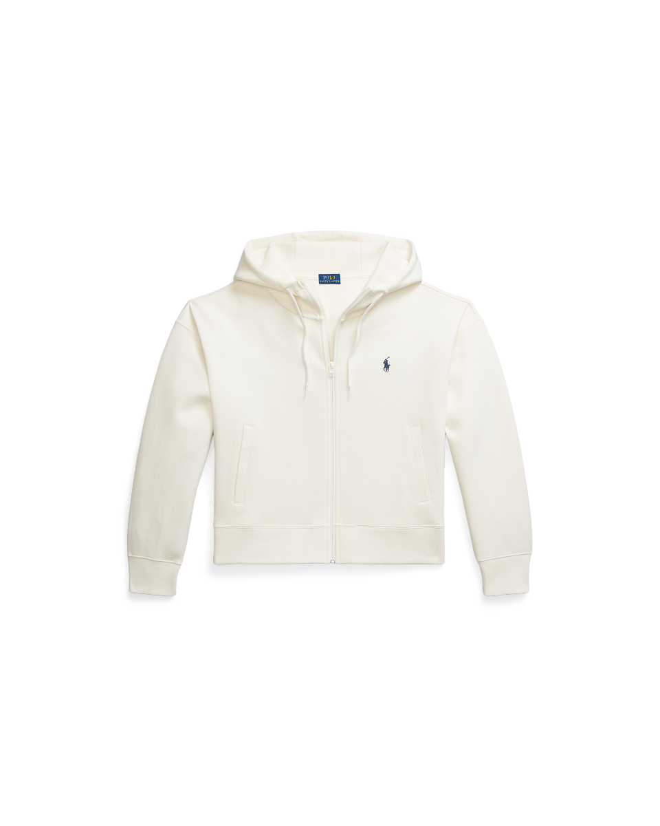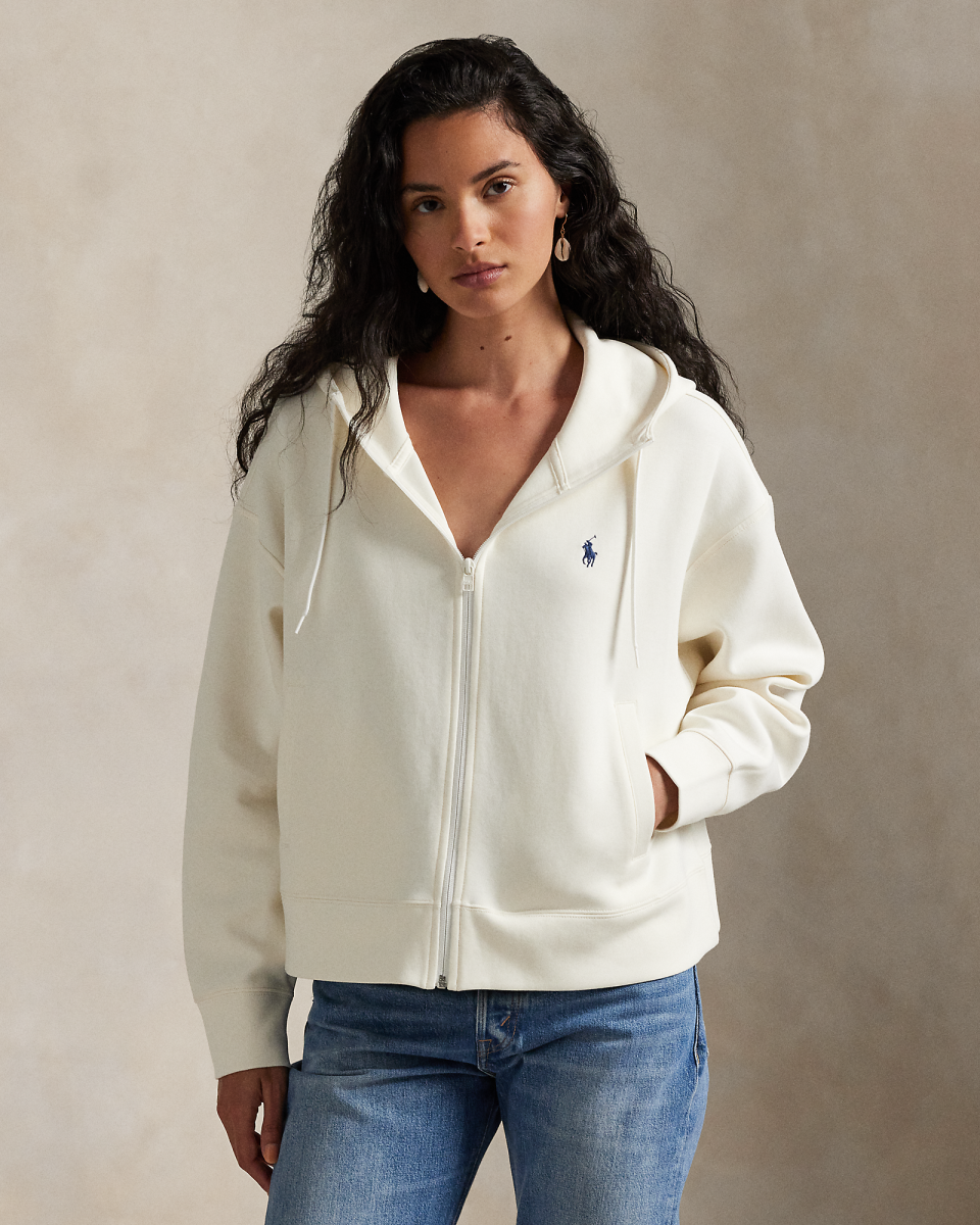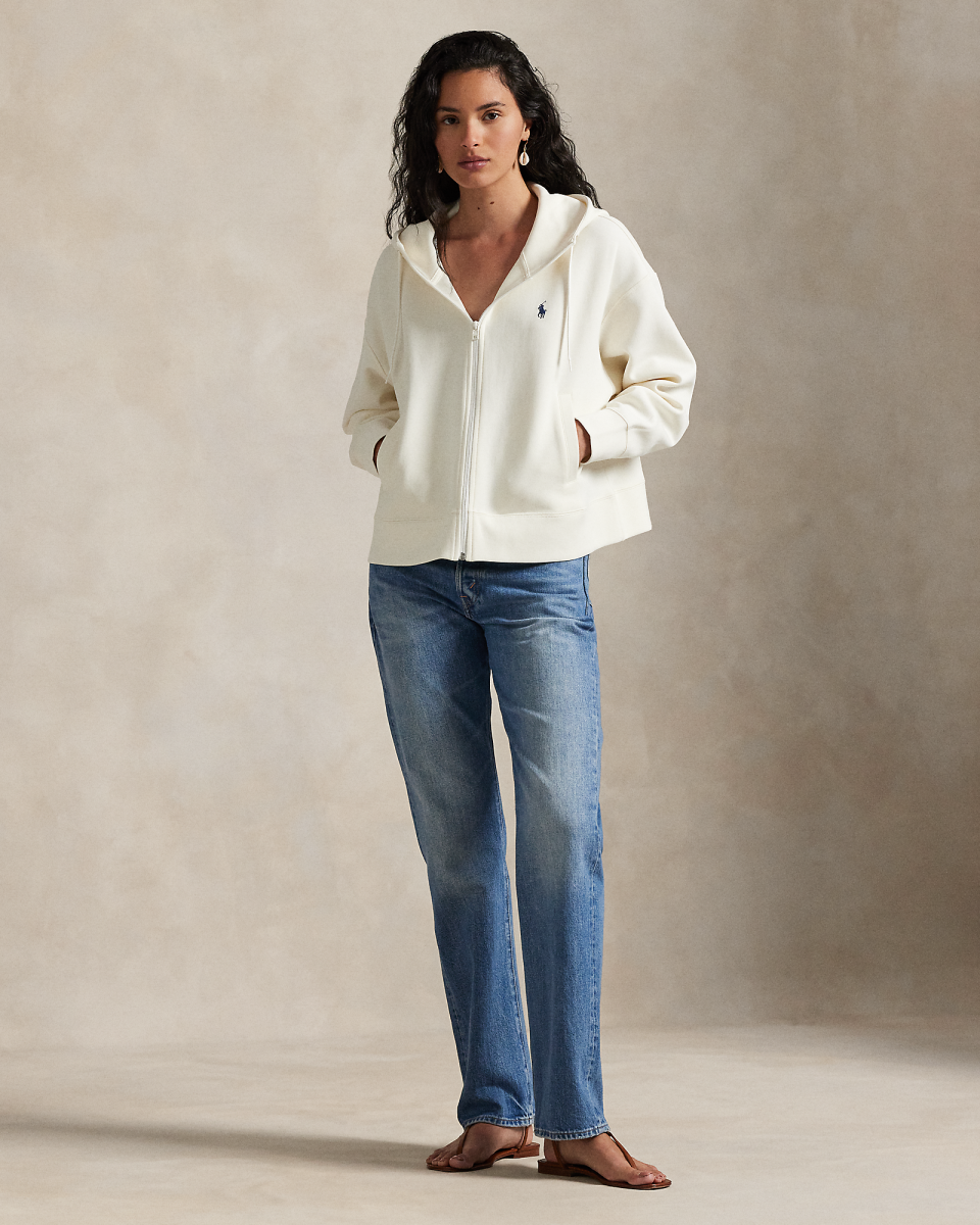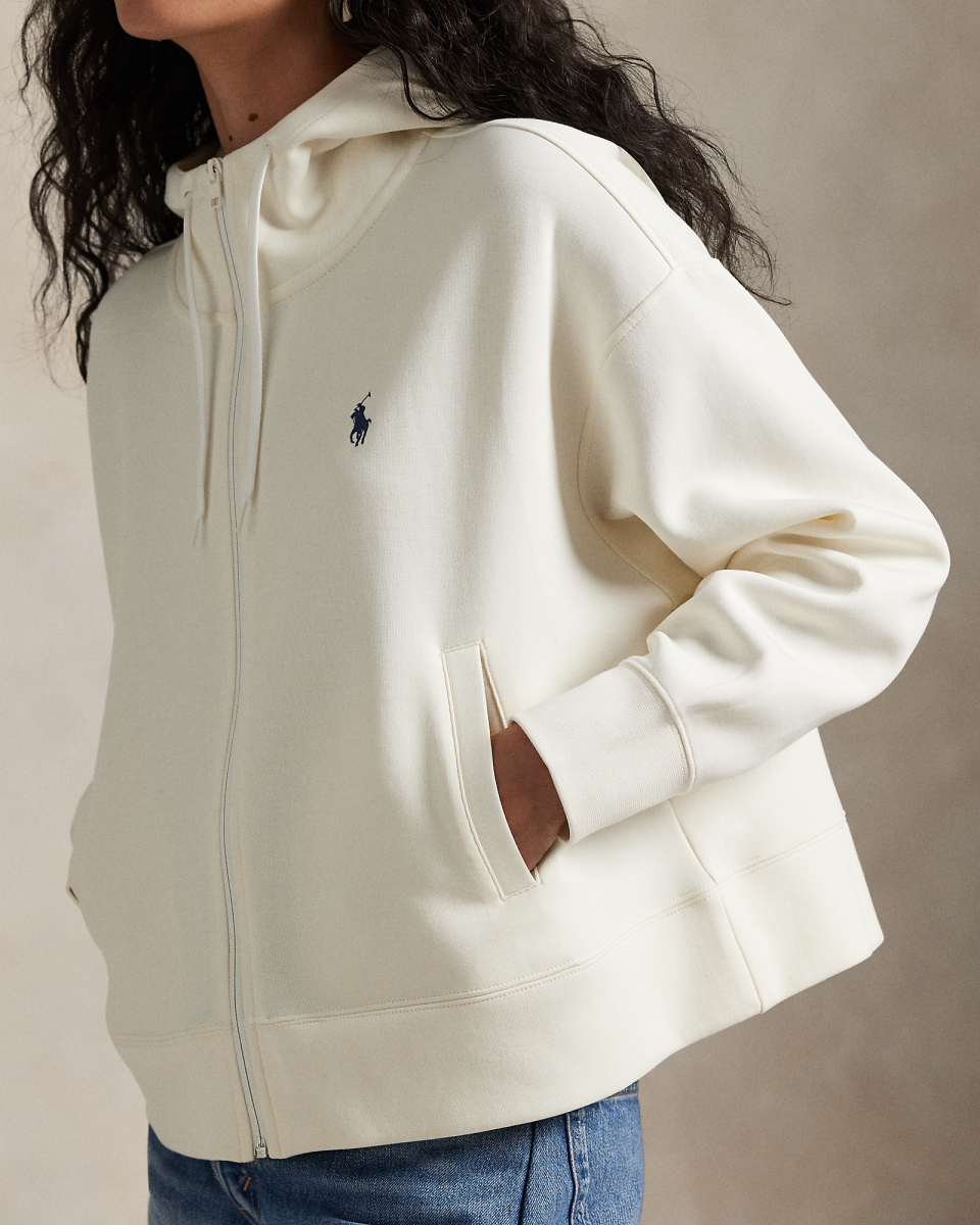 这款全拉链针织开襟衫选用双面针织提花布制成,采用宽松廓形,搭配高领和抽绳风帽,胸前饰有标志性小马刺绣