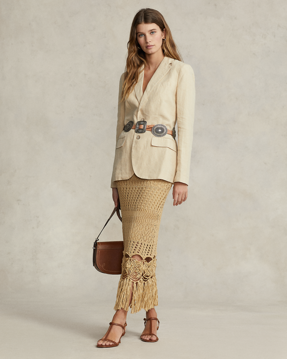这款两粒扣西装外套剪裁考究,衣身宽松,臀部修身。外层选用轻盈的面料制成,适合天气转暖时穿着