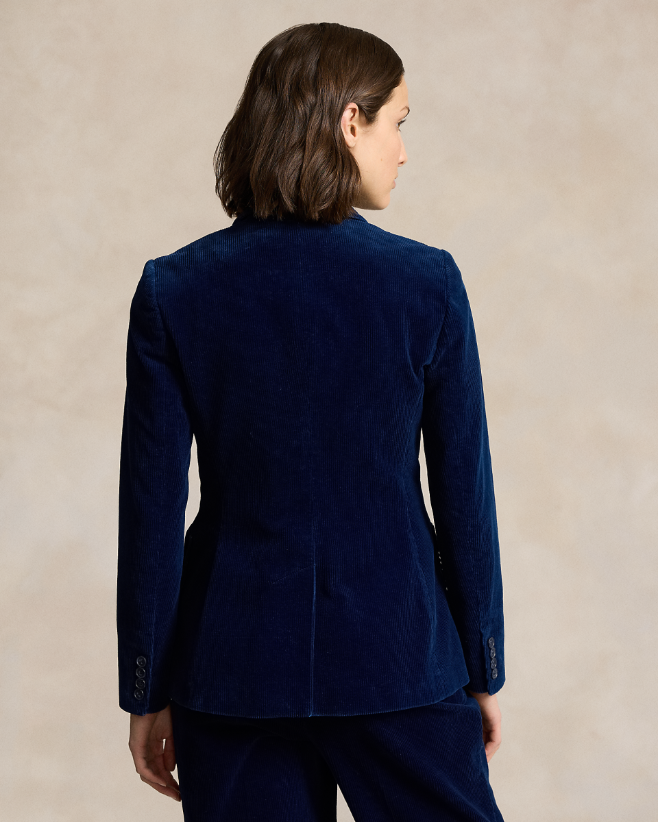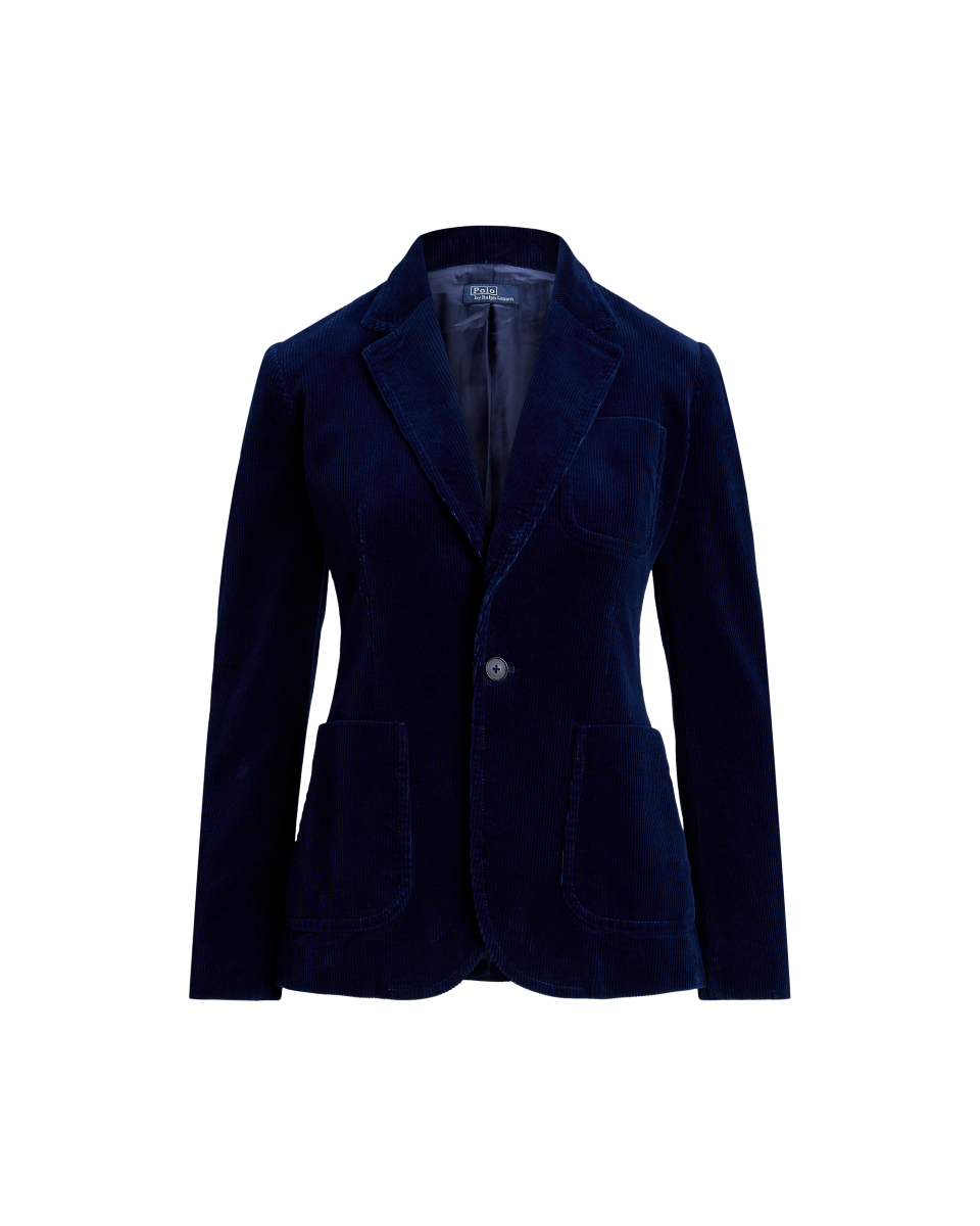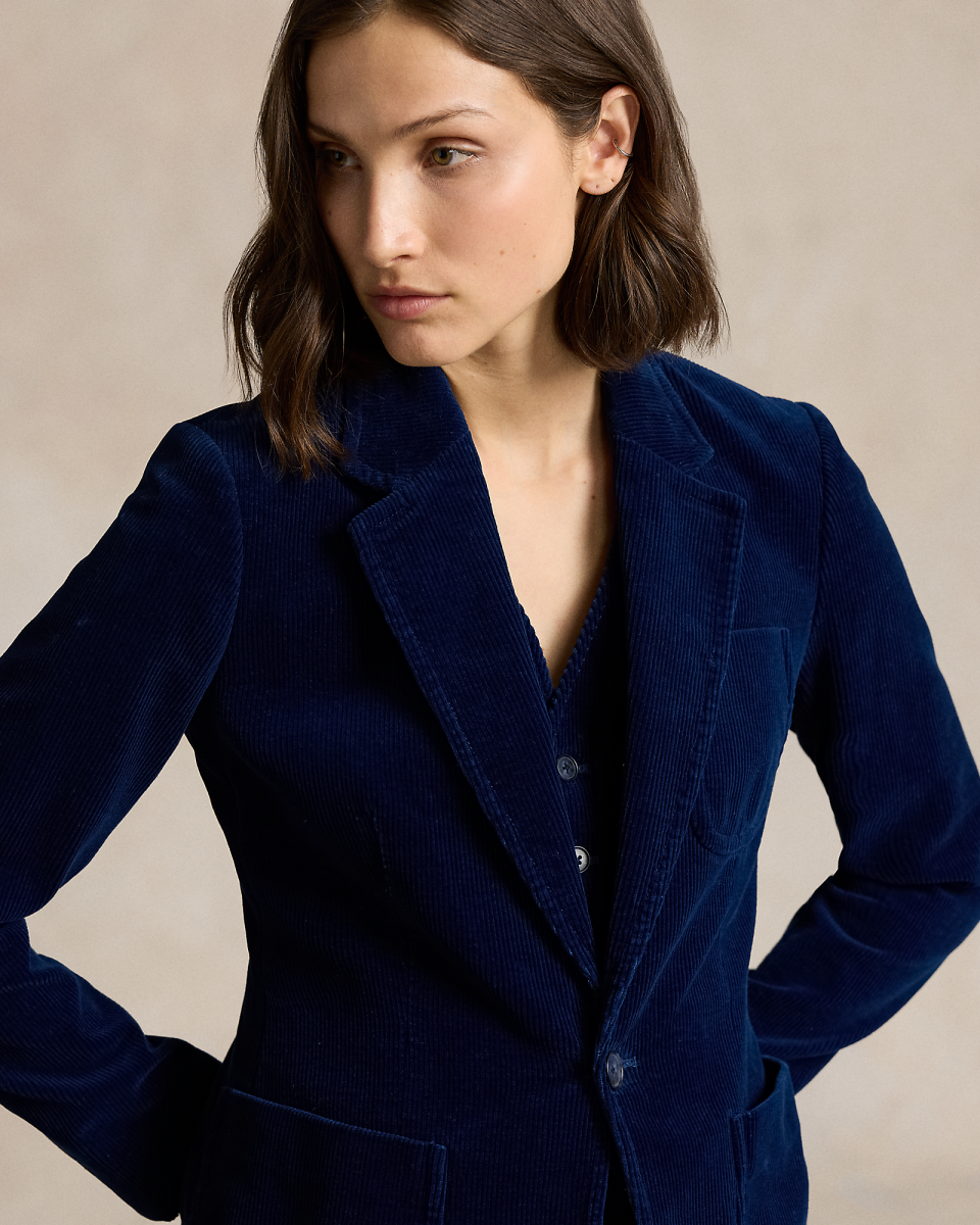 这款男装风格西装外套选用宽棱纹灯芯绒制成,采用修身版型,胸前和腰部配有贴袋
