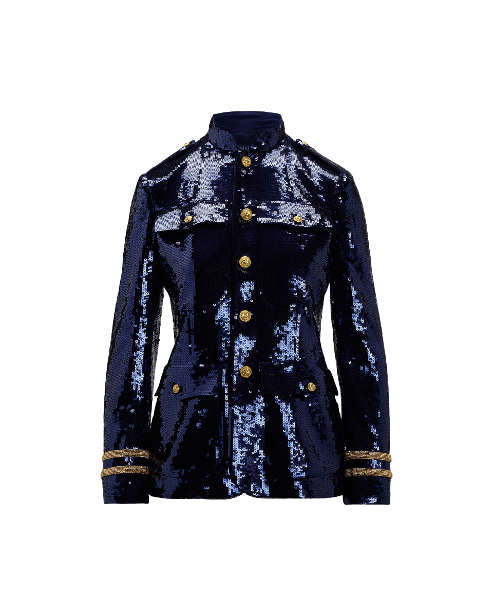 这款立领西装外套灵感源自 20 世纪 90 年代的一件典藏单品,满版饰有璀璨亮片,采用金色珠饰条纹与饰章压花纽扣等航海风格元素