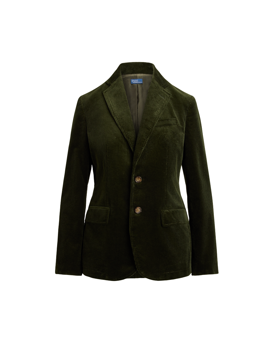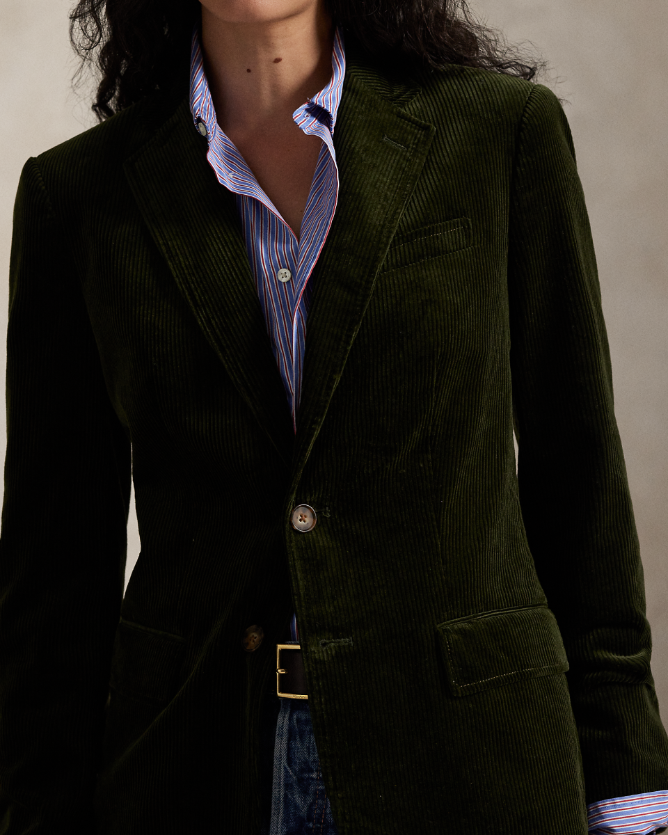 这款单排扣西装外套选用柔软的宽棱纹灯芯绒制成,采用直筒版型