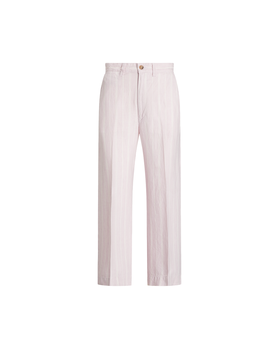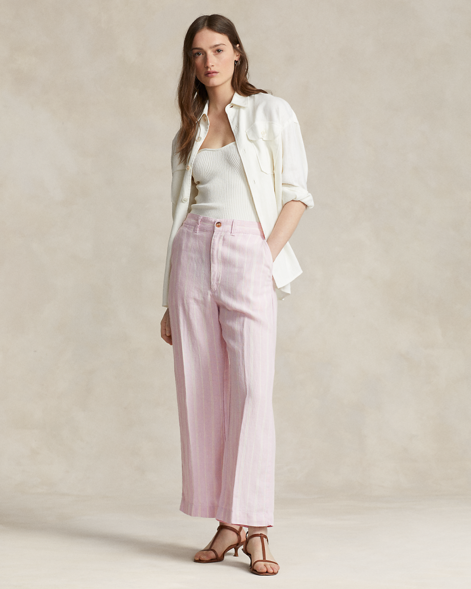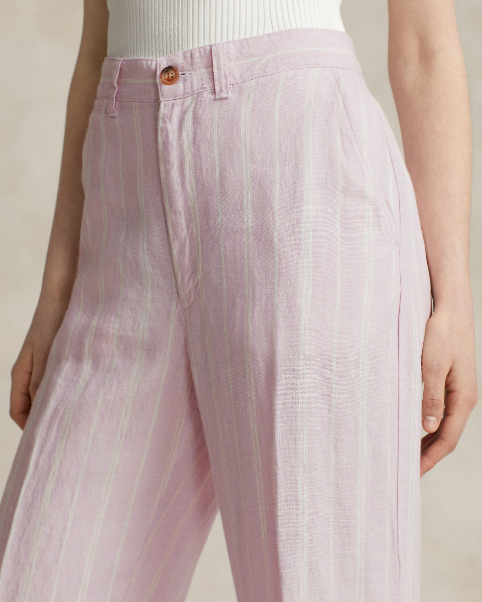 这款阔腿裤选用轻盈的亚麻面料制成,裤腿正面及背面均饰有垂直色织条纹和褶痕