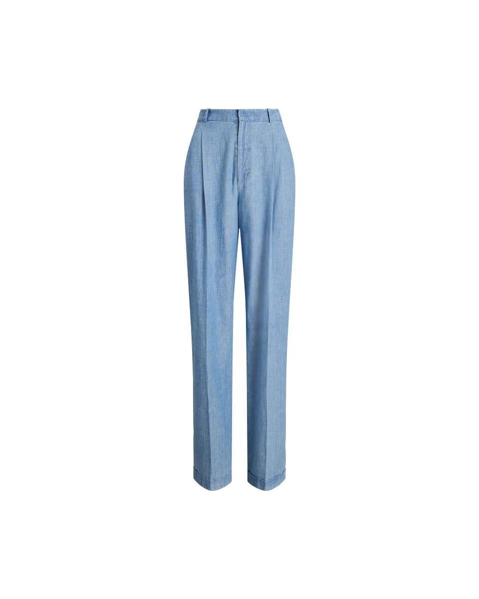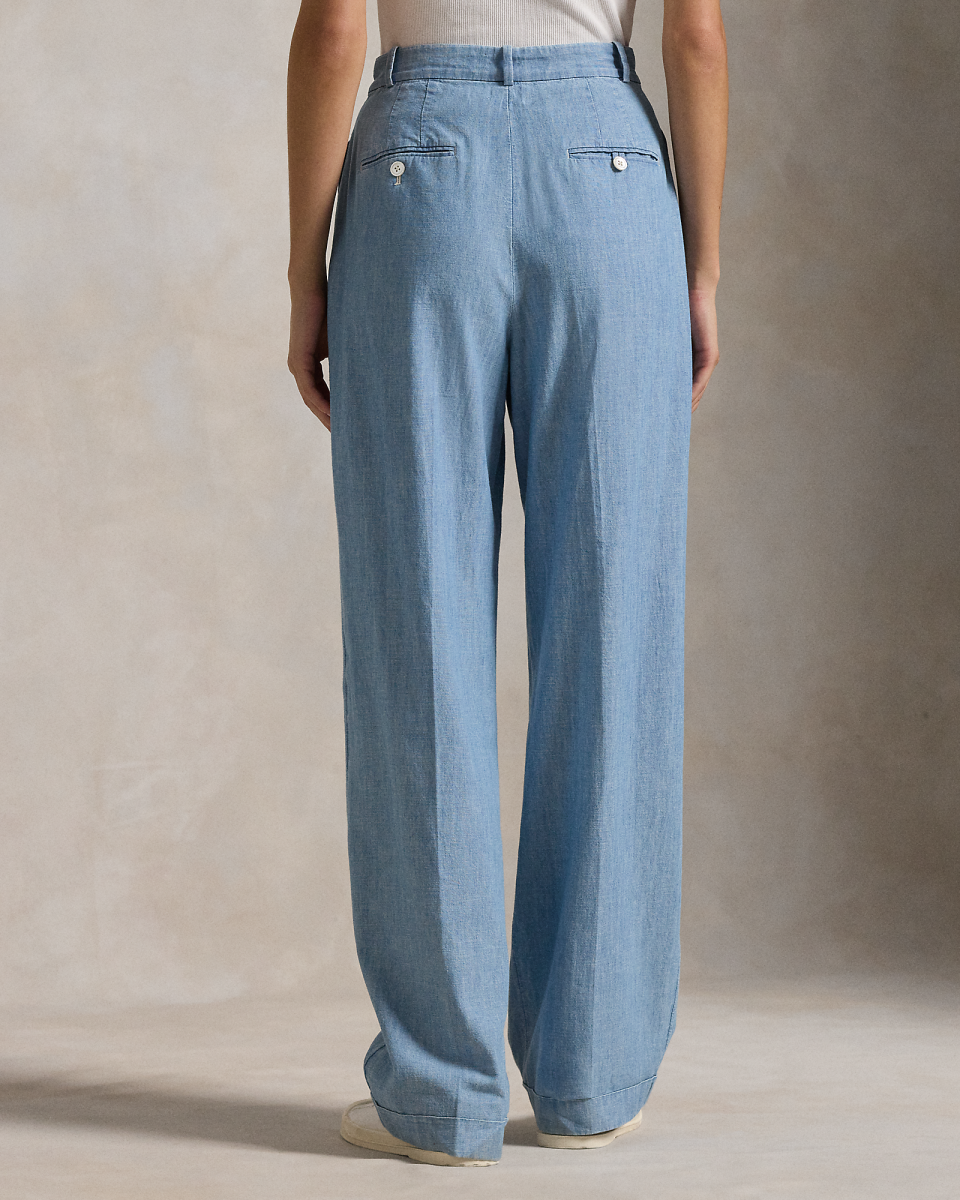 这款棉质青年布长裤采用垂顺的阔腿廓形,搭配正面腰部褶裥和利落的裤腿褶痕等男装风格细节