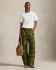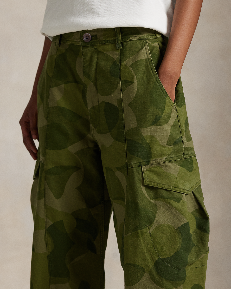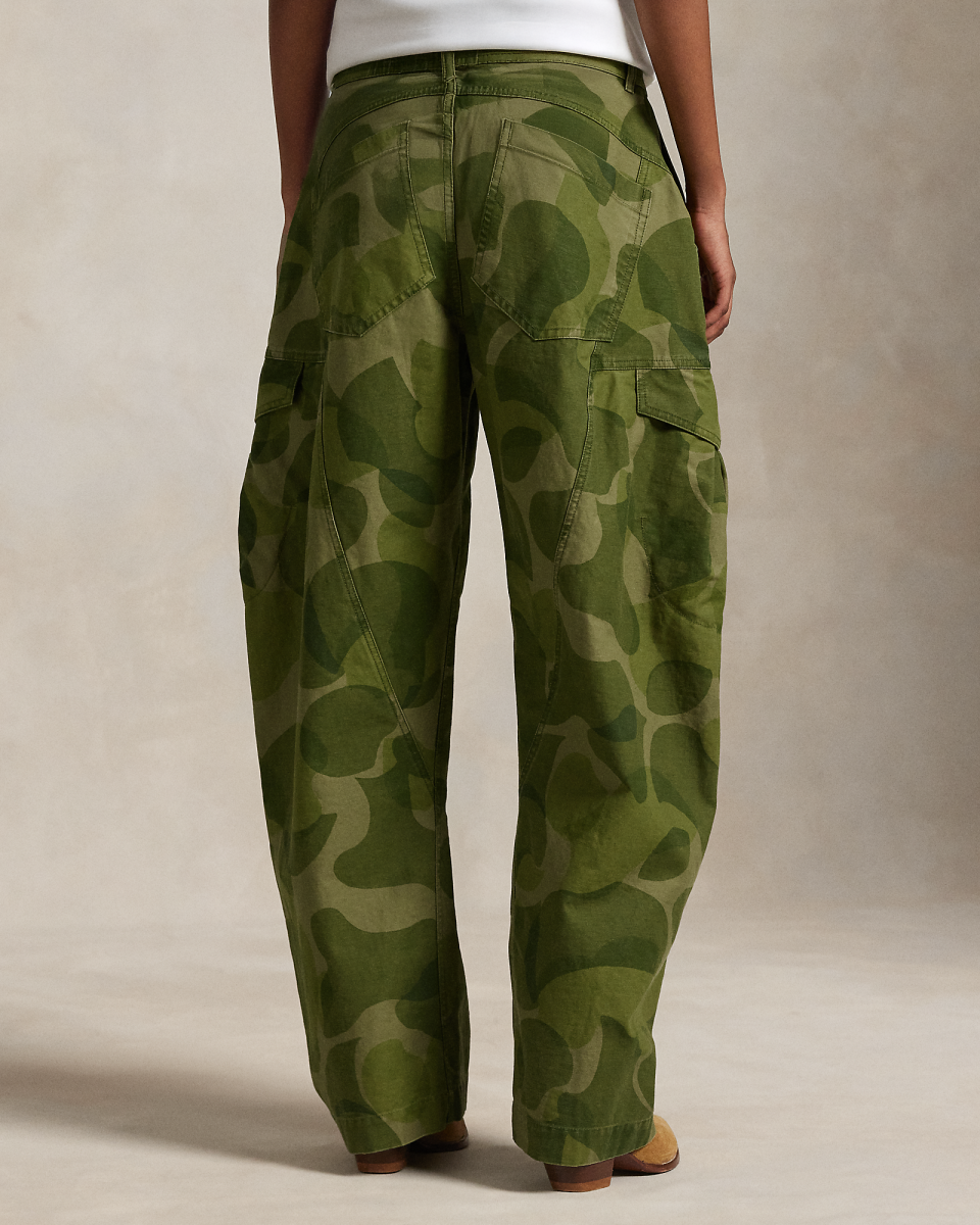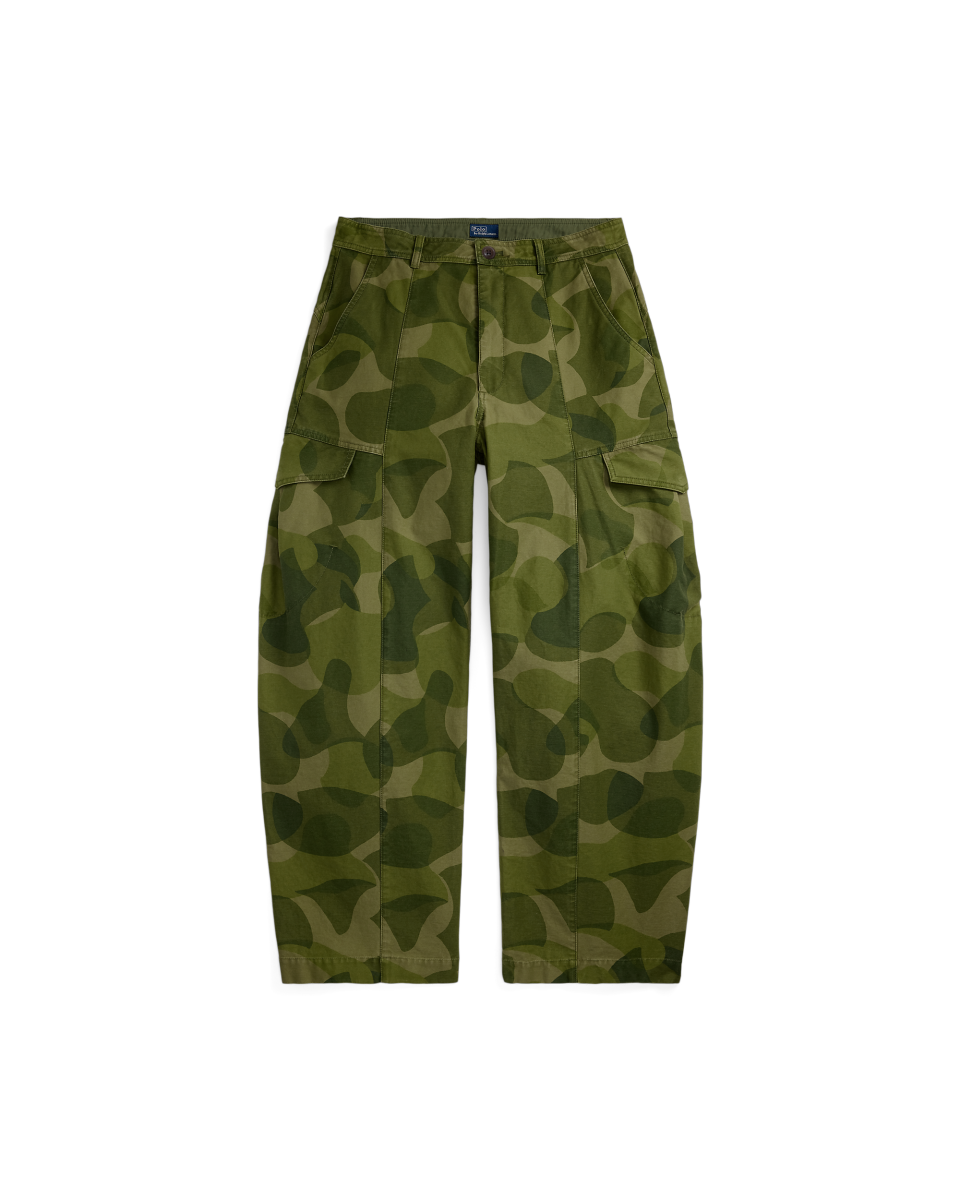 这款厚度中等的棉质工装裤采用宽松的弧形裤腿廓形,印有图案,采用拼片结构,配有户外风格口袋