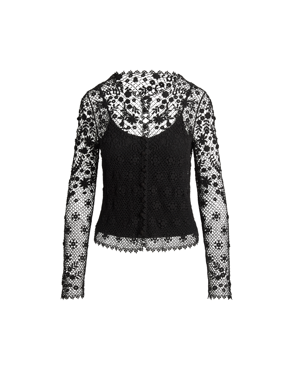 这款长袖上衣选用精美的花卉图案棉质蕾丝精心制成,配有扇形饰边和钩编纽扣式门襟,内搭修身版型针织背心,具有防透效果