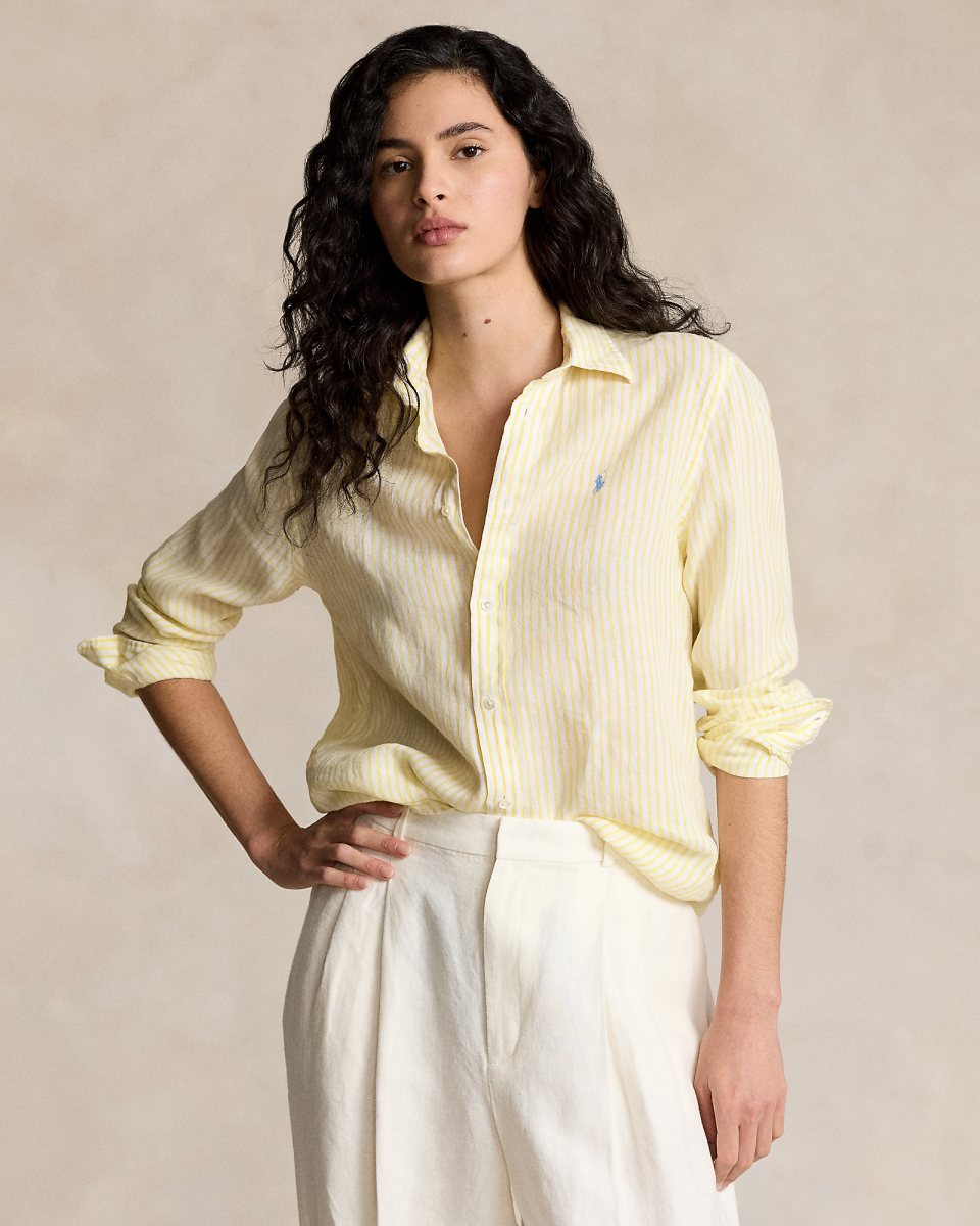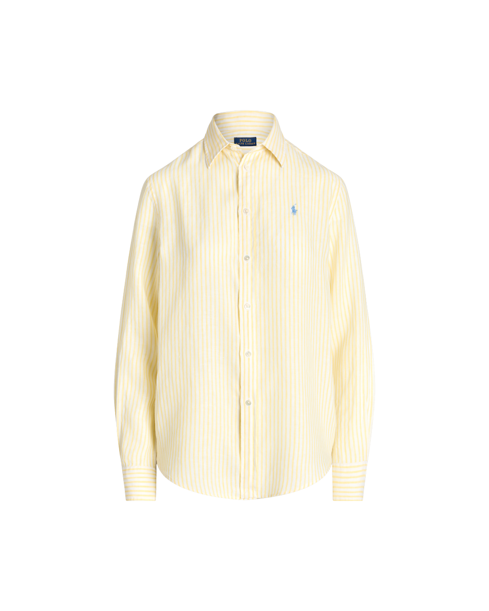 这款经典衬衫选用透气的亚麻面料制成,采用宽松廓形,饰有色织条纹,胸前饰有标志性小马刺绣
