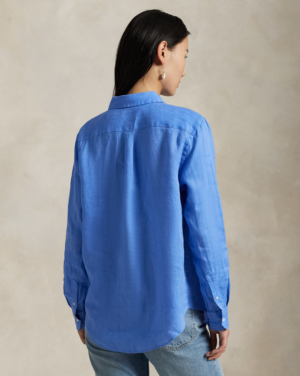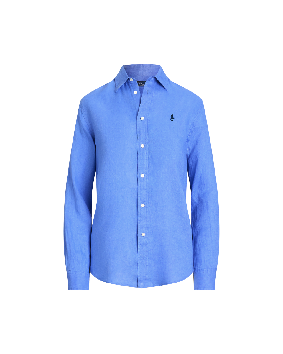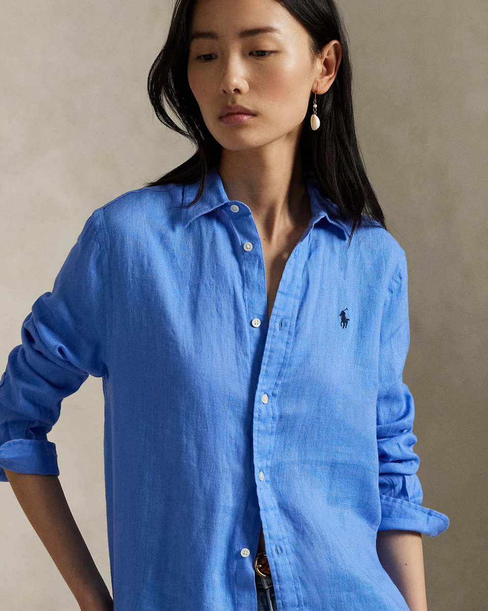 这款直筒版型衬衫选用轻盈的亚麻面料制成,饰有精美的标志性小马刺绣